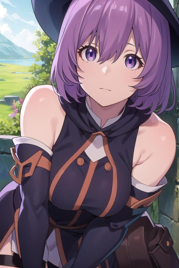 skirt, thighhighs, gloves, hat, bare shoulders, purple hair, detached sleeves, witch hat,
