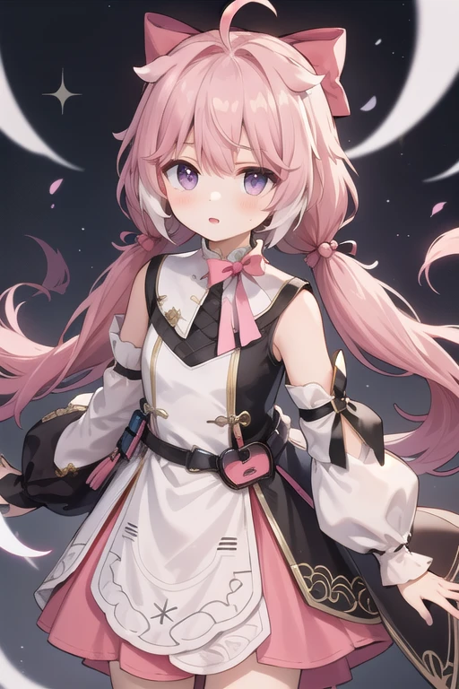 encoreDef, pink hair, low-tied long hair, hair intakes, tiwntails, ahoge, bow, hair bow, pink bow, hair ornament, dress, white dress, black dress, asymmetrical sleeves, detached sleeves, black sleeves, white sleeves, pink skirtDescription