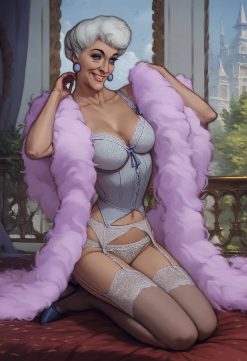 Character is "M_Adelaide, old woman, blue eyes". Main outfit is "earrings, long purple dress, brooch, feather boa". There's also "long green dress" and "Blue dress, purple hat", but the results are less consistent. Also, it seems like the brooch may bleed into images even when not specified - put it in the negative prompt if that's a problem.
