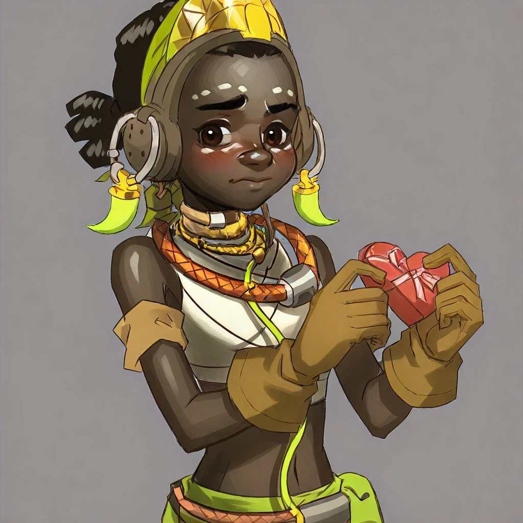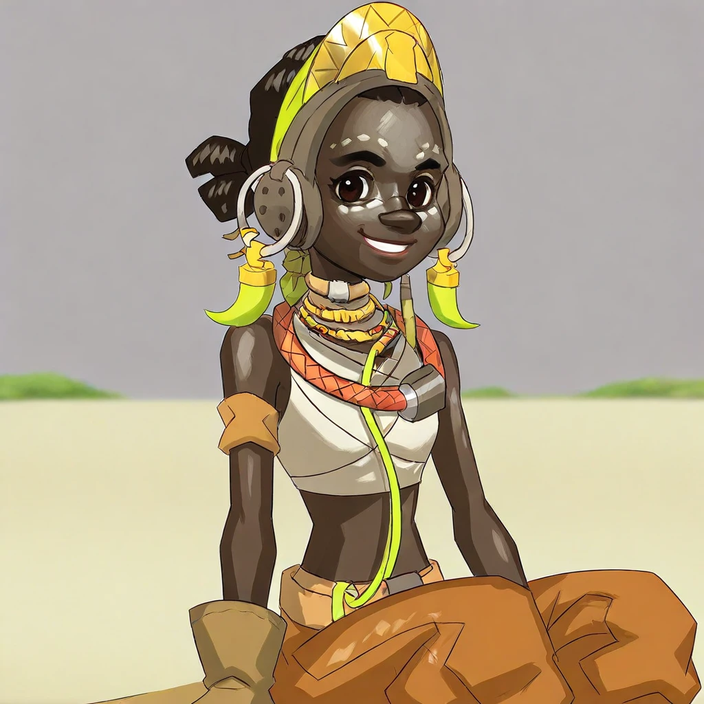 efi oladele \(overwatch\), black hair, short hair, short ponytail, brown eyes, dark-skinned female, headdress, necklaces, facial markings, crop top, armband, belt, pouches, gloves, pants, boots, 1girl, solo