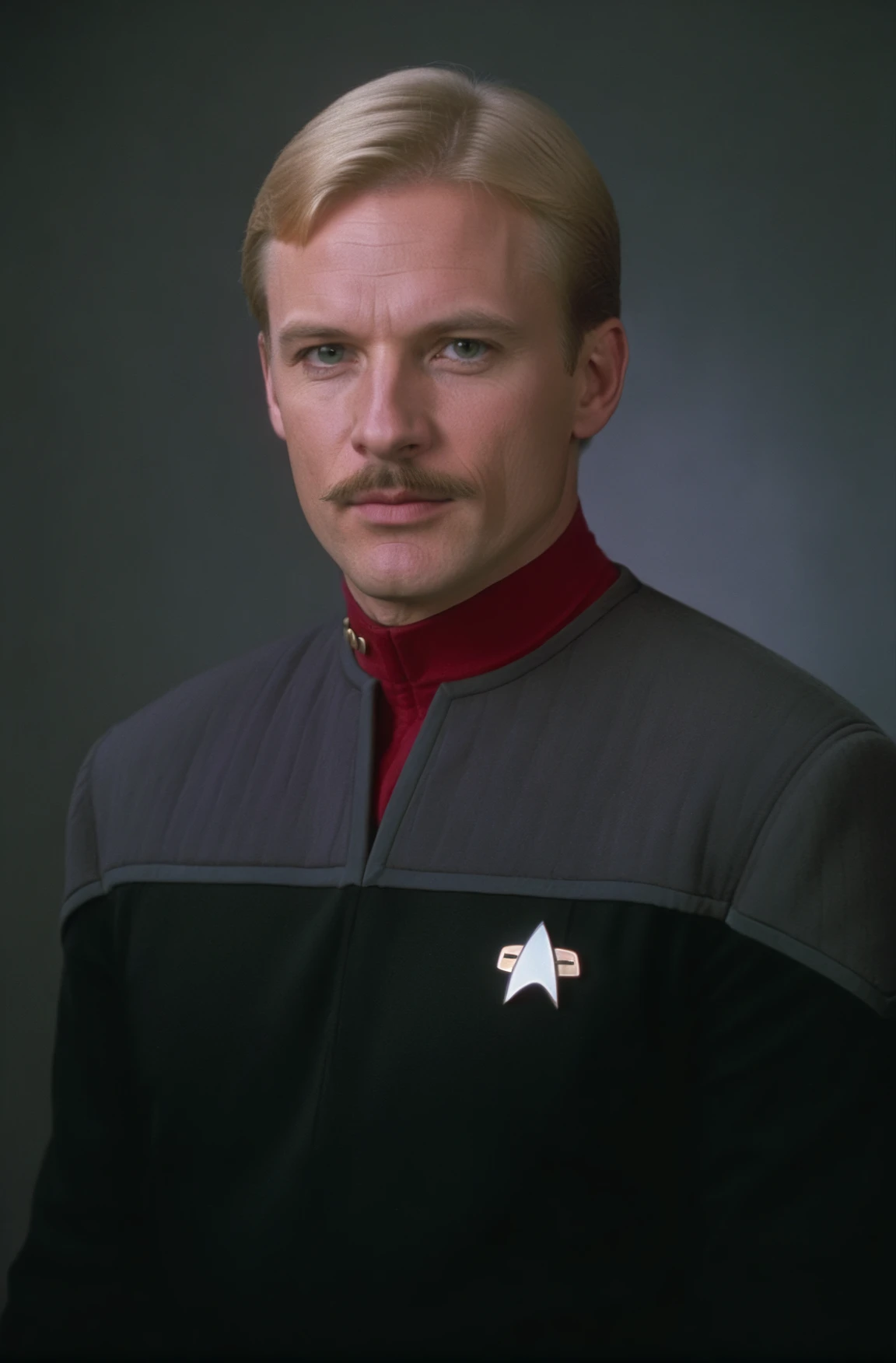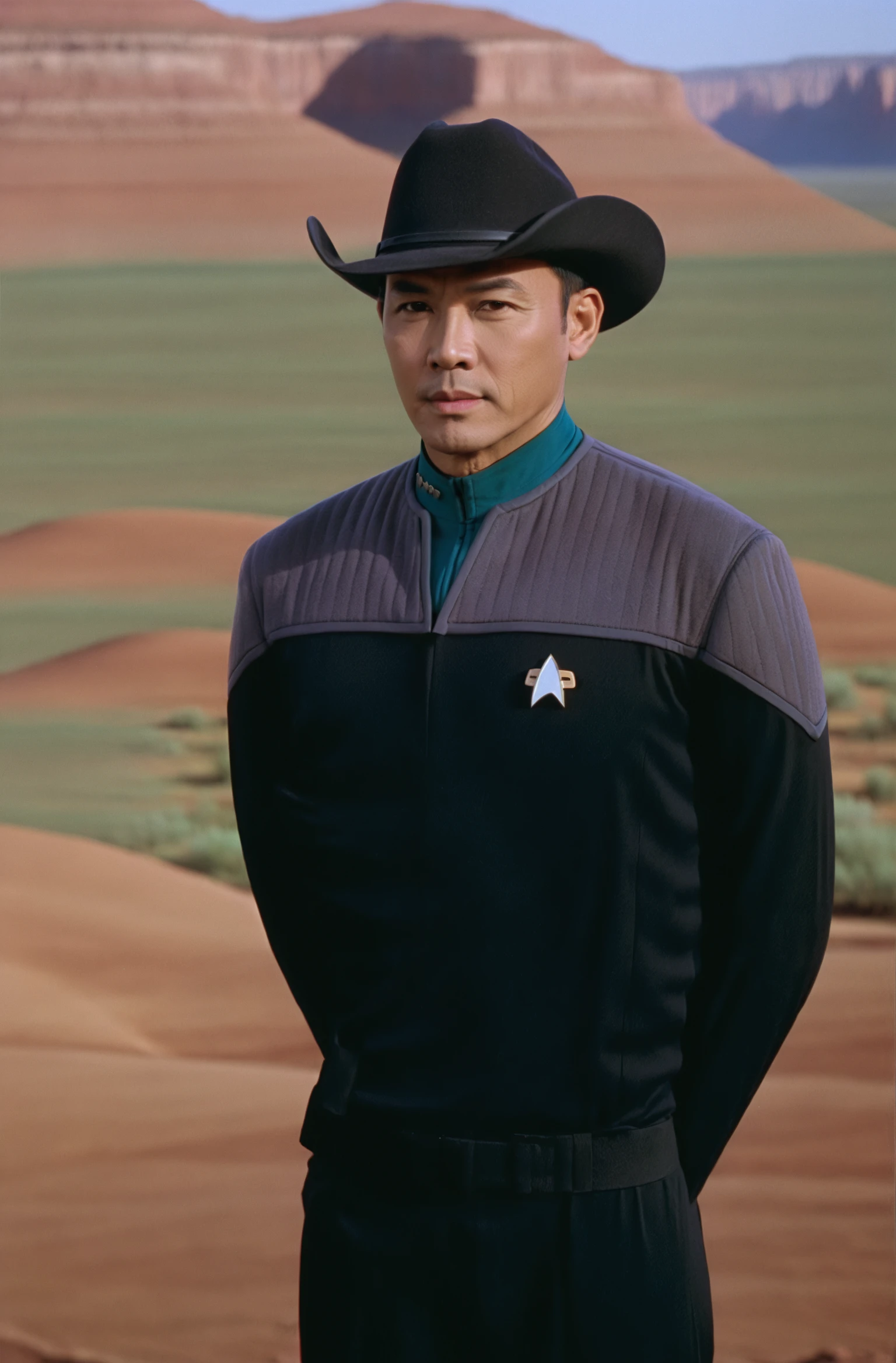 The trigger word is ds9st uniform. When you need a specific color use "black and grey ds9st uniform,teal collar","black and grey ds9st uniform,red collar" or "black and grey ds9st uniform,yellow collar".