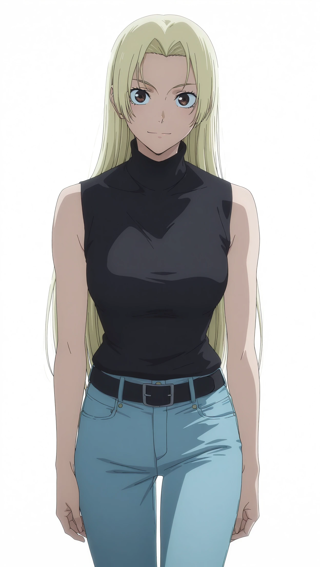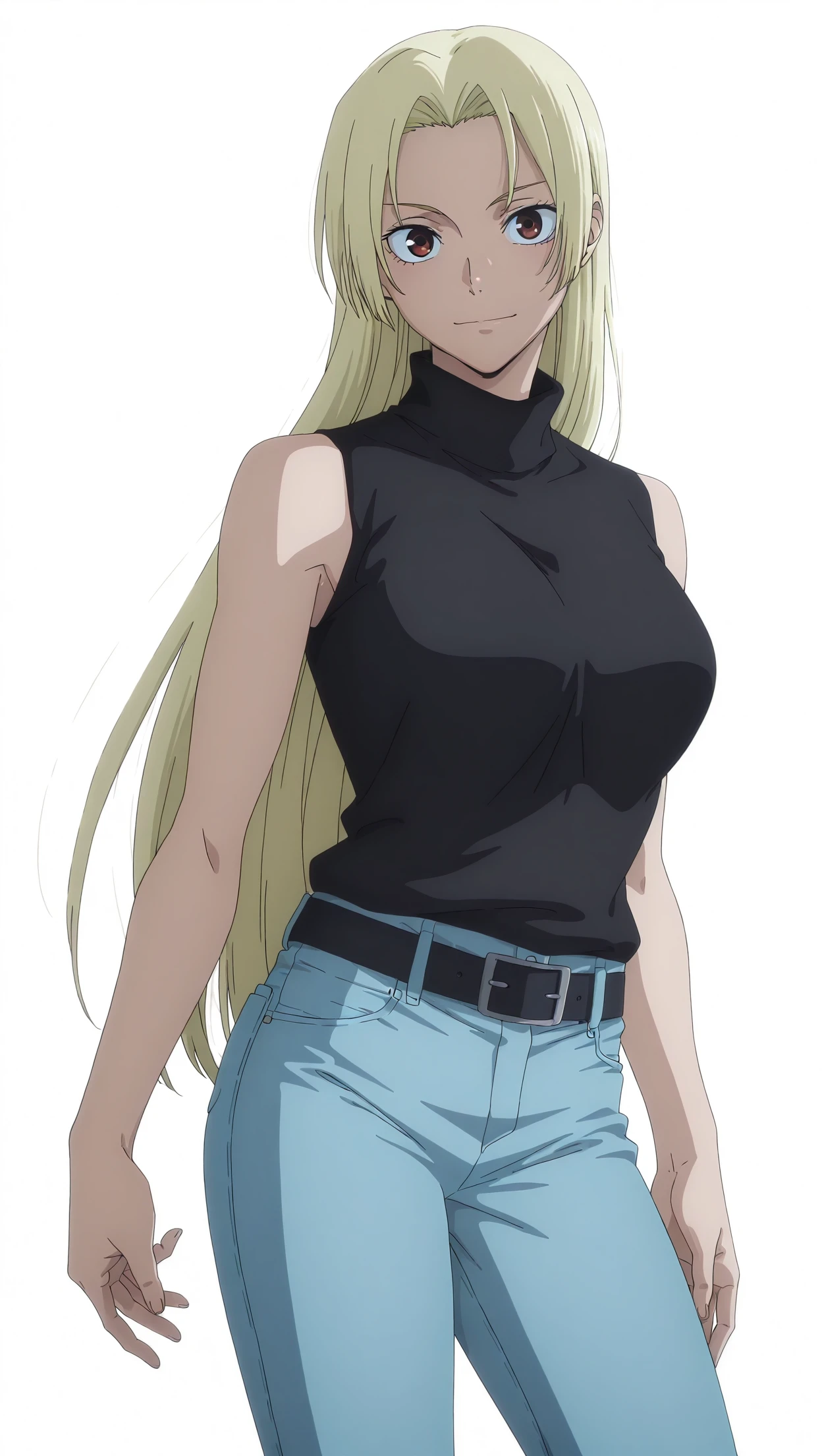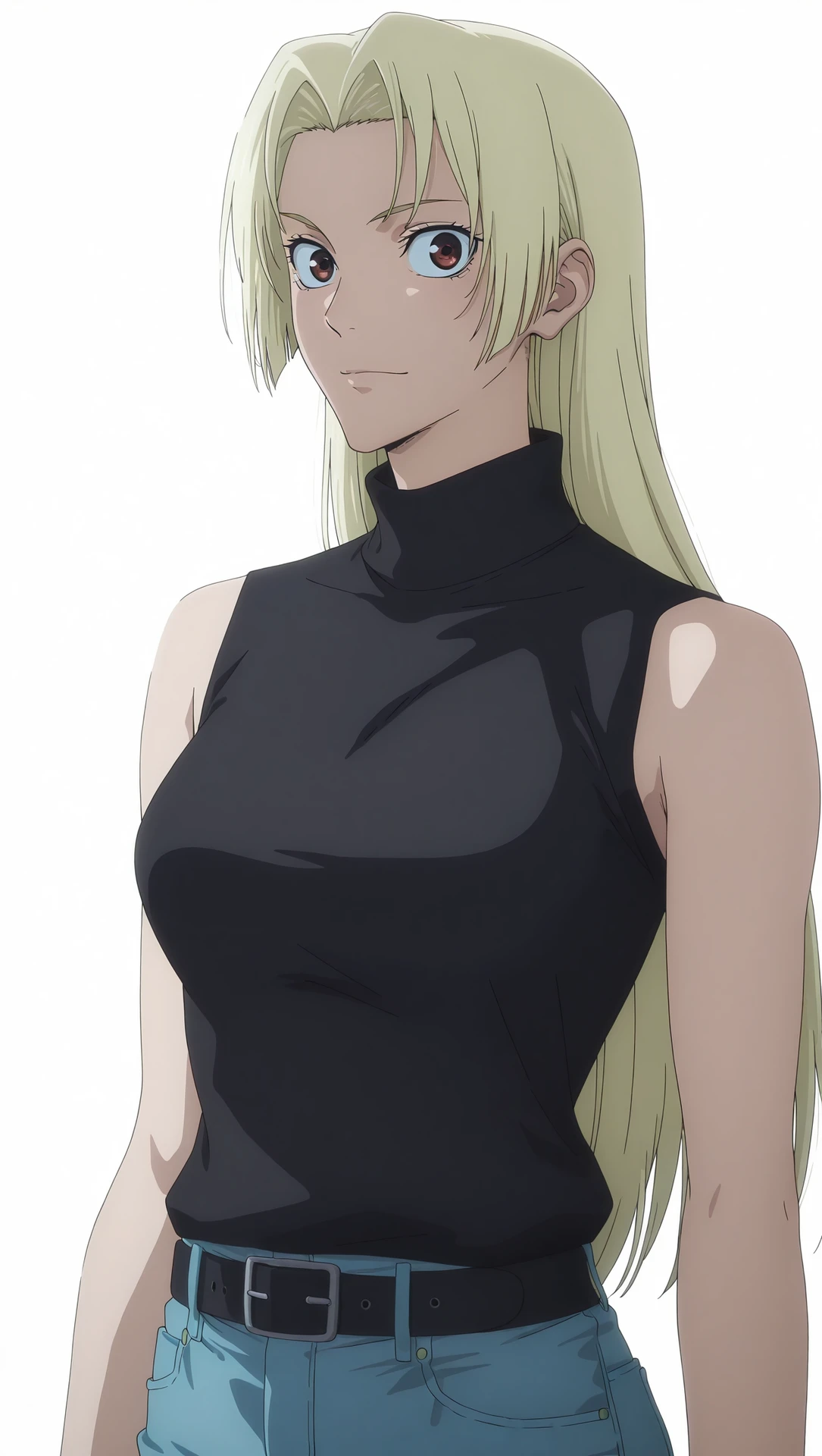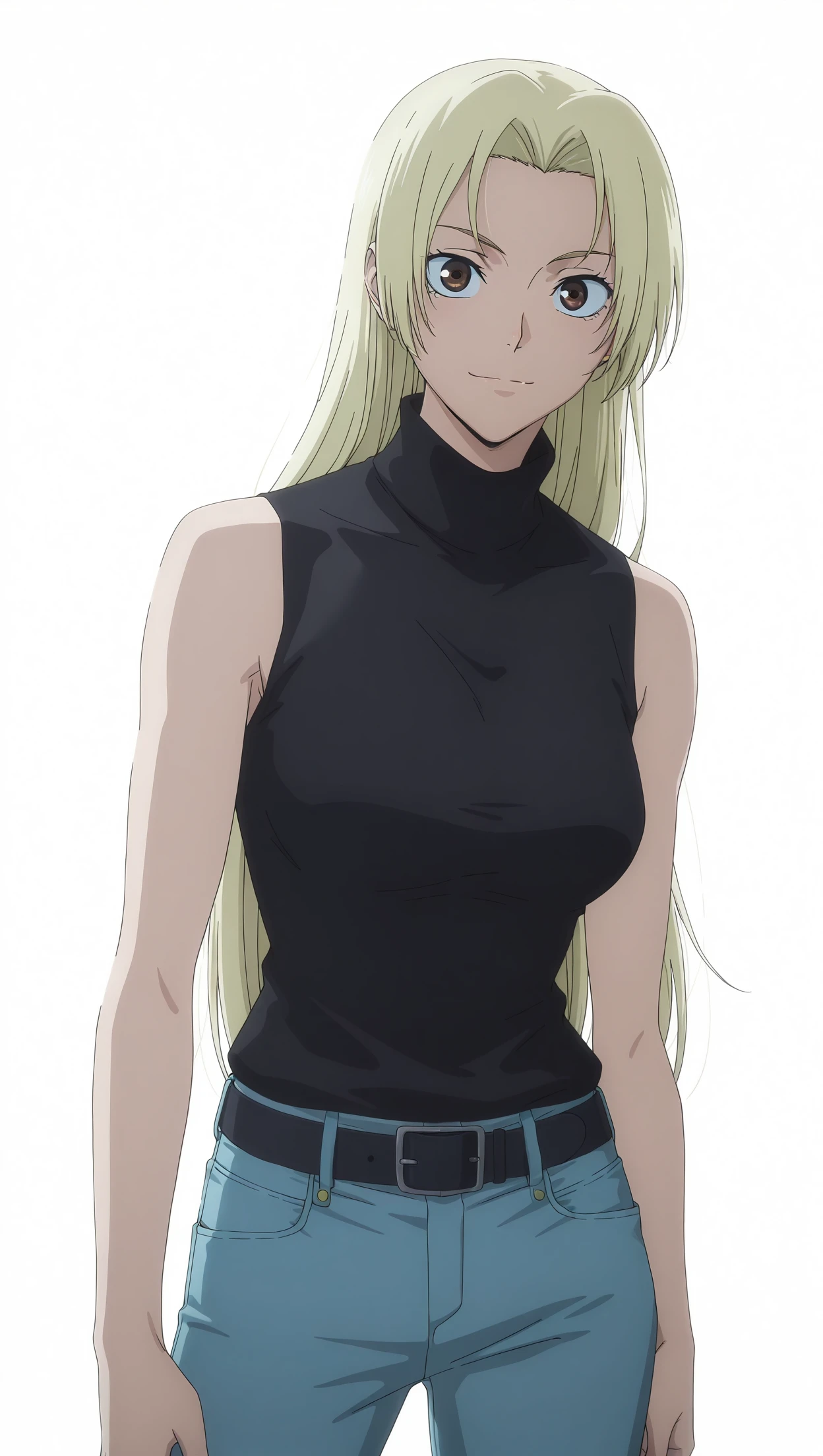 yuki, 1girl, long hair, blonde hair, brown eyes, medium breasts, pants, sleeveless turtleneck, sleeveless, turtleneck, bare shoulders, belt, jeans, denim