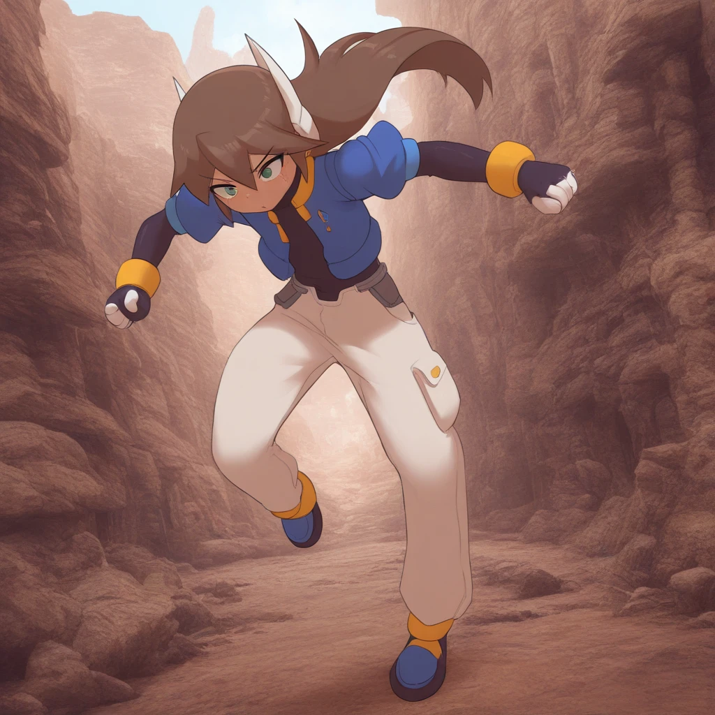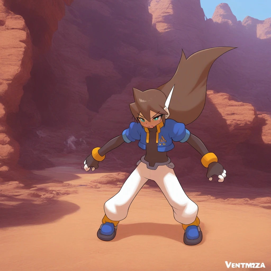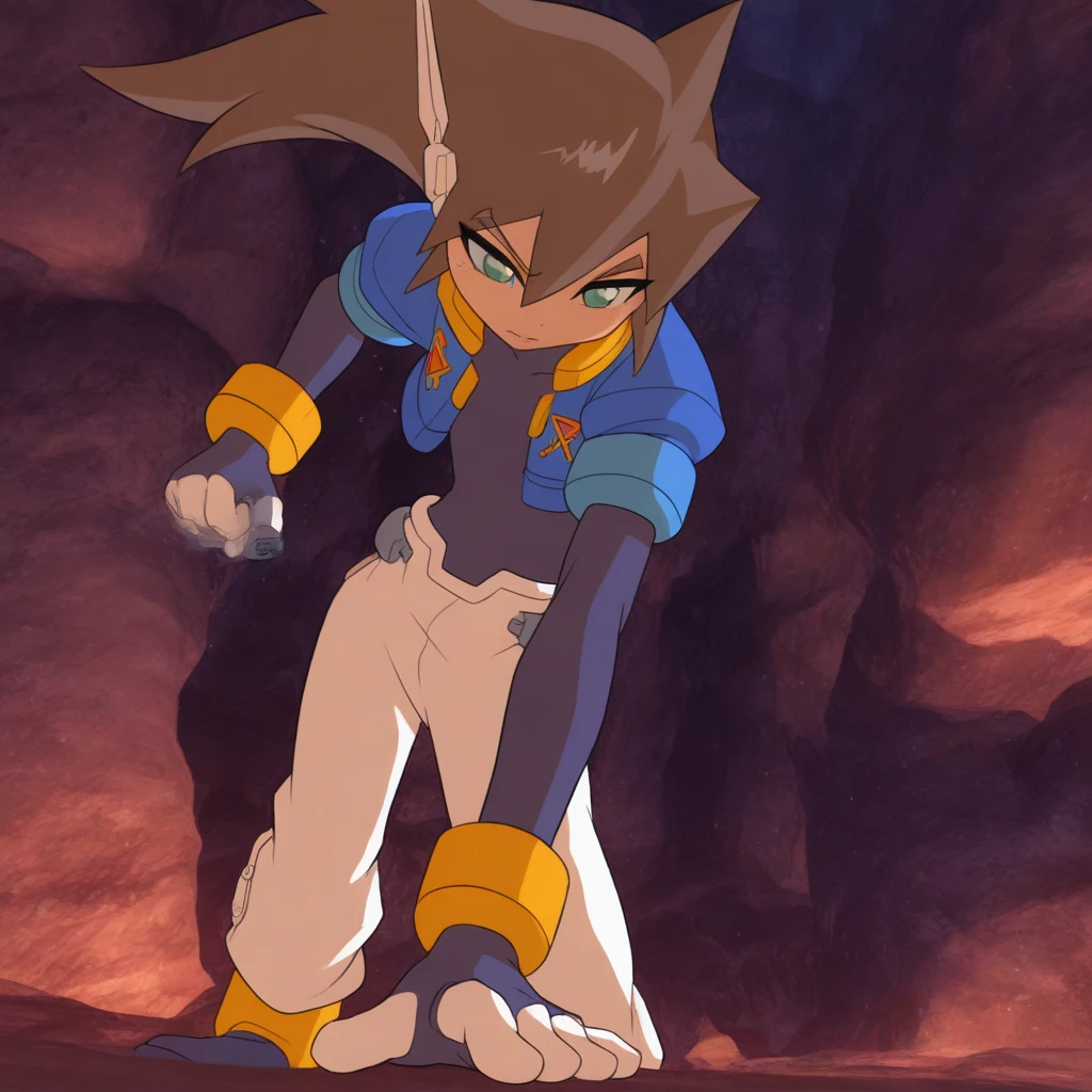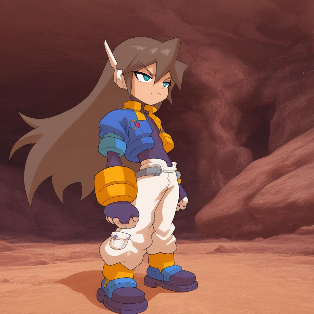 1boy, brown hair, solo, green eyes, long hair, gloves, robot ears, short sleeves, layered sleeves, spandex, short over long sleeves, cropped jacket, pants, bracelet