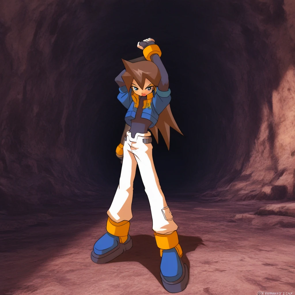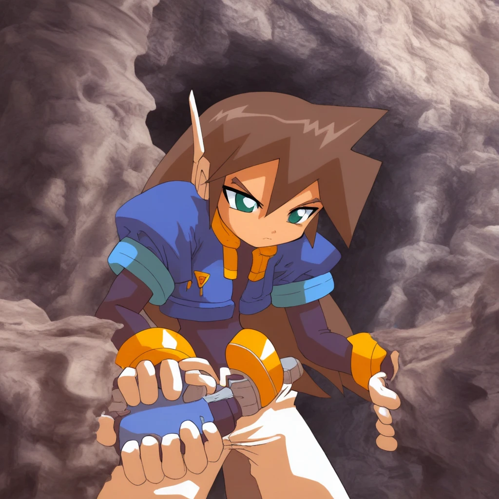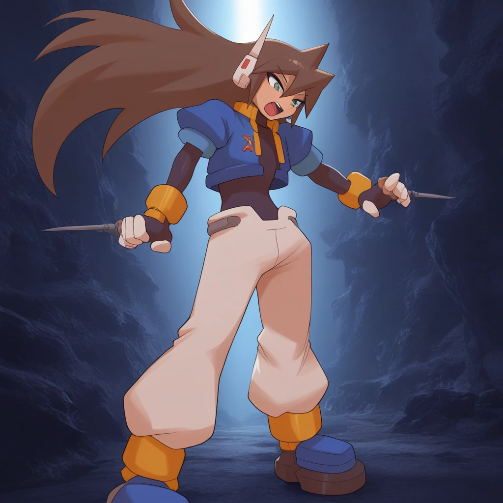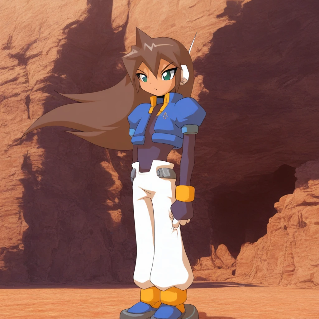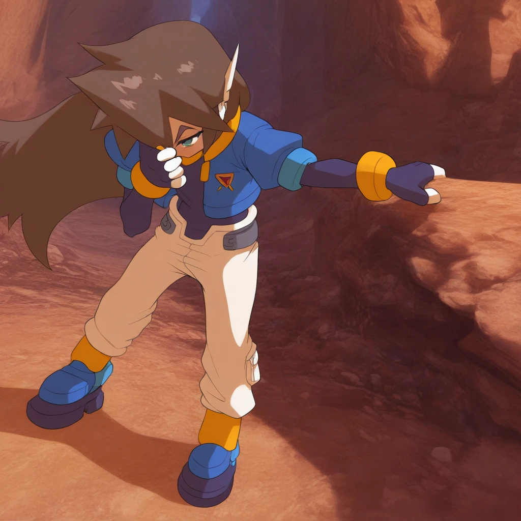 1boy, brown hair, solo, green eyes, long hair, gloves, robot ears, short sleeves, layered sleeves, spandex, short over long sleeves, cropped jacket, pants, bracelet