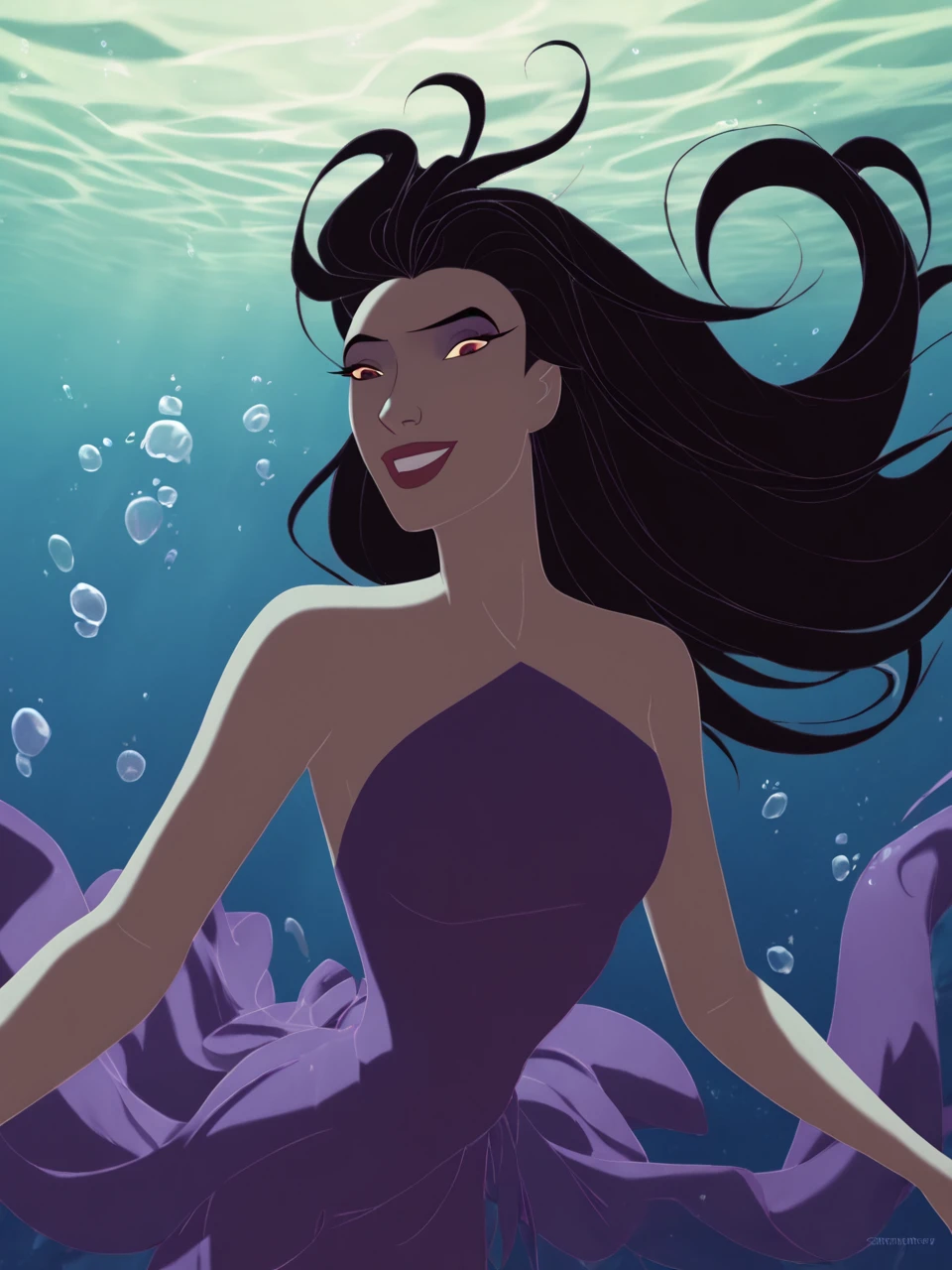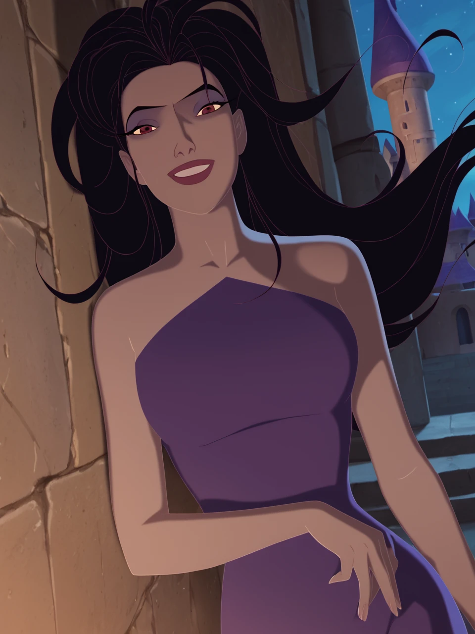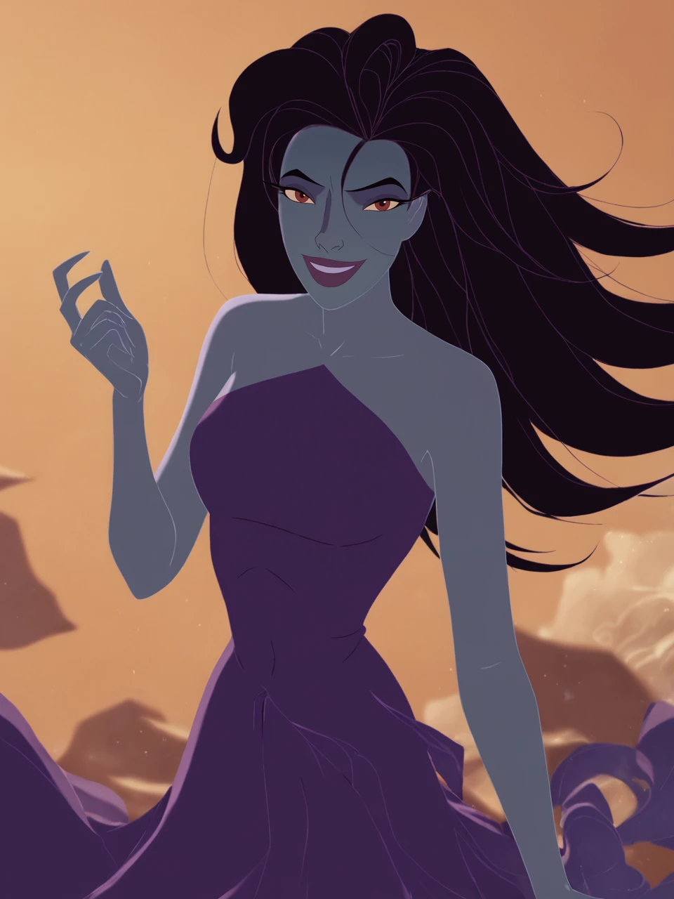 SimbEris, 1girl, solo, long hair, smile, black hair, floating hair, lipstick, makeup, bare shoulders, purple dress,