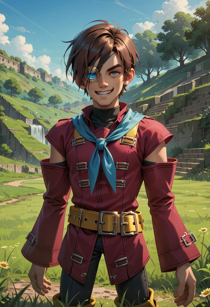 vize,solo,brown hair,smile,belt,blue eyes,neckerchief,male focus,freckles,1boy,short hair,detached sleeves,knee boots