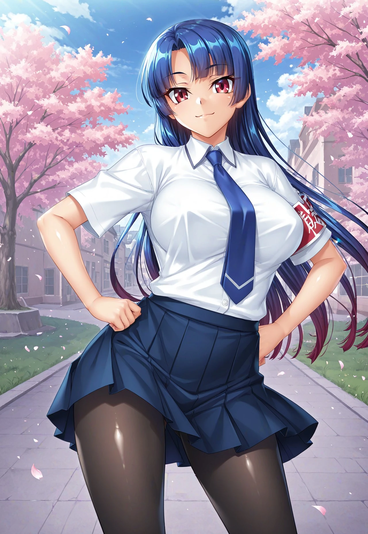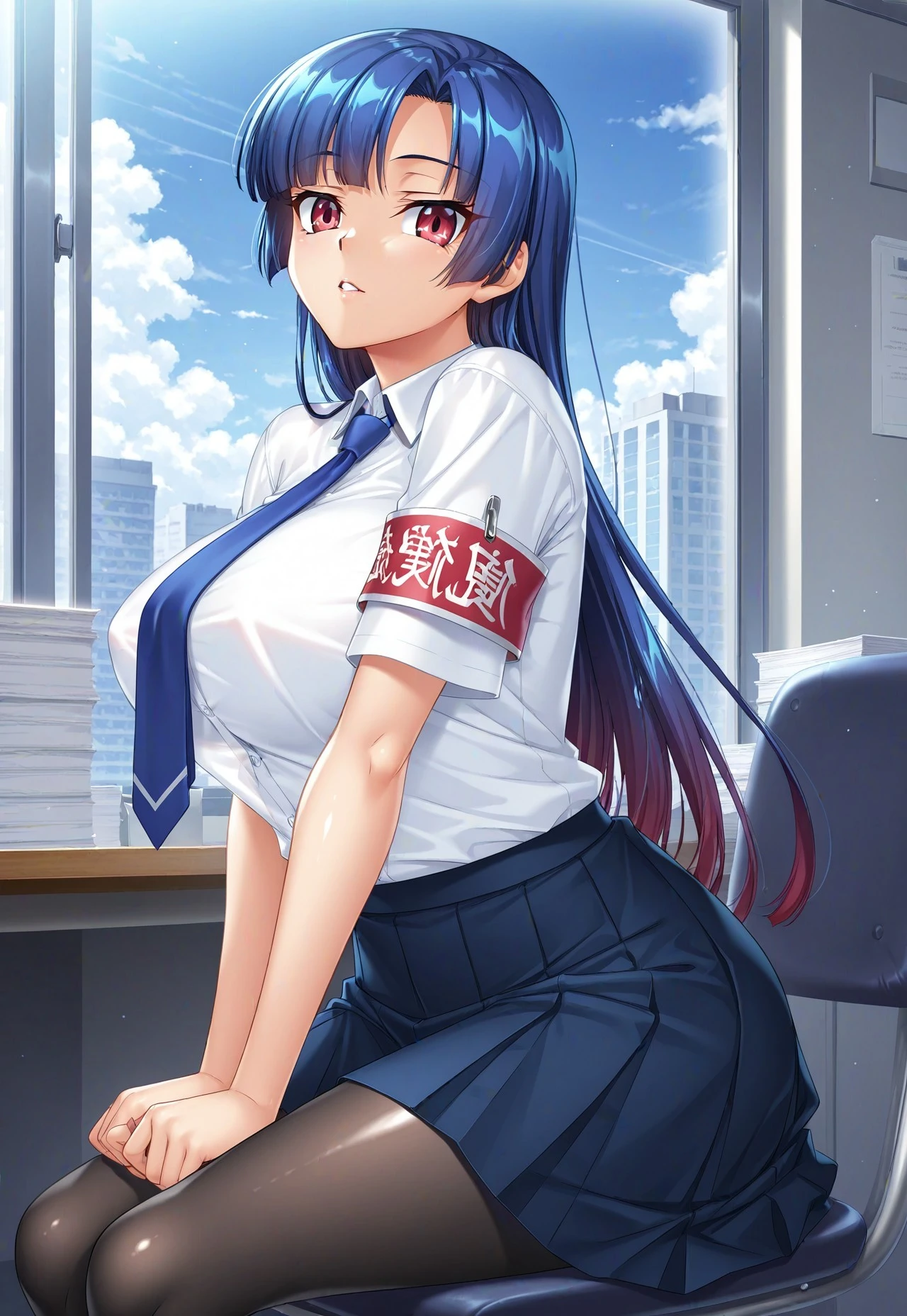 2nd outfit: school uniform, white buttoned-up shirt, collared shirt, short sleeves, blue necktie, armband, blue pleated skirt, black pantyhose, loafers