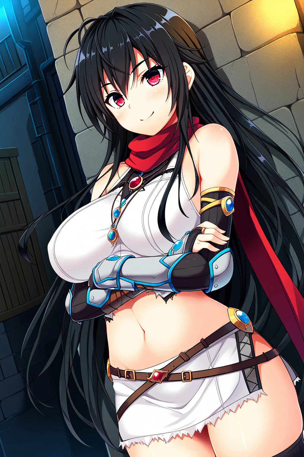 dkr_arsis, 1girl, solo, red eyes, black hair, long hair, large breasts, red scarf, bare shoulders, necklace, white crop top, navel, vambraces, black elbow gloves, white miniskirt, side slit, crossed belts, black thighhighs, armored boots,