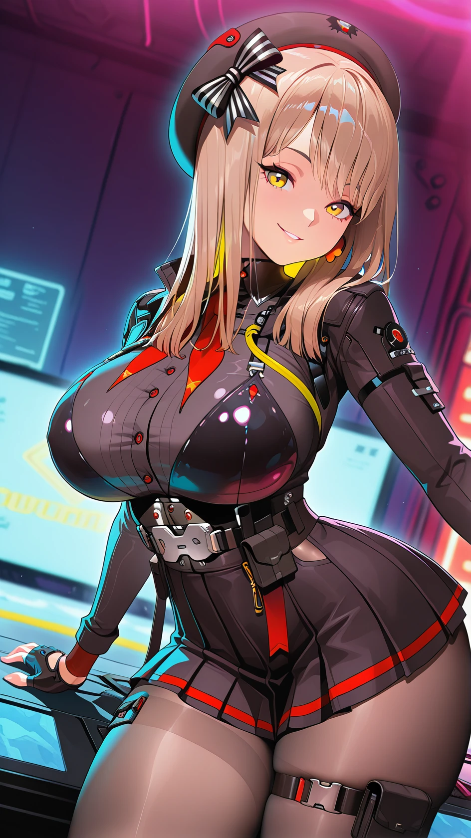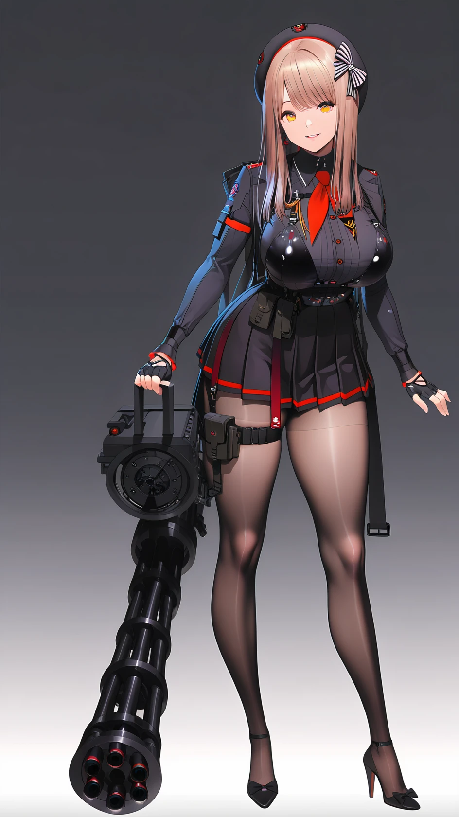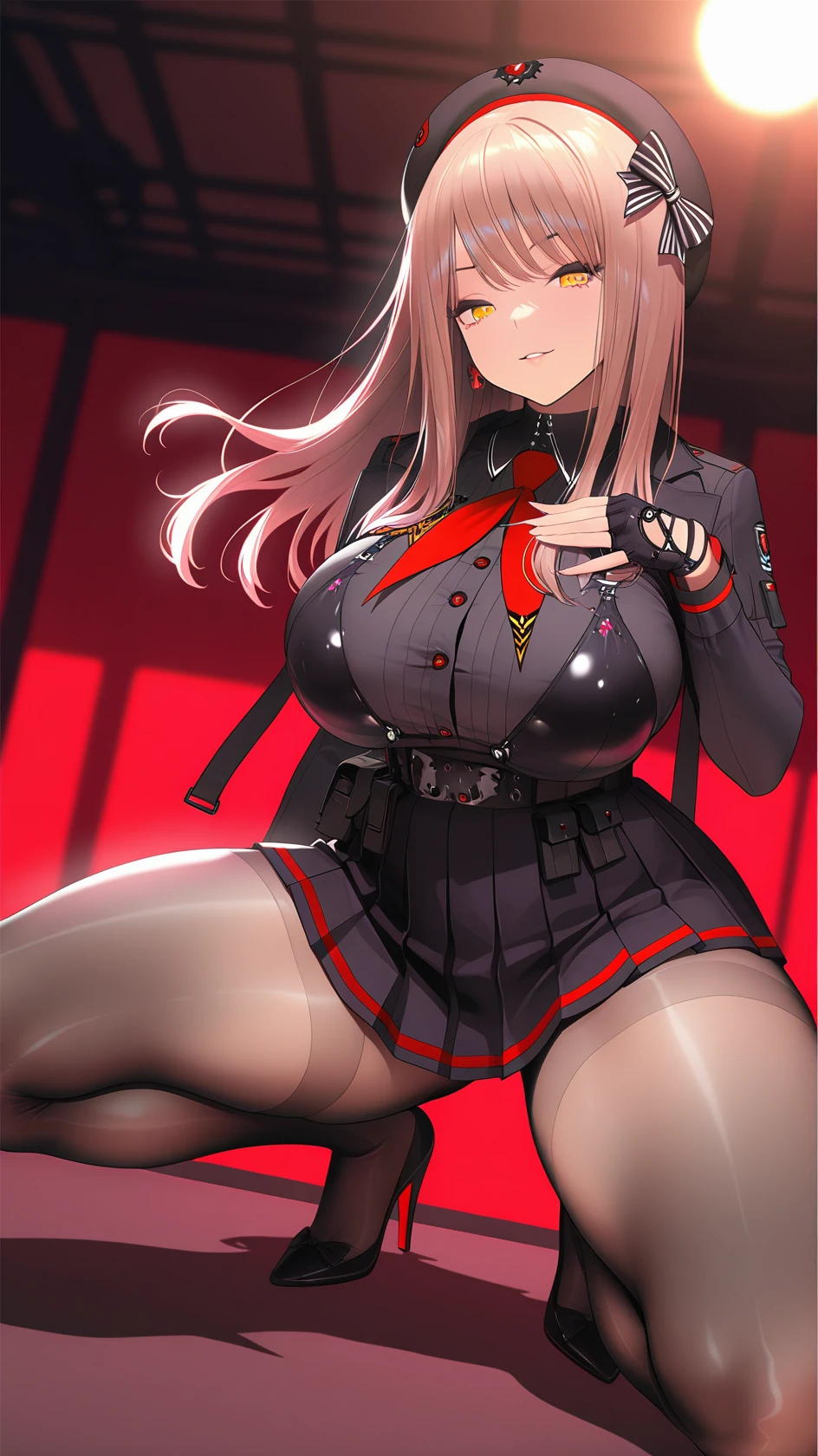 1girl, bangs, black beret, brown hair, hair bow, long hair, large breasts, yellow eyes, fingerless gloves, pleated skirt, skirt, black uniform, pantyhose, high heels, thigh strap,