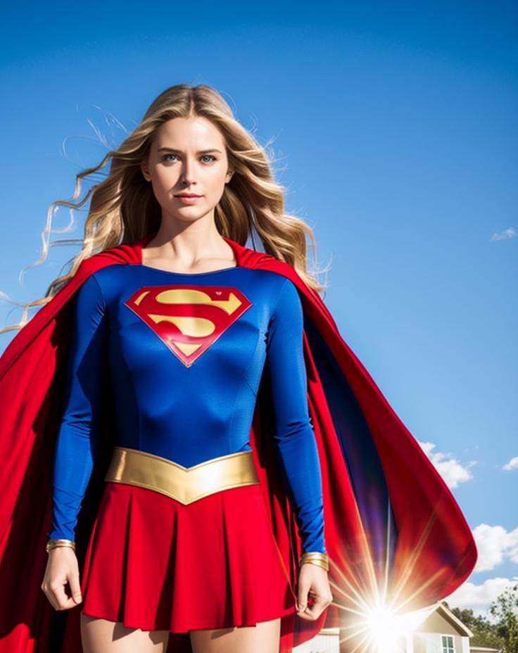 Prompt: photo of SupergirlSH person, woman, Supergirl, hero, long hair, HD,8K,realistic, looking at viewer,suitbody red complete, arms behind back, sunny sky, house, street, rocks