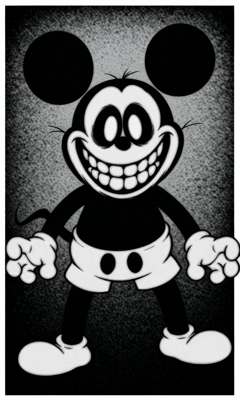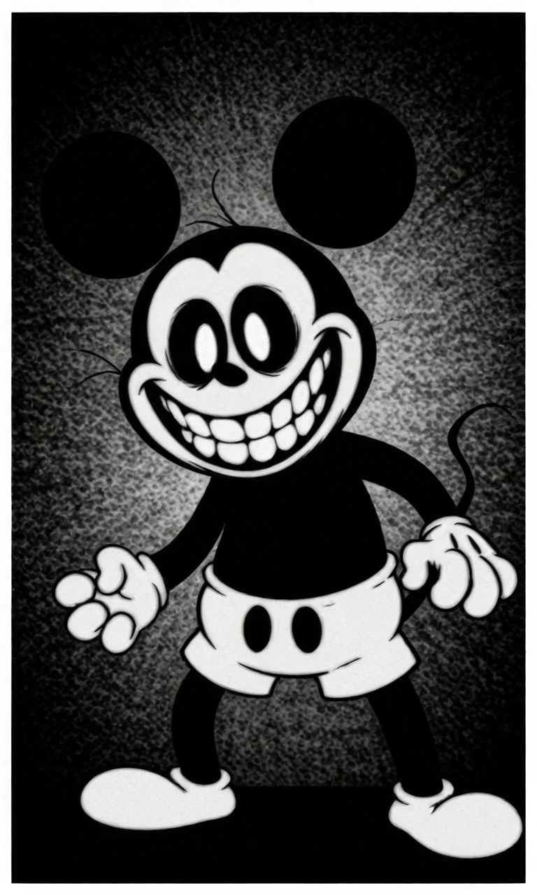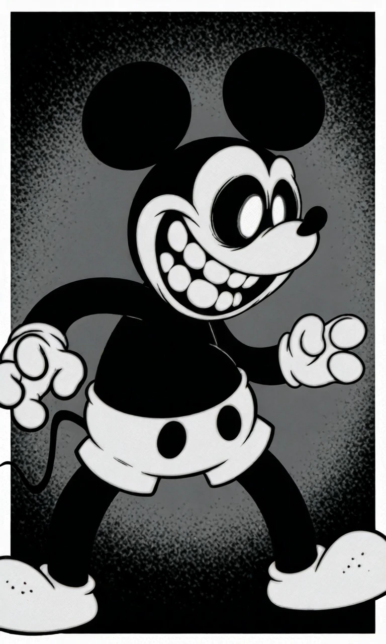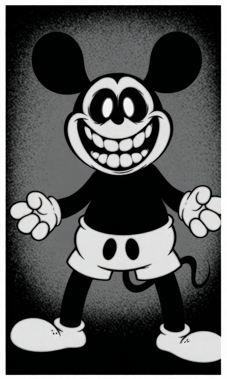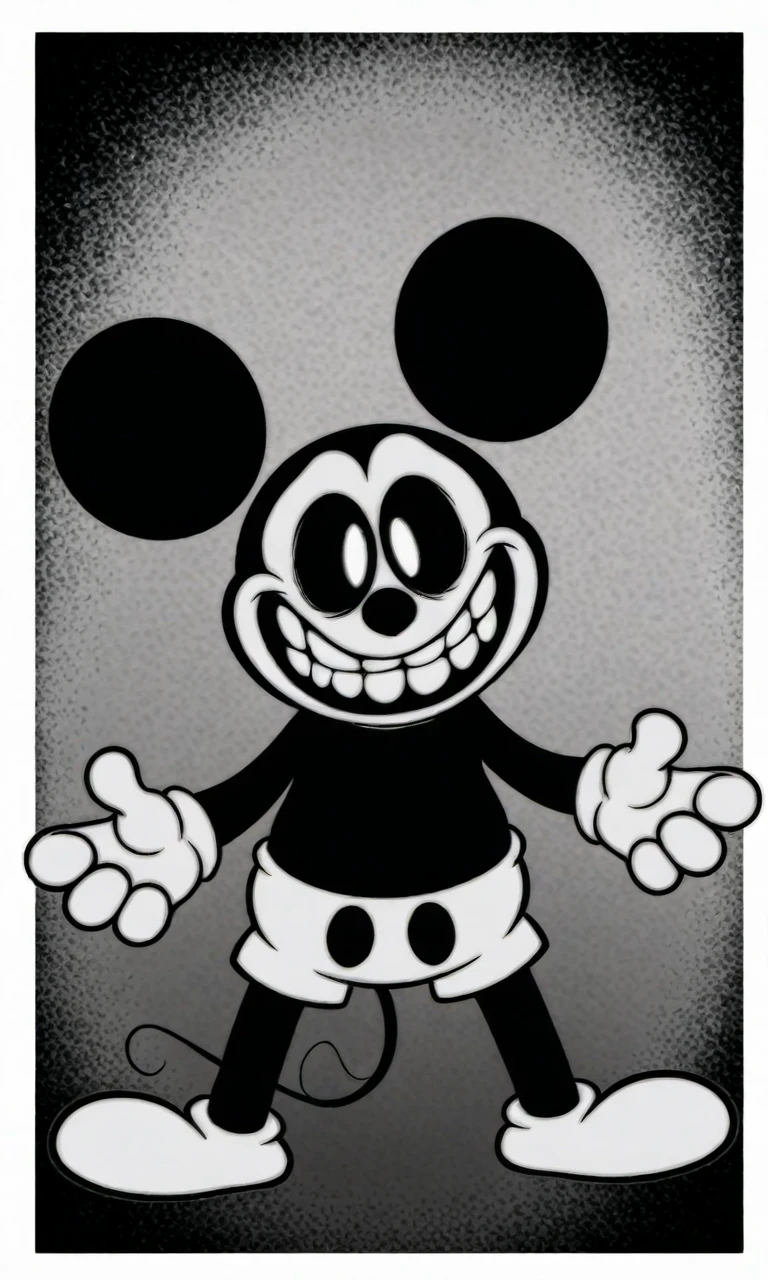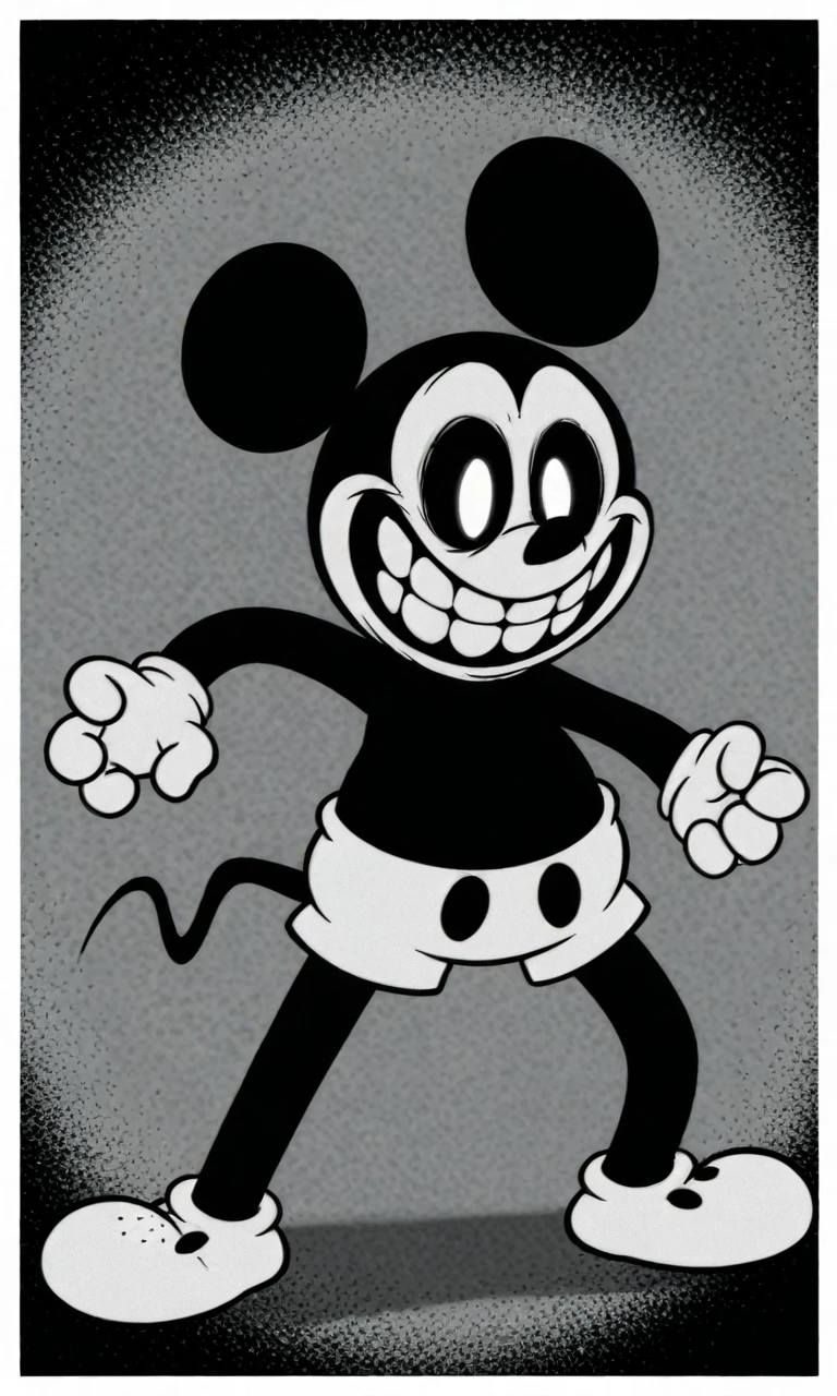 black body, round ears, white face, white eyes, black baggy eyes, creepy smile, creepy teeth, black torso, white gloves, white shorts, white shoes, mouse tail