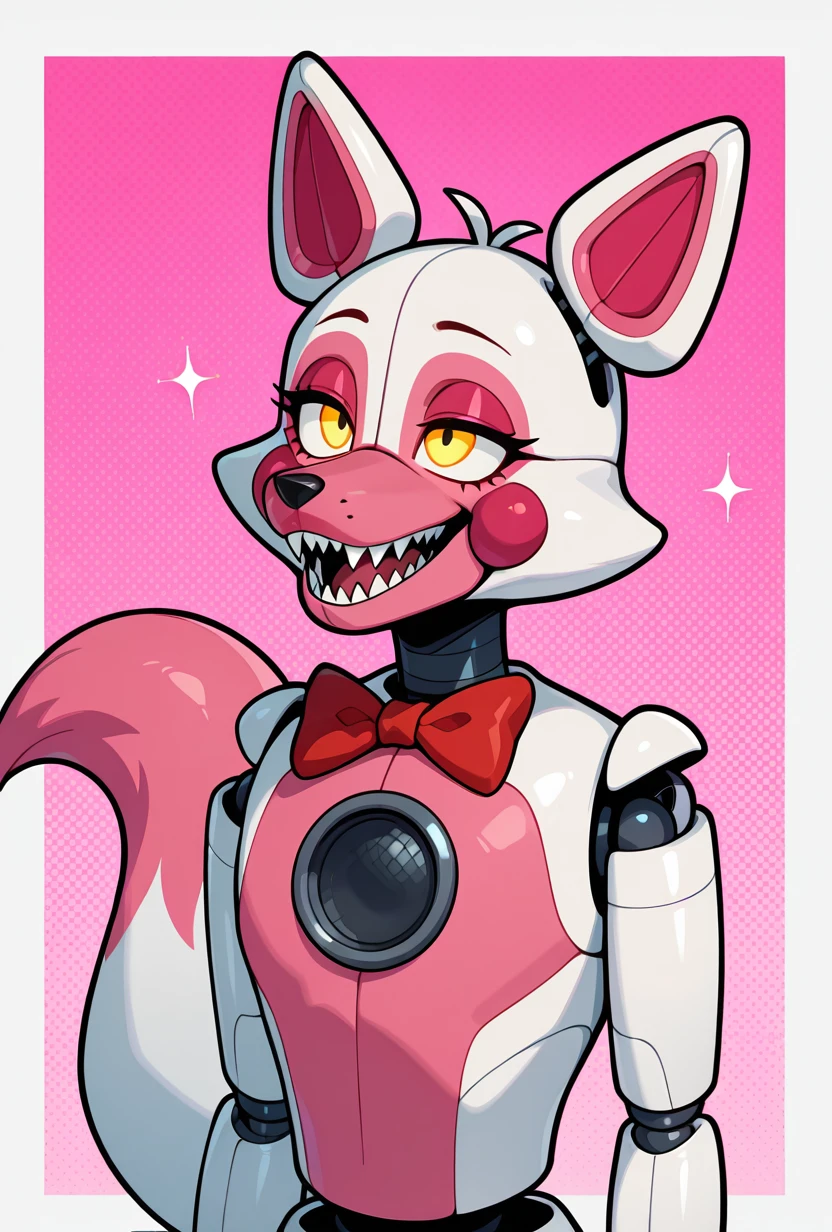 funtimefox, animal ears, solo, robot, animatronic, tail , 1boy, joints, yellow eyes, sharp teeth, red bowtie, pink snout, white skin, big snout, long snout, pink belly, white body,