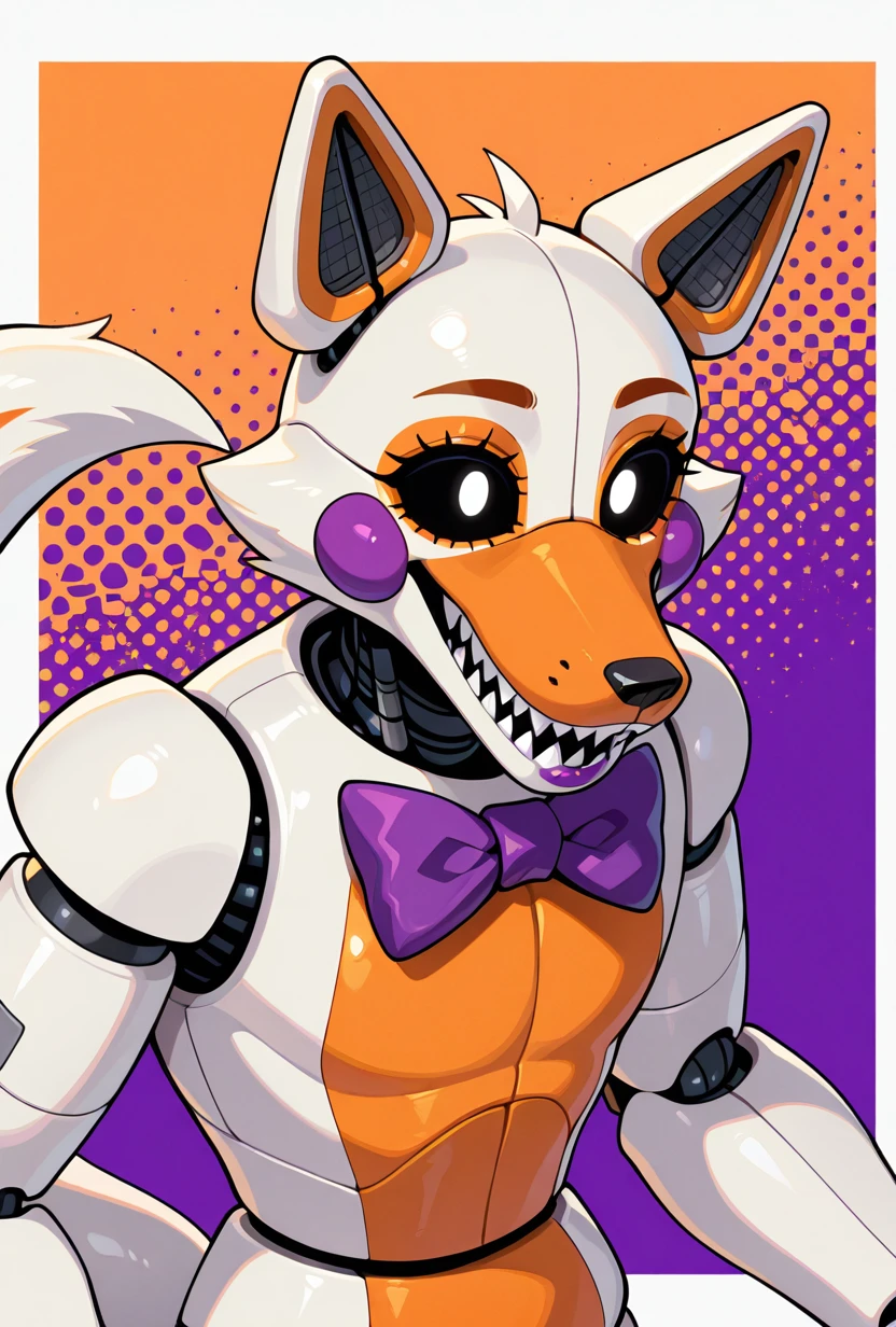 funtimefox, animal ears, solo, robot, animatronic, tail , 1boy, joints, black sclera, purple cheeks, purple lipstick, sharp teeth, purple bowtie, orange snout, white skin, big snout, long snout, orange belly, white body,