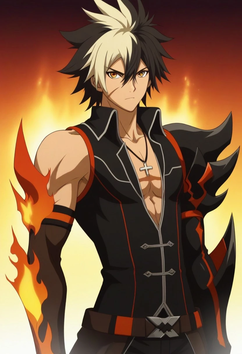 Raven Cronwell Reckless Fist, multicolored hair, two-tone hair, gold eyes, face scar, cross necklace, chest scar, black sleeveless collared shirt, low neckline, monster left arm, right fishnet arm glove, black pants, multiple red belts, silver shoes, red and silver accents