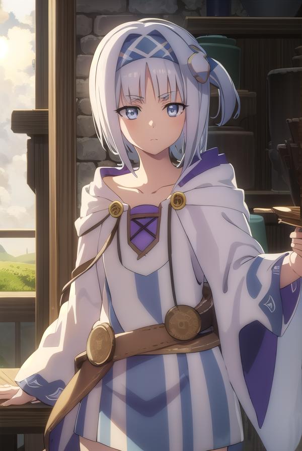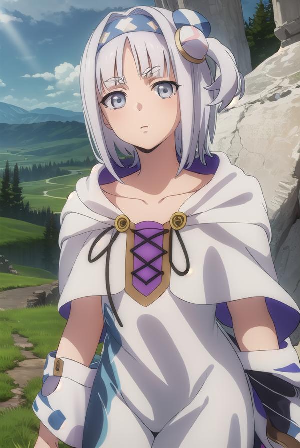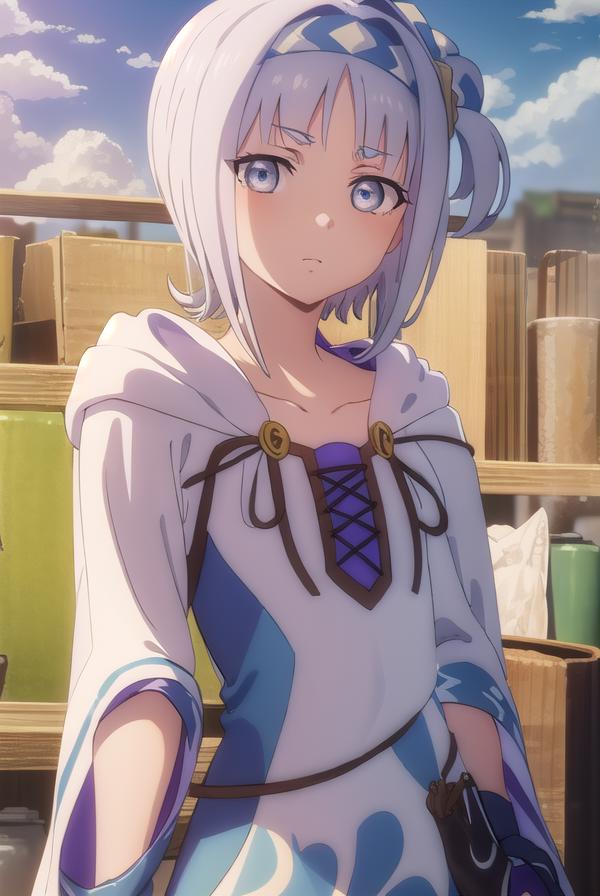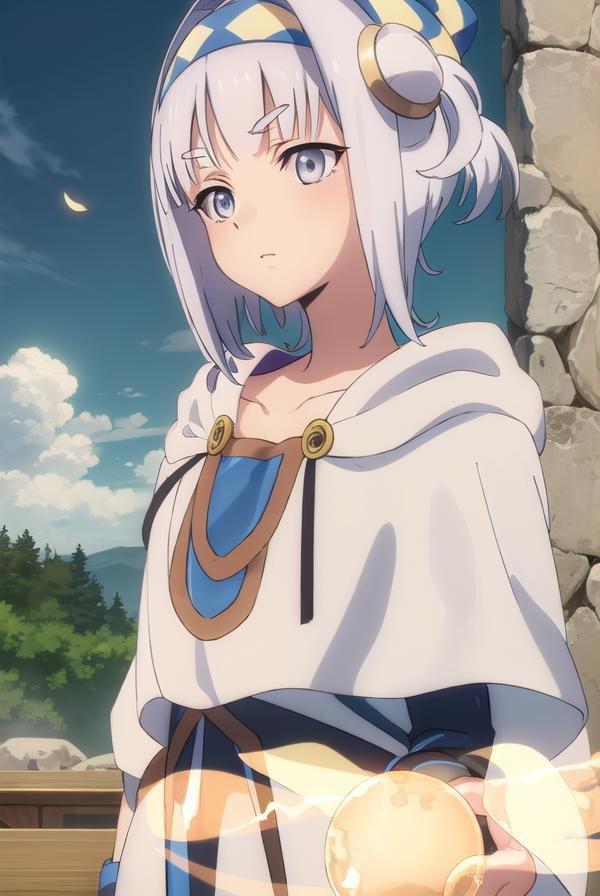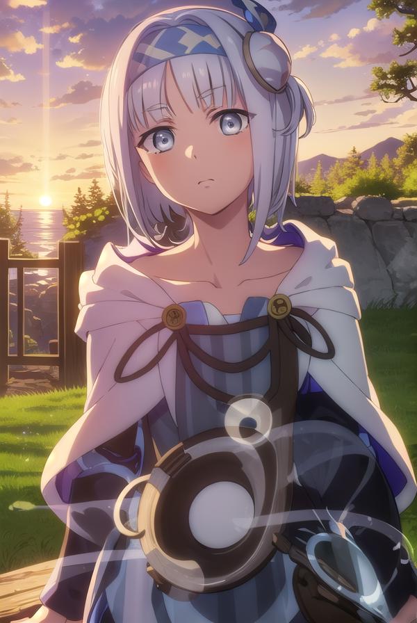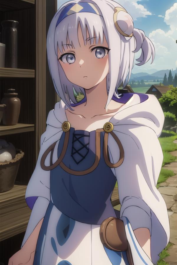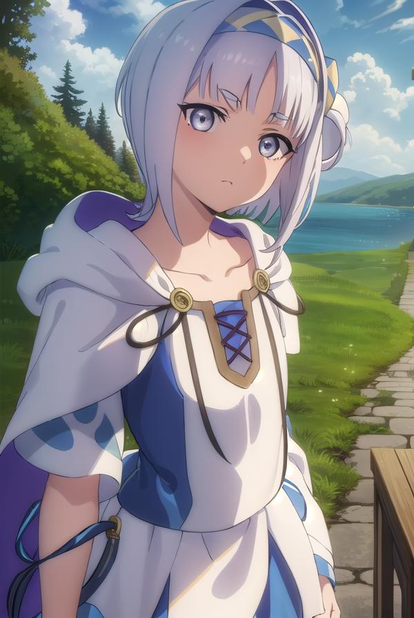 syne lokk, short hair, bangs, hair ornament, white hair, hairband, side ponytail, (grey eyes:1.3),