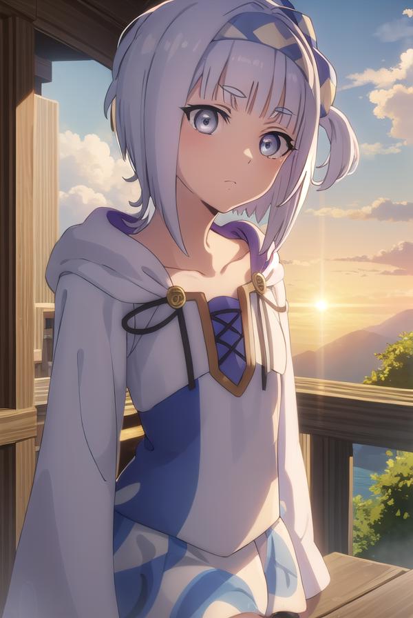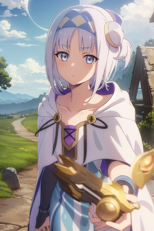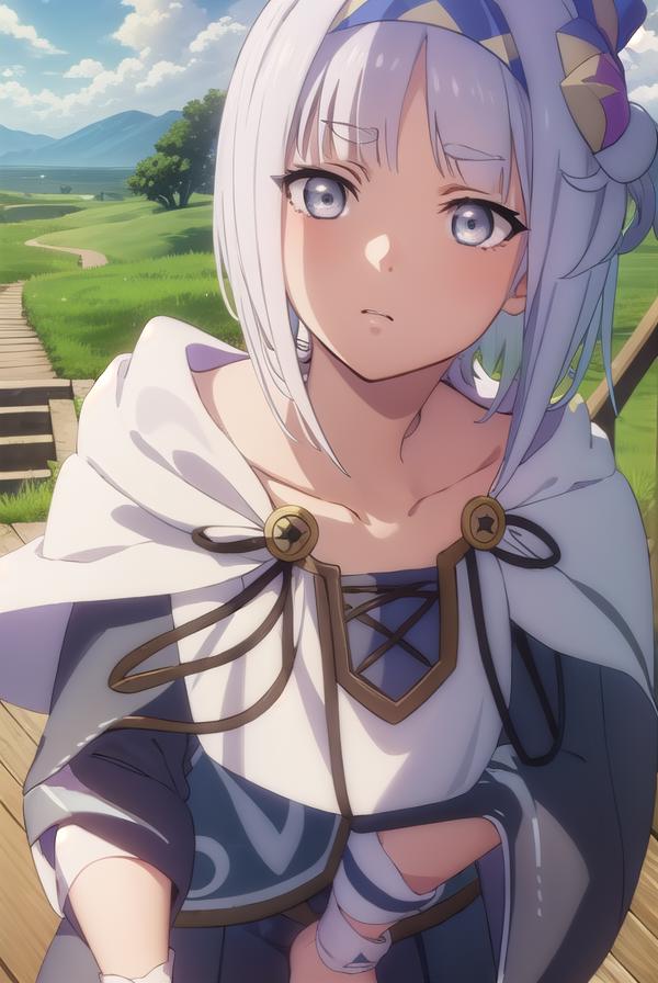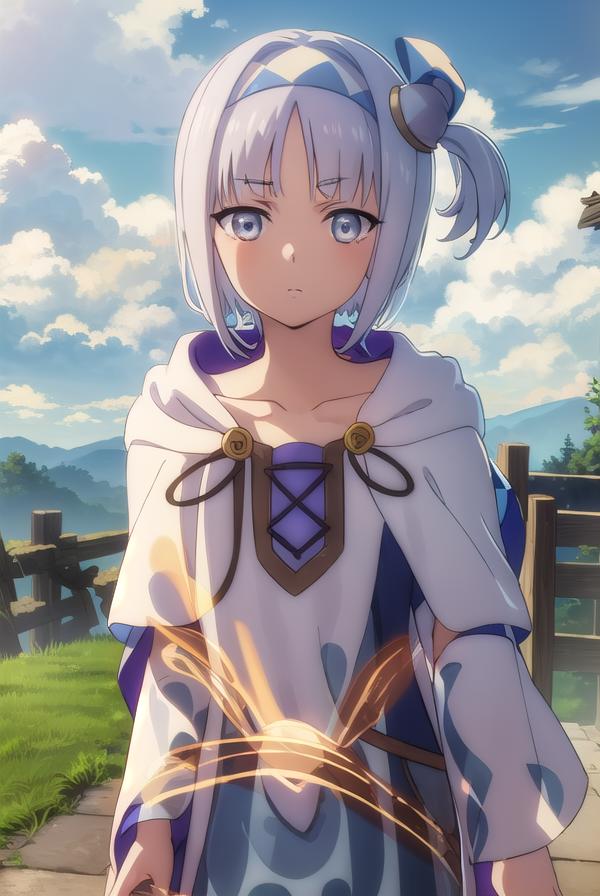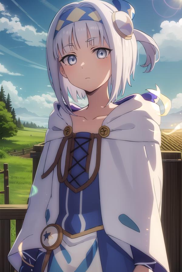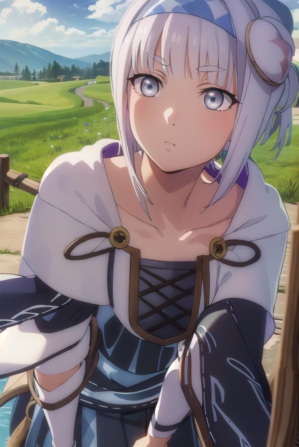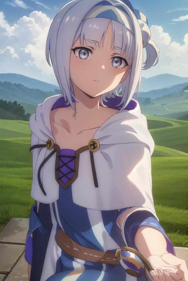 syne lokk, short hair, bangs, hair ornament, white hair, hairband, side ponytail, (grey eyes:1.3),
