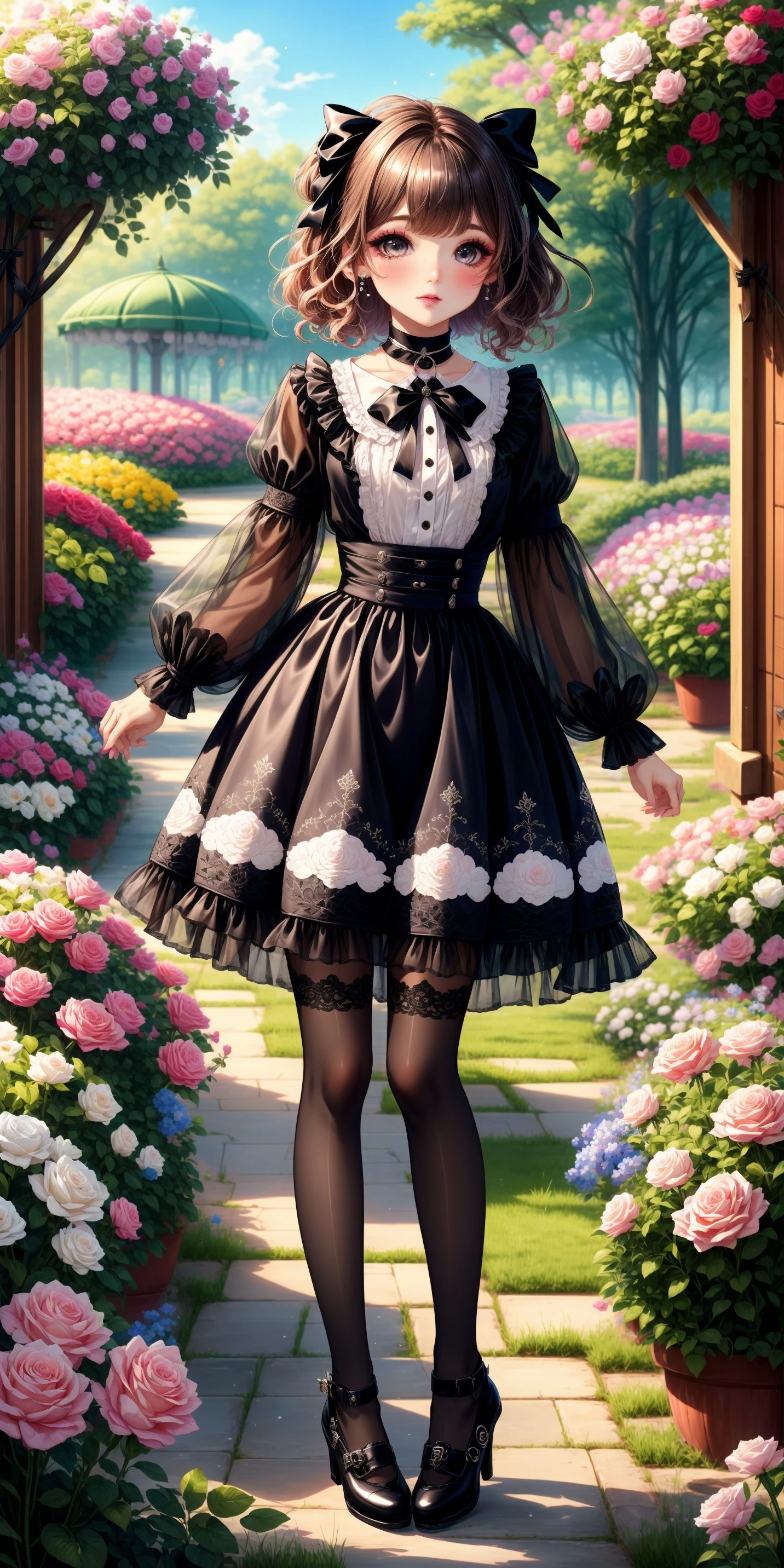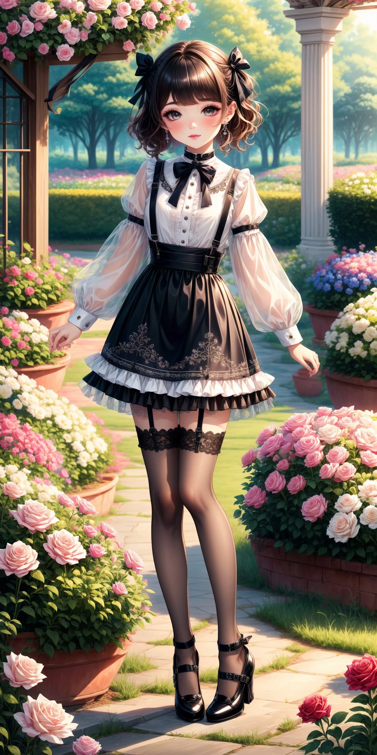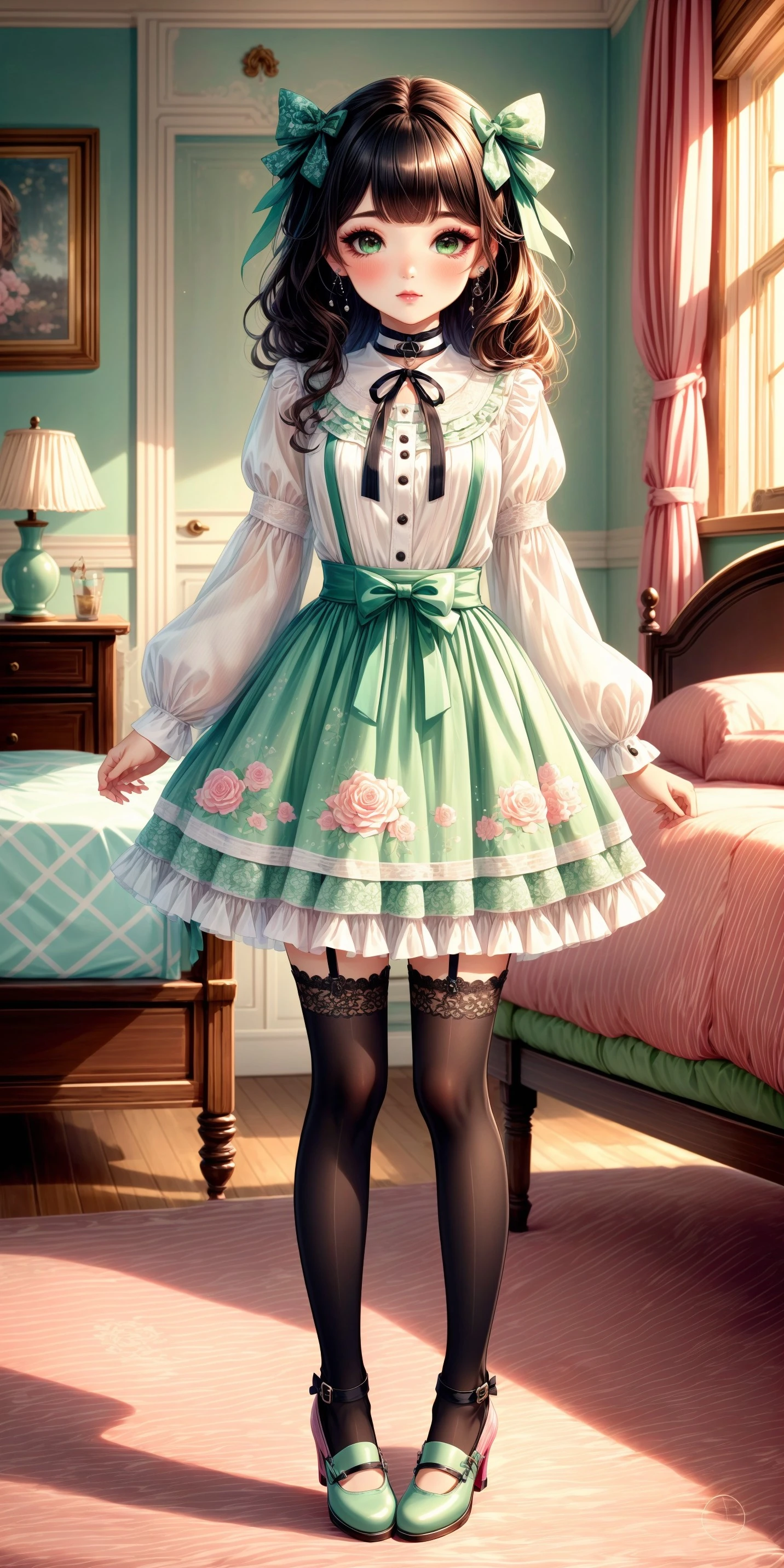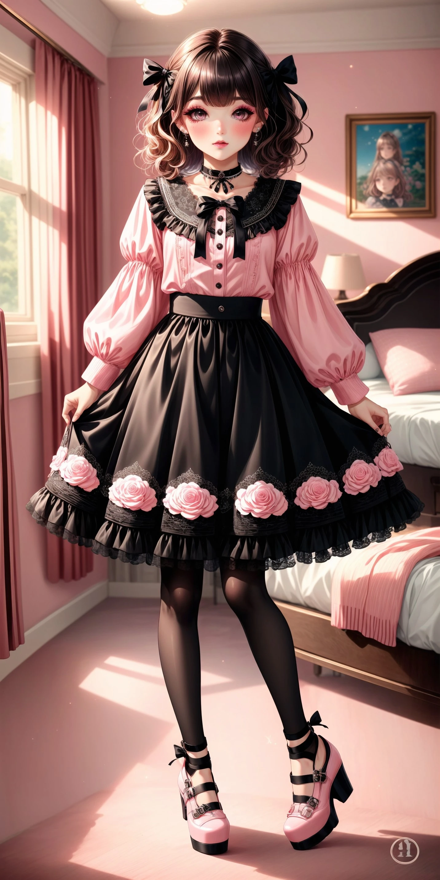 larme kei, larme, bangs, makeup, heavy eye makeup, (pink eyeshadow), print clothing, plaid print, gingham, slip dress, strappy dress, shirt, collared shirt, puffy short sleeves, puffy long sleeves, bishop sleeves, off shoulders, ruffles, frills, lace, lace trim, embroidery, (embroidery on shirt), pencil skirt, peplum, tulle skirt, suspenders, suspenders skirt, bows, stockings, lace tights, lace socks, mary janes, pumps, heels, t-strap shoes, choker, cute cozy girly bedroom, garden, rose garden, tea party, roses, pearls, sparkles, glitter