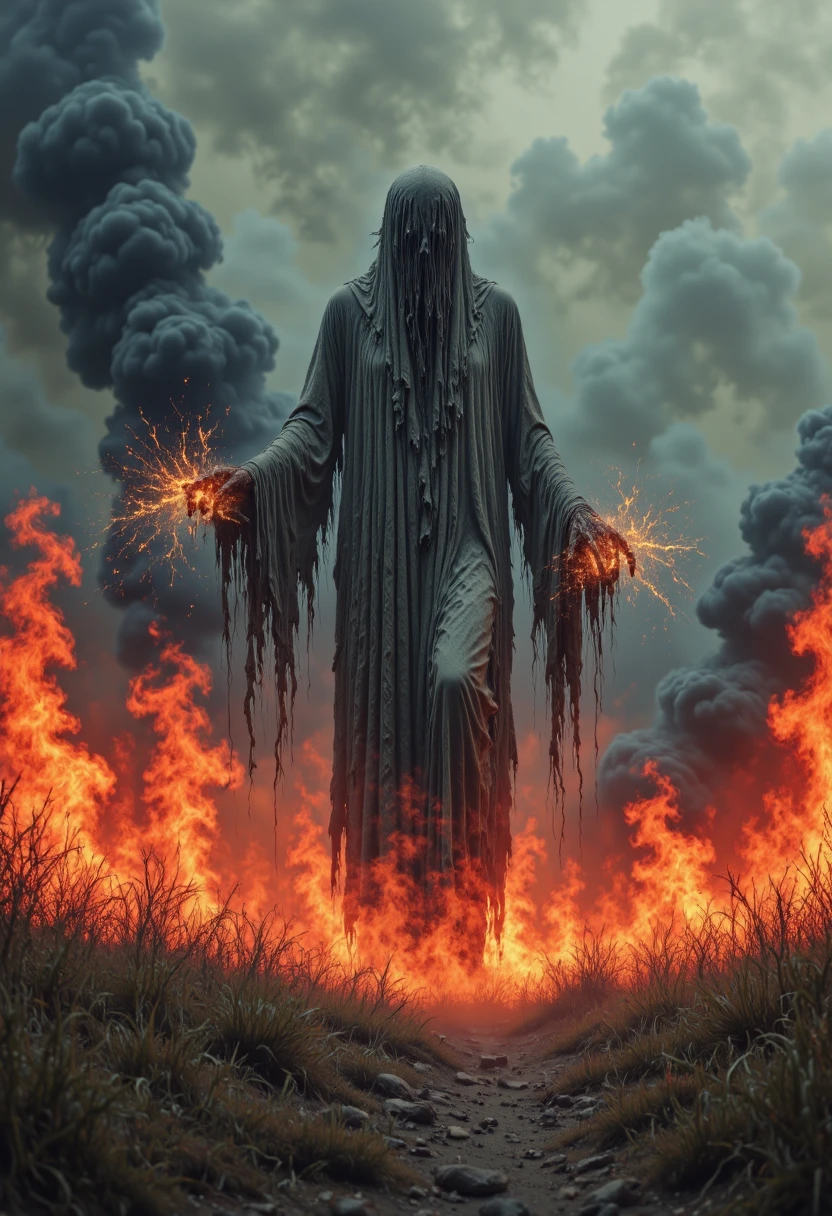 Dynamic Scene: “A robed necromancer conjuring fiery sparks in a barren wasteland, framed by rising smoke and red, glowing embers; storm clouds swirl overhead.”