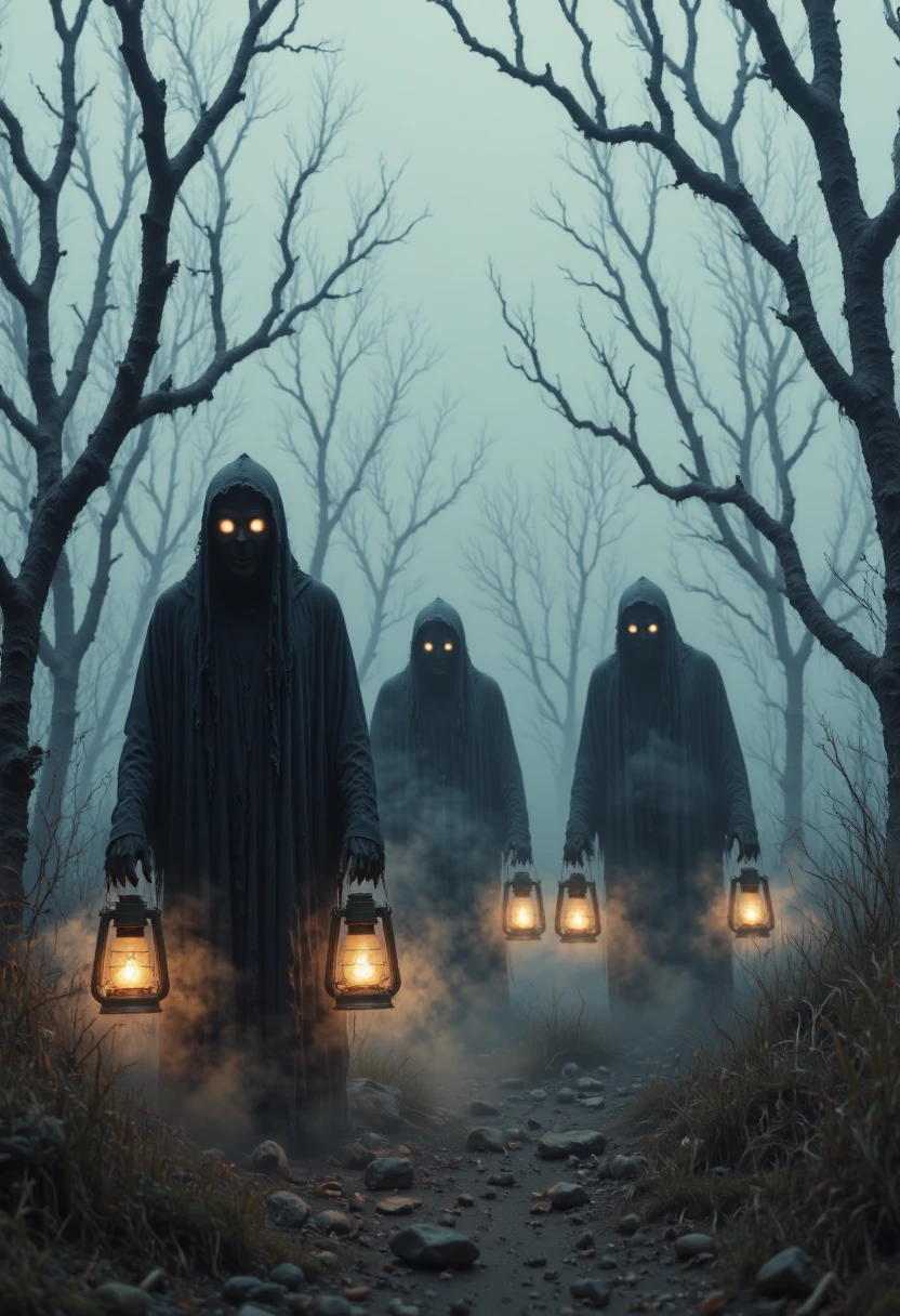 Group Composition: “Three shadowy figures carrying glowing lanterns, walking through a forest of dead trees, their robes blending into the fog.”