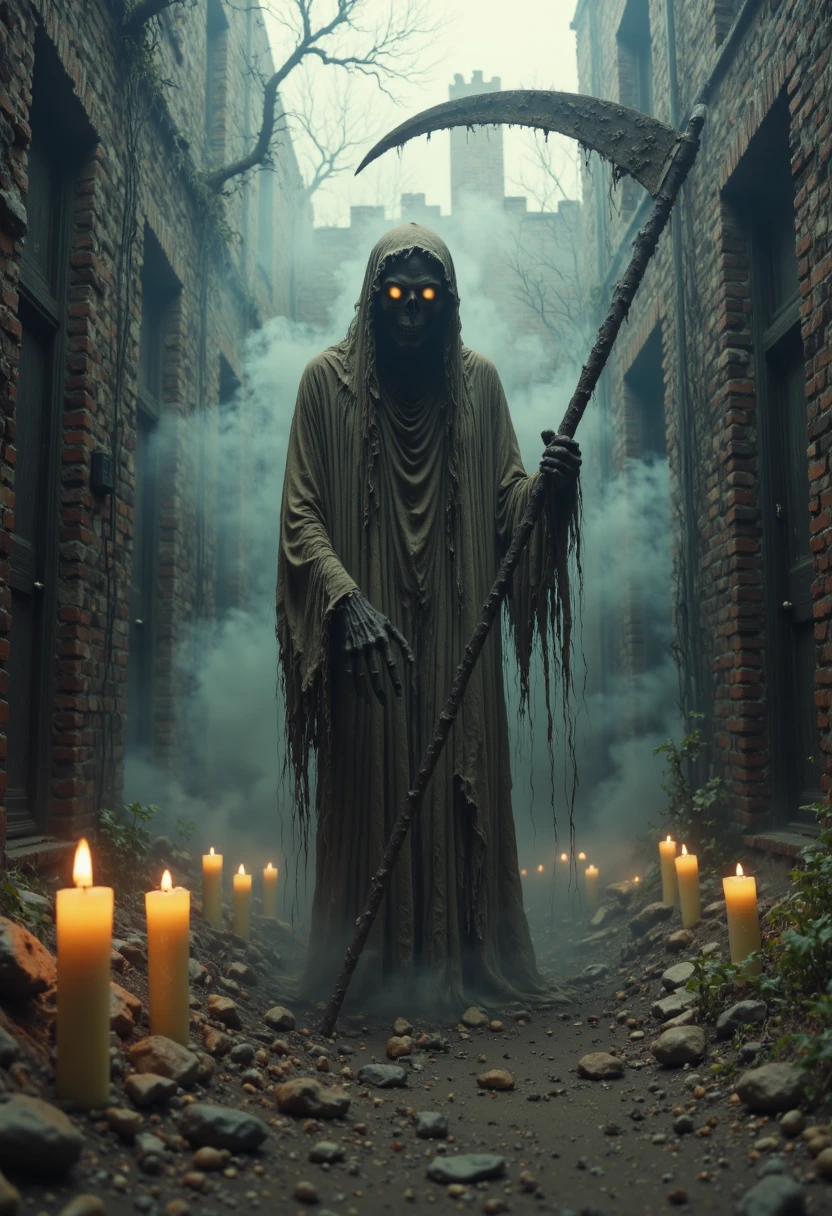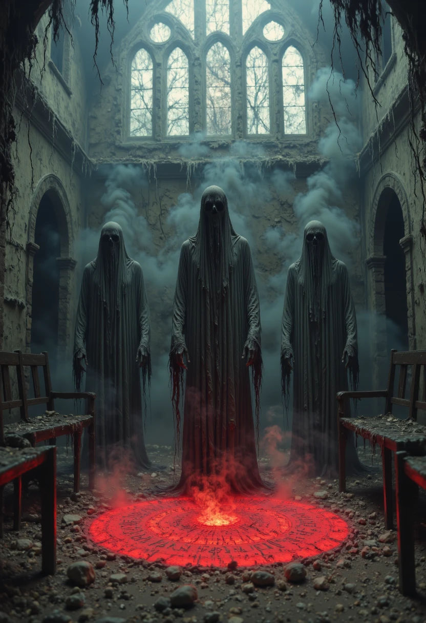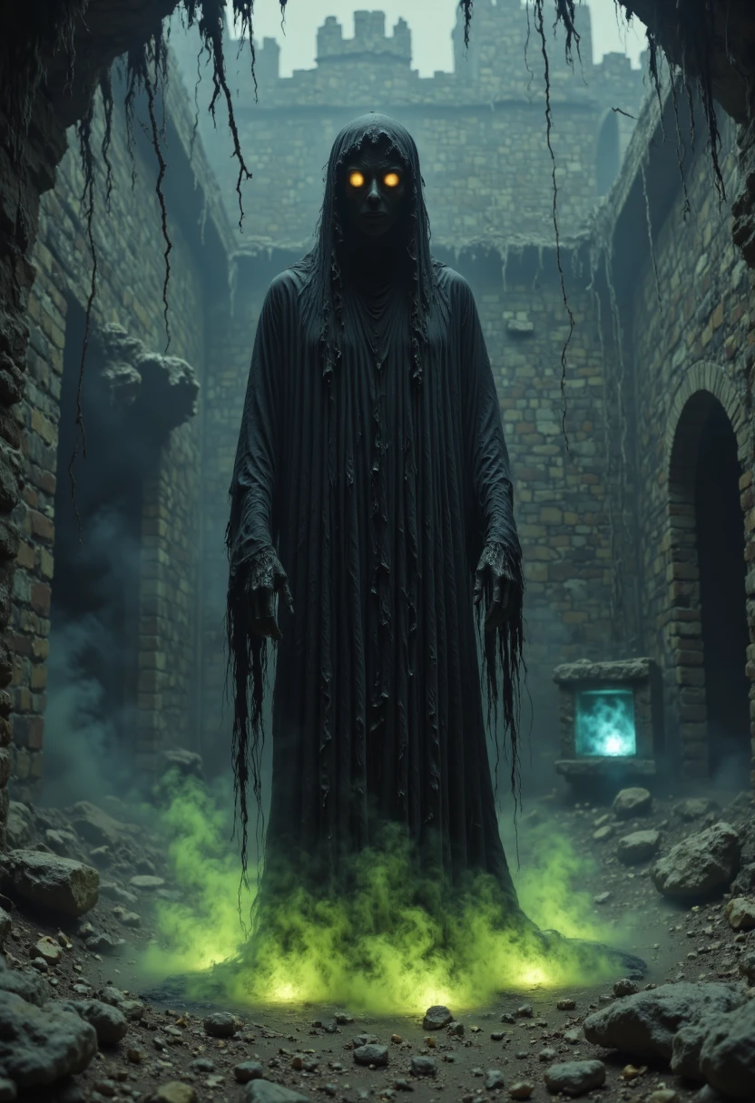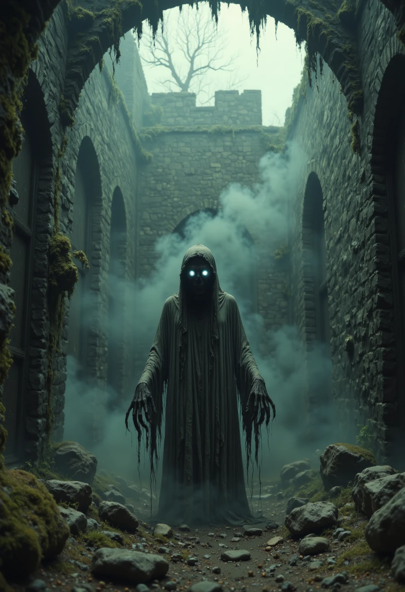 Gothic Setting: “An ancient, crumbling castle under a pale full moon, surrounded by foggy forests, its arched windows glowing faintly with eerie green light.”