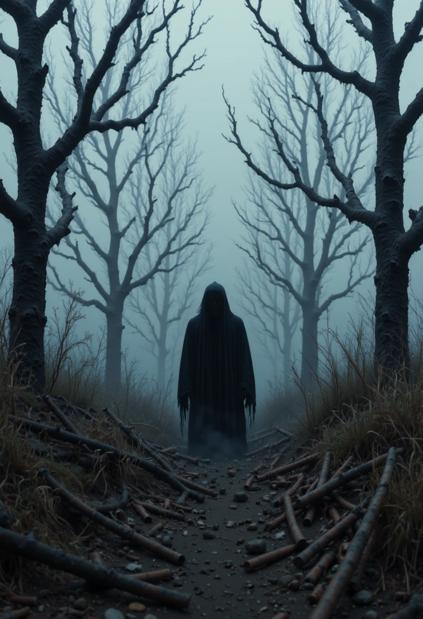 Character Focus: “A tall, hooded figure with glowing amber eyes, standing amidst swirling green mist, holding a rusted lantern; skeletal trees twist in the background.”
