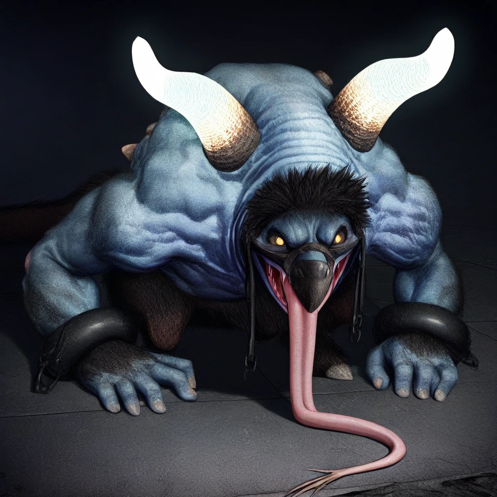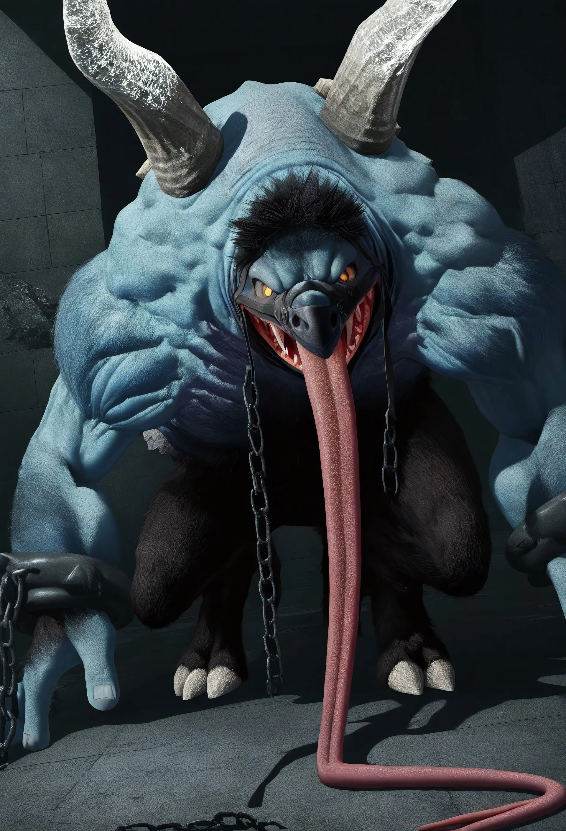 abzu, horns on shoulders, hooved feet, long tongue, forked tongue, tongue out, blue skin