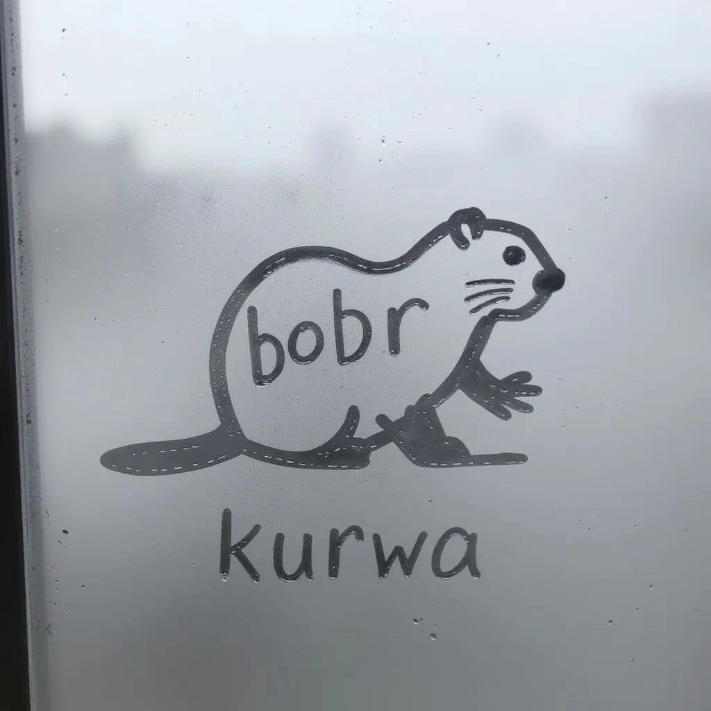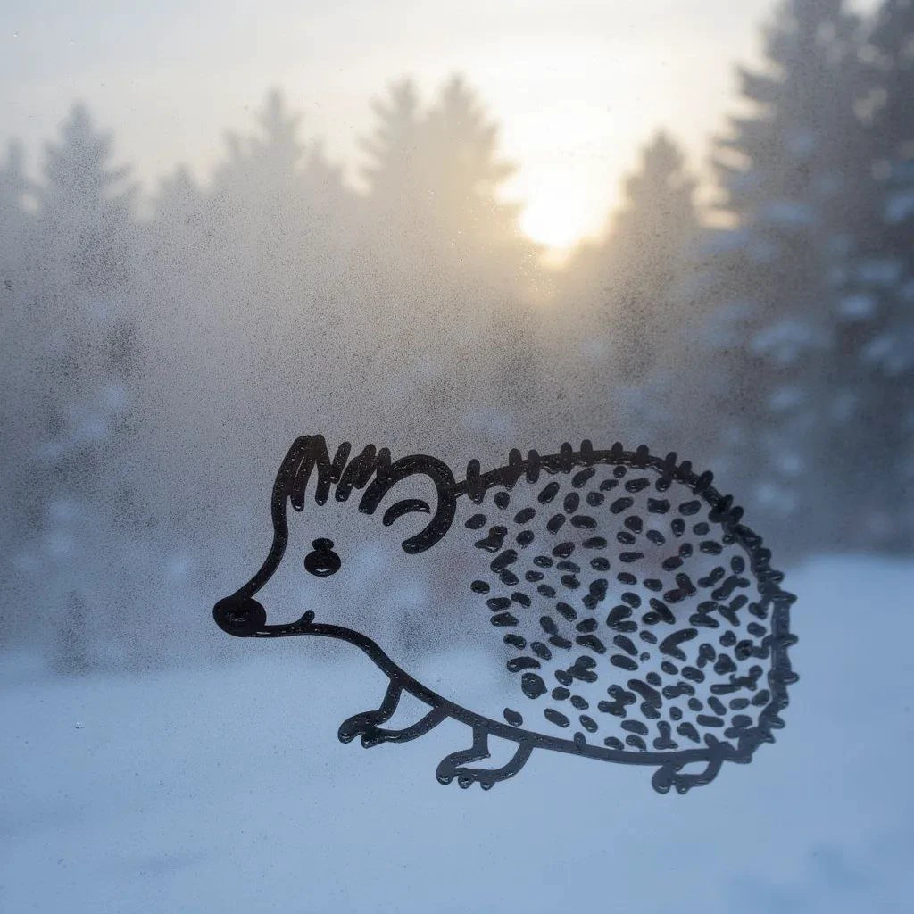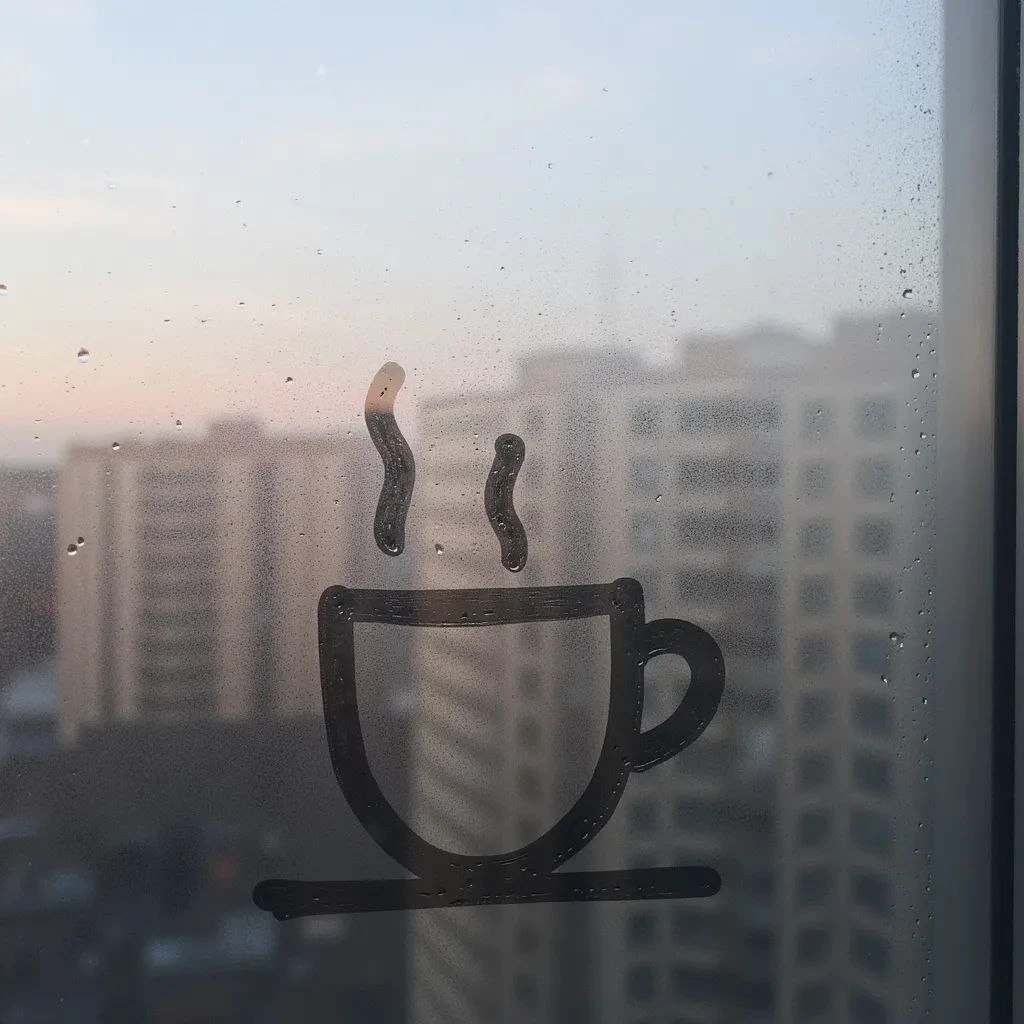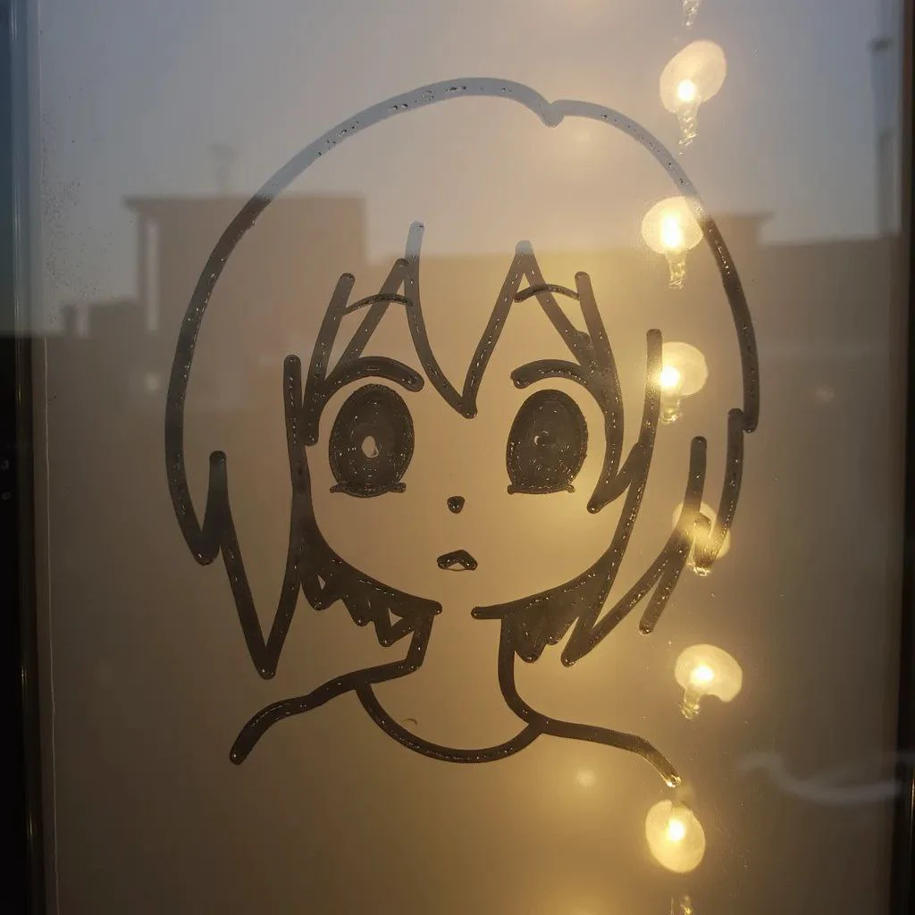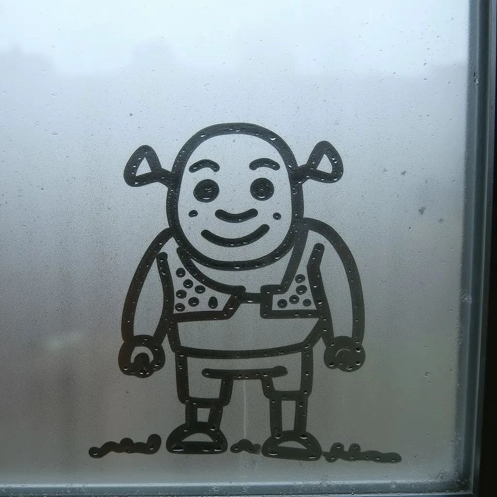 Start prompt with "Photo of a drawing on a fogged window glass depicting of"