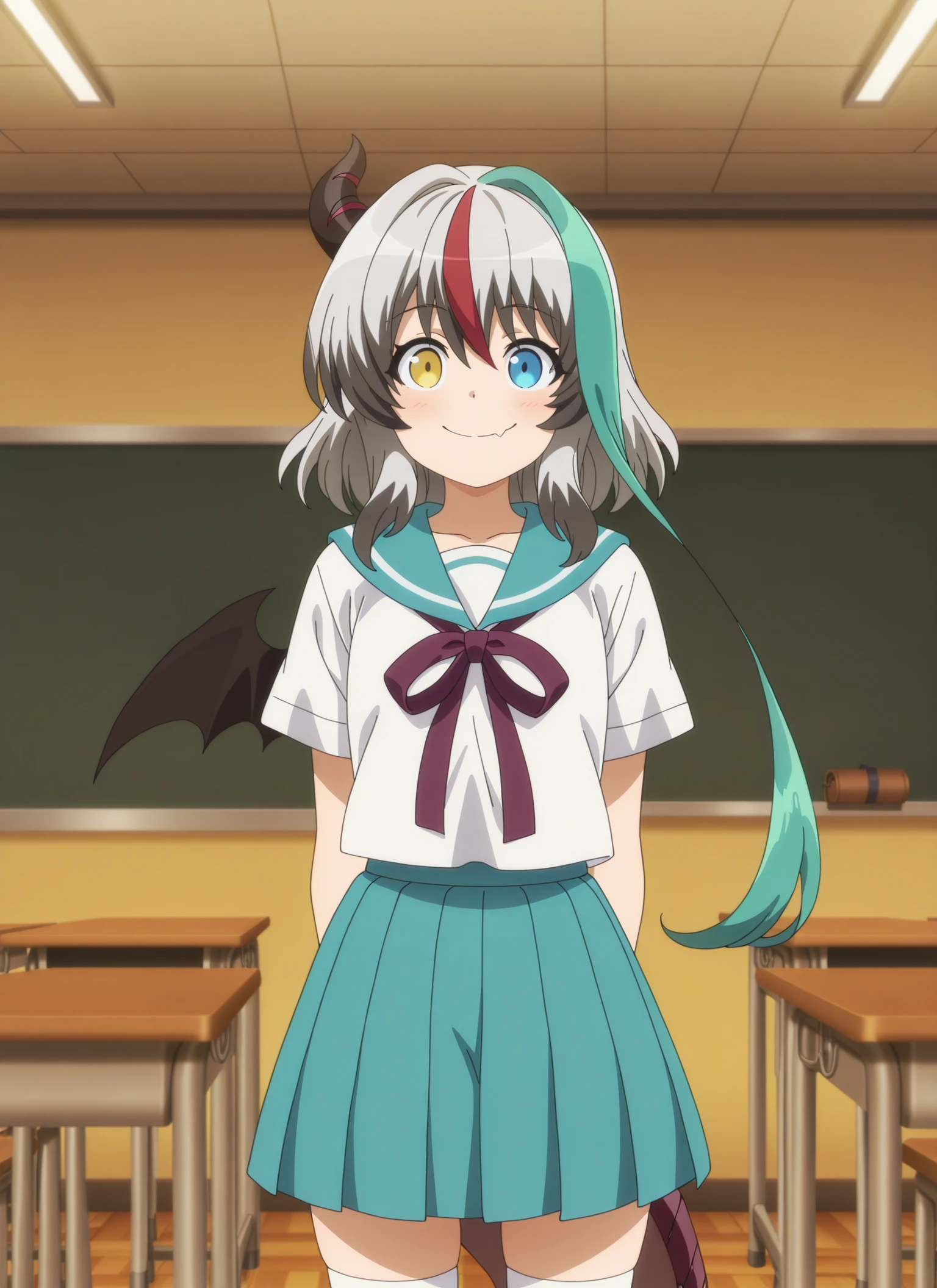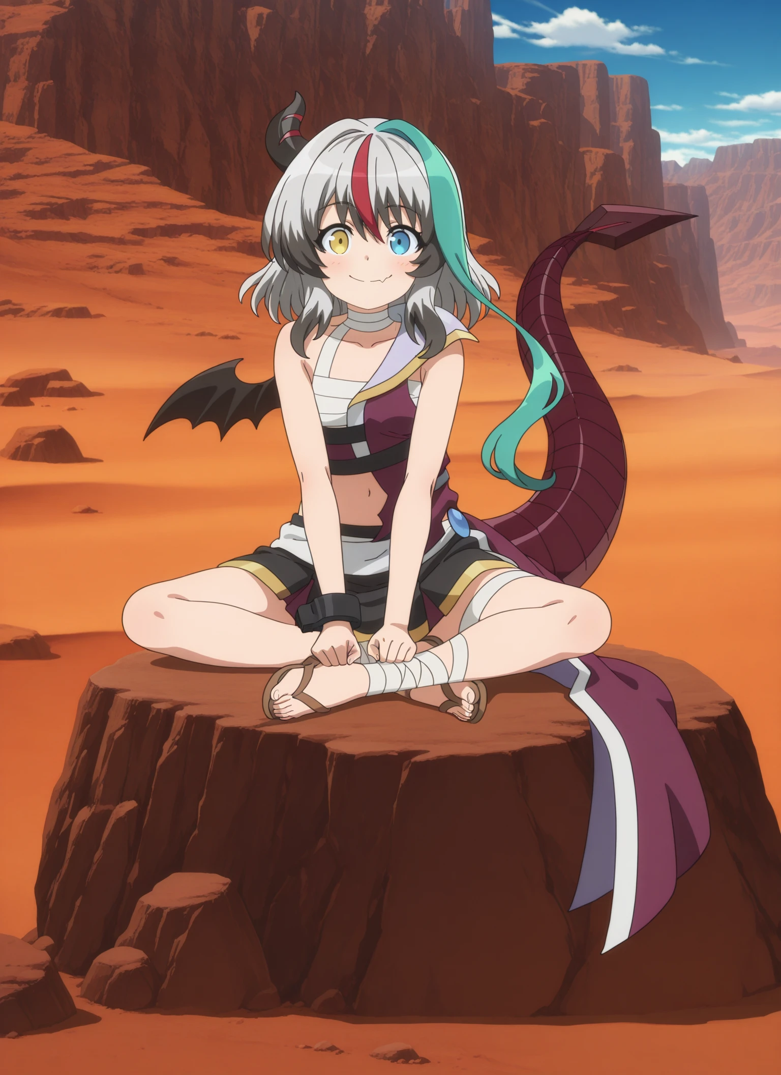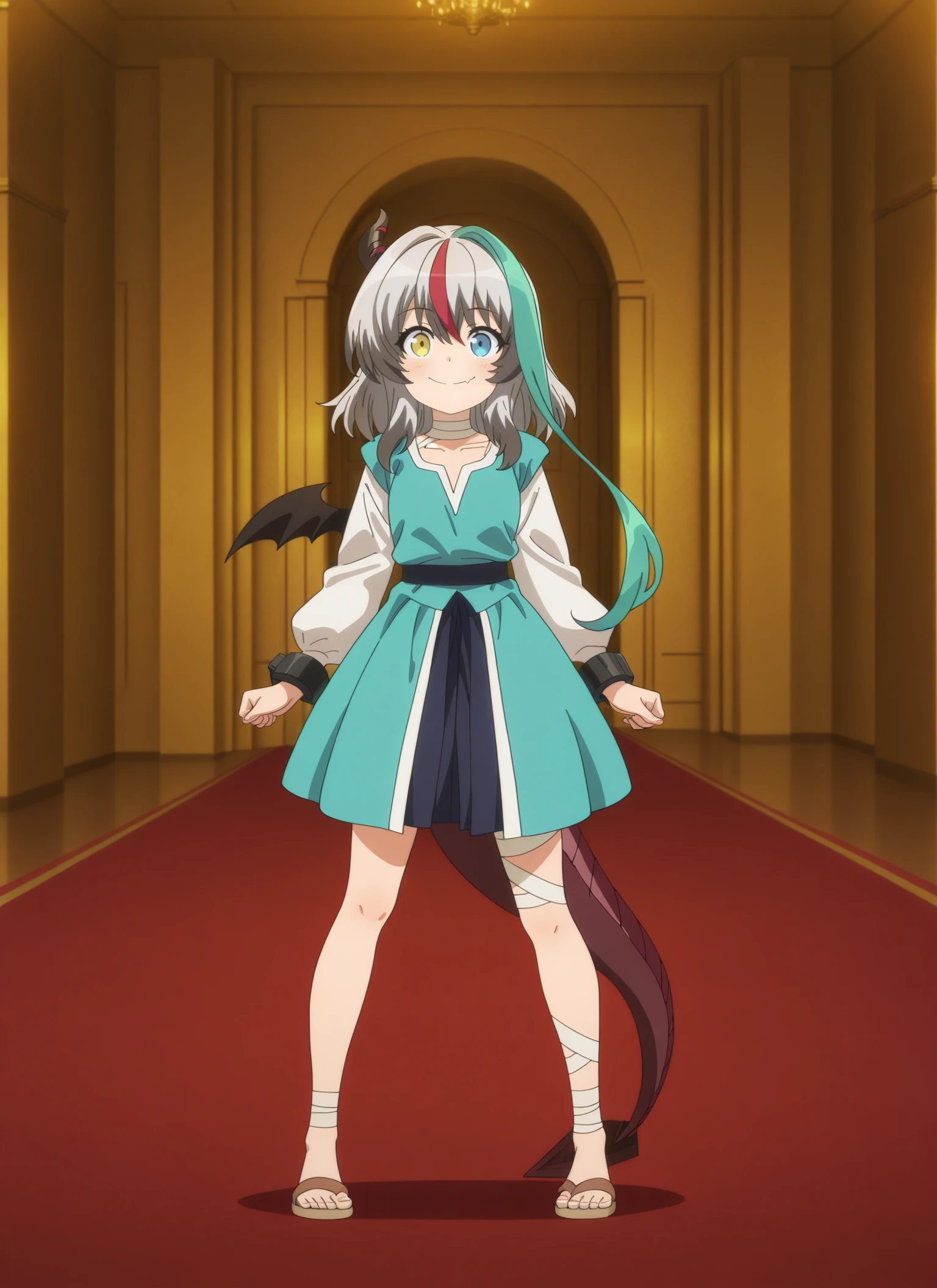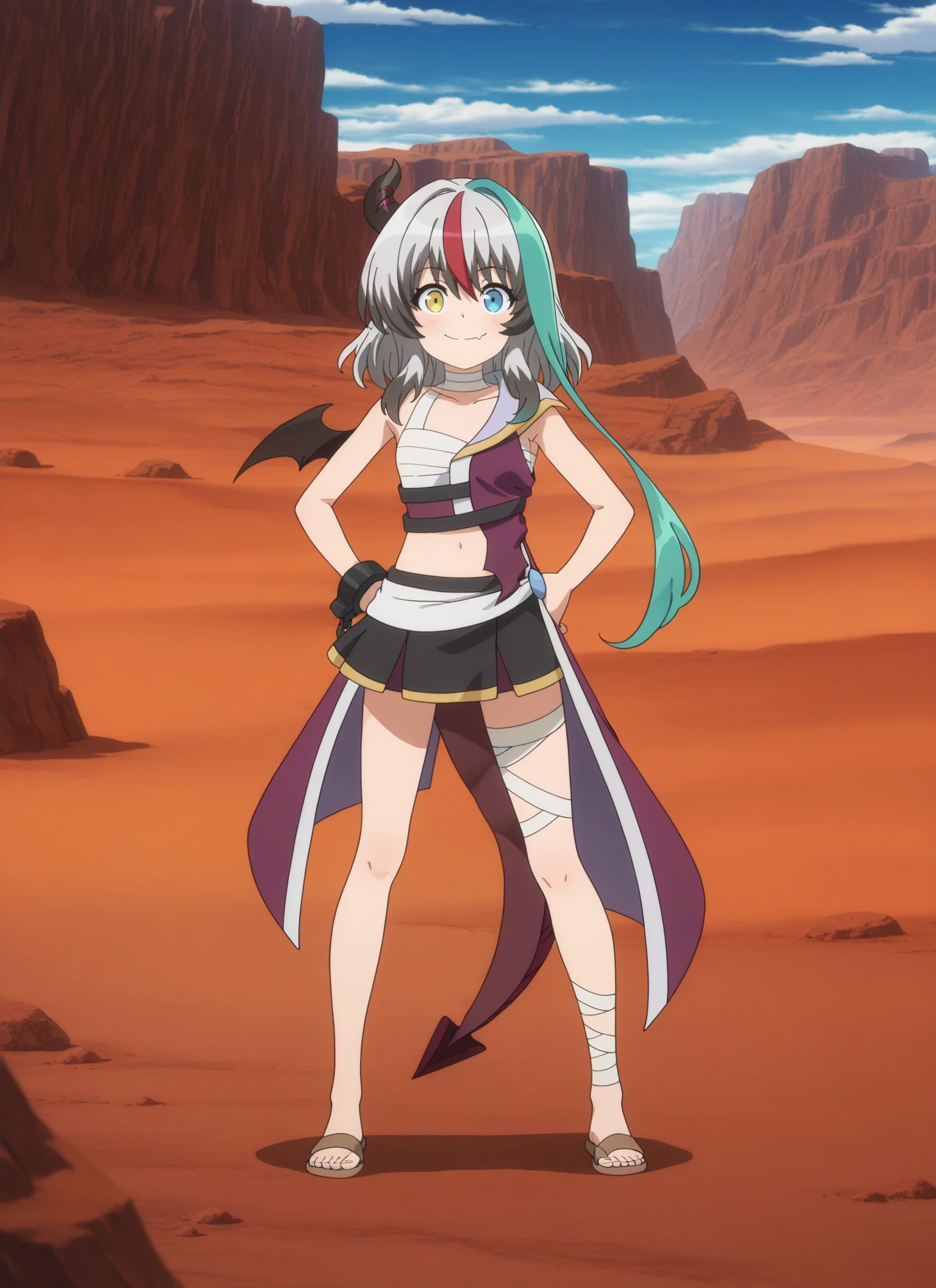 sentouin-hakenshimasu_rose, kid, heterochromia, yellow eyes, blue eyes, short hair, multicolored hair, grey hair, aqua streak, red streak, dark gray hair tips, single horn, single bat wing, dragon tail, skin fang,