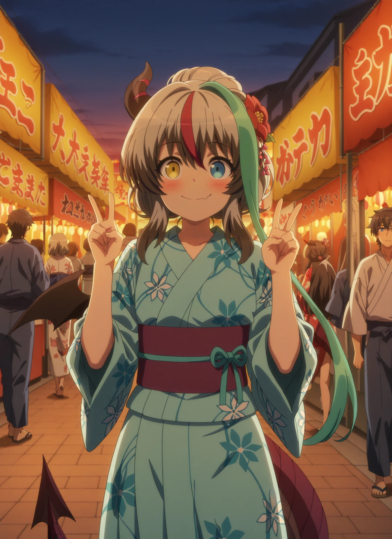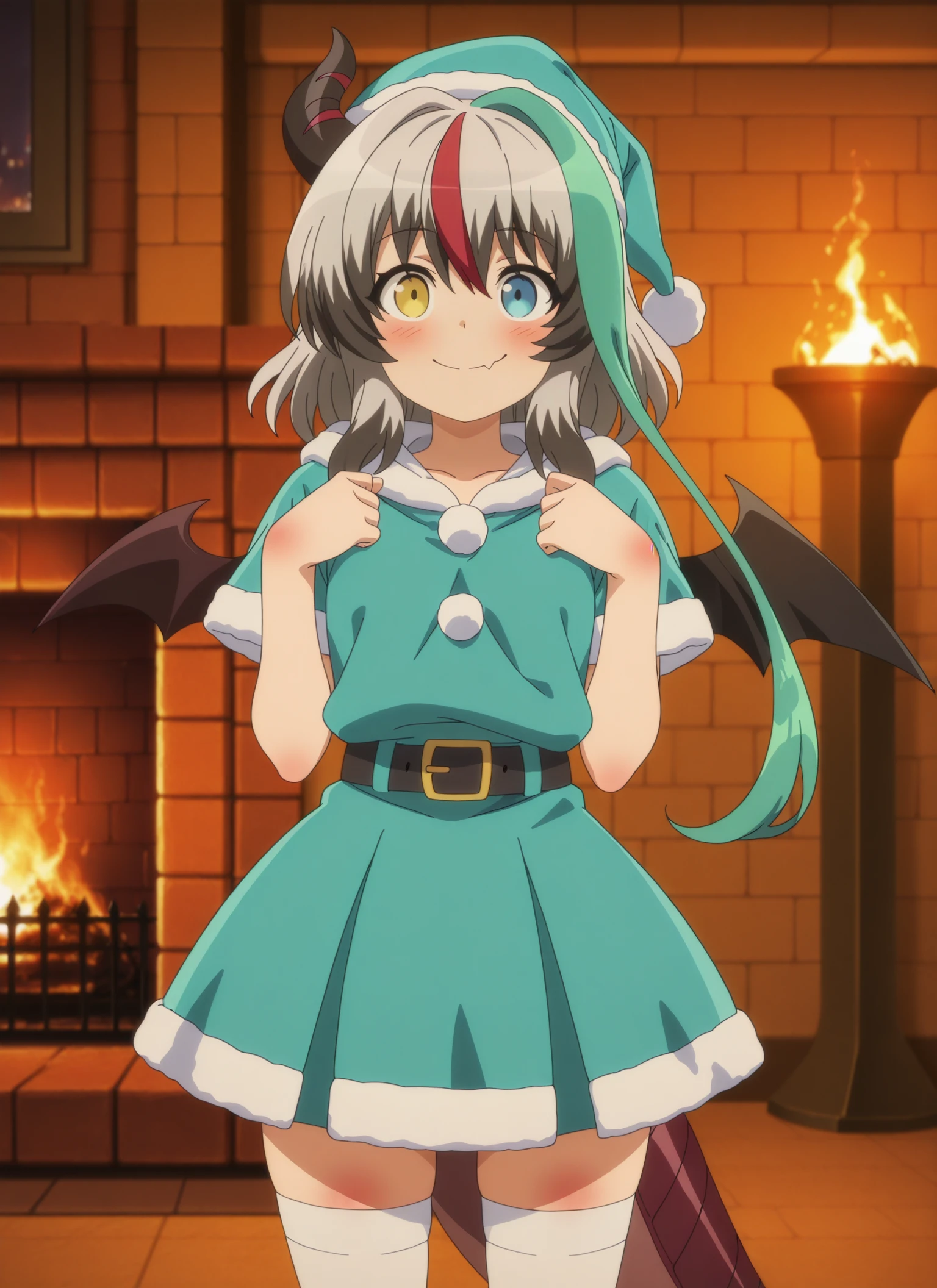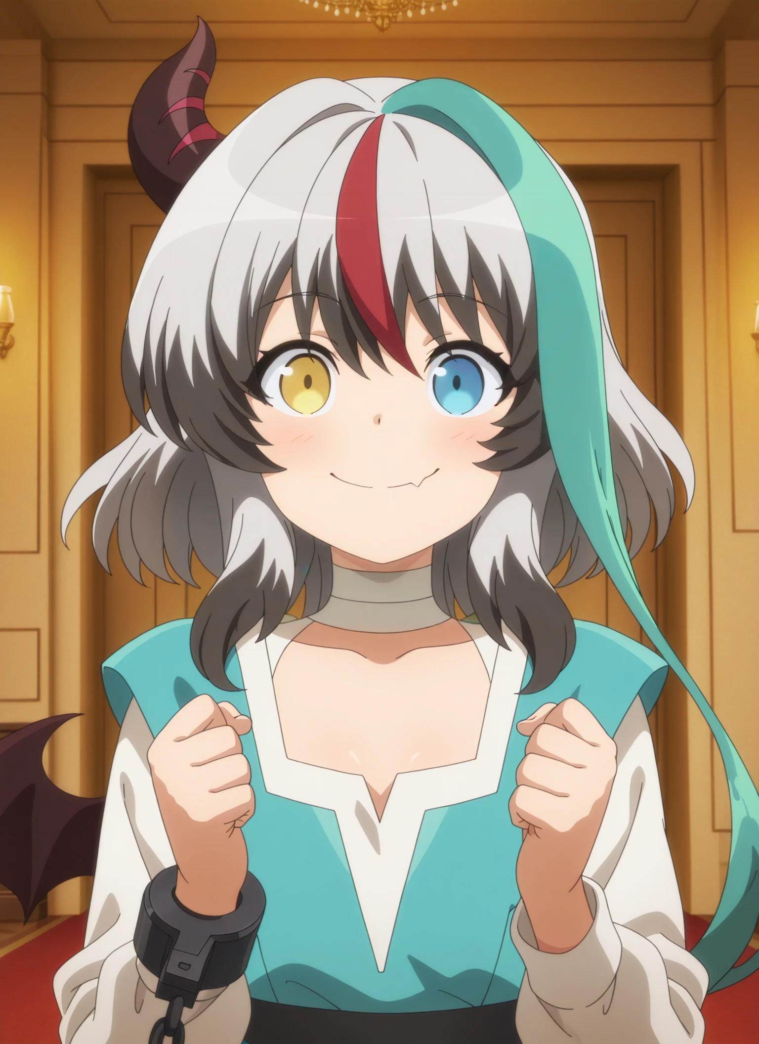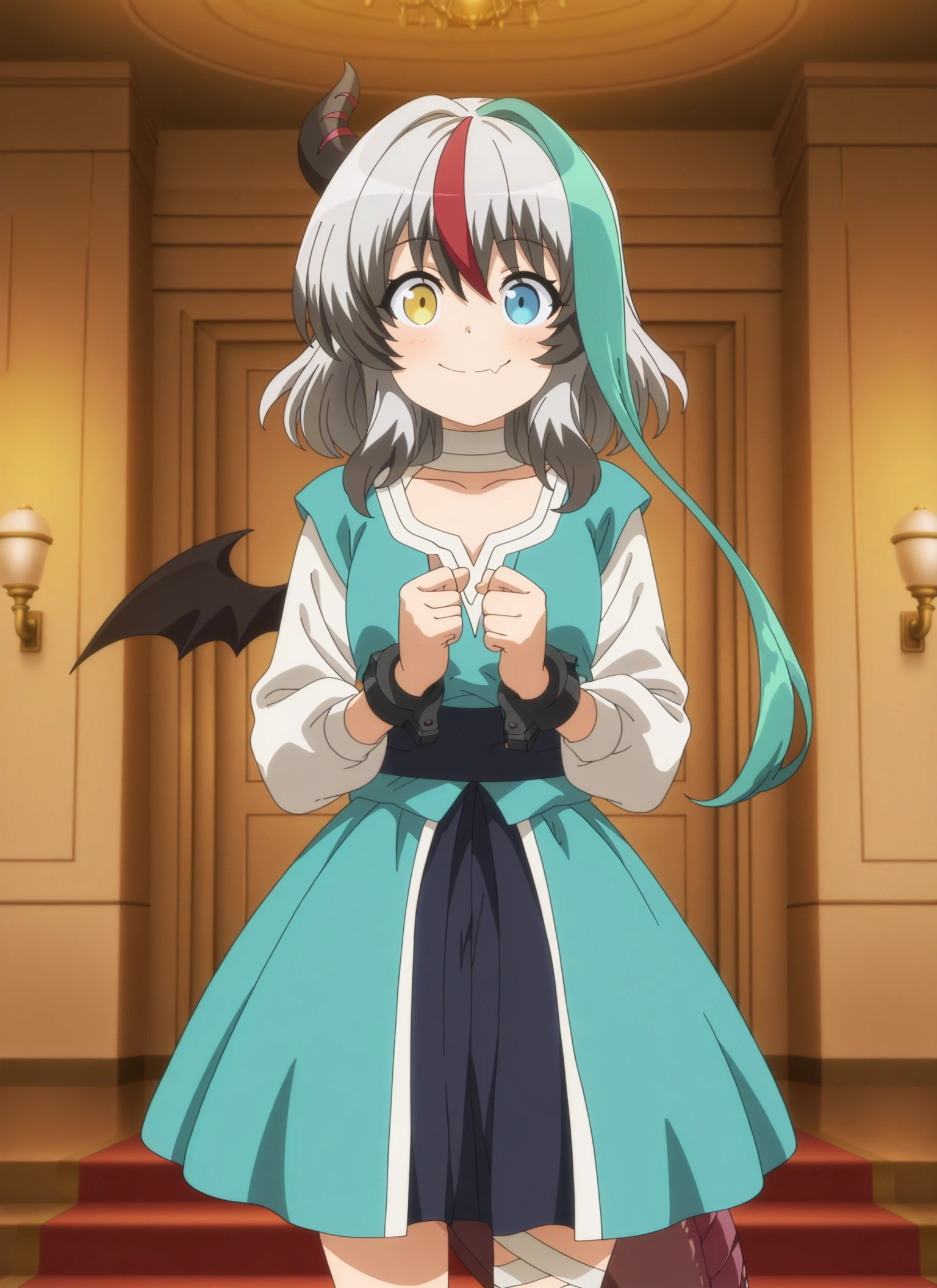 sentouin-hakenshimasu_rose, kid, heterochromia, yellow eyes, blue eyes, short hair, multicolored hair, grey hair, aqua streak, red streak, dark gray hair tips, single horn, single bat wing, dragon tail, skin fang,