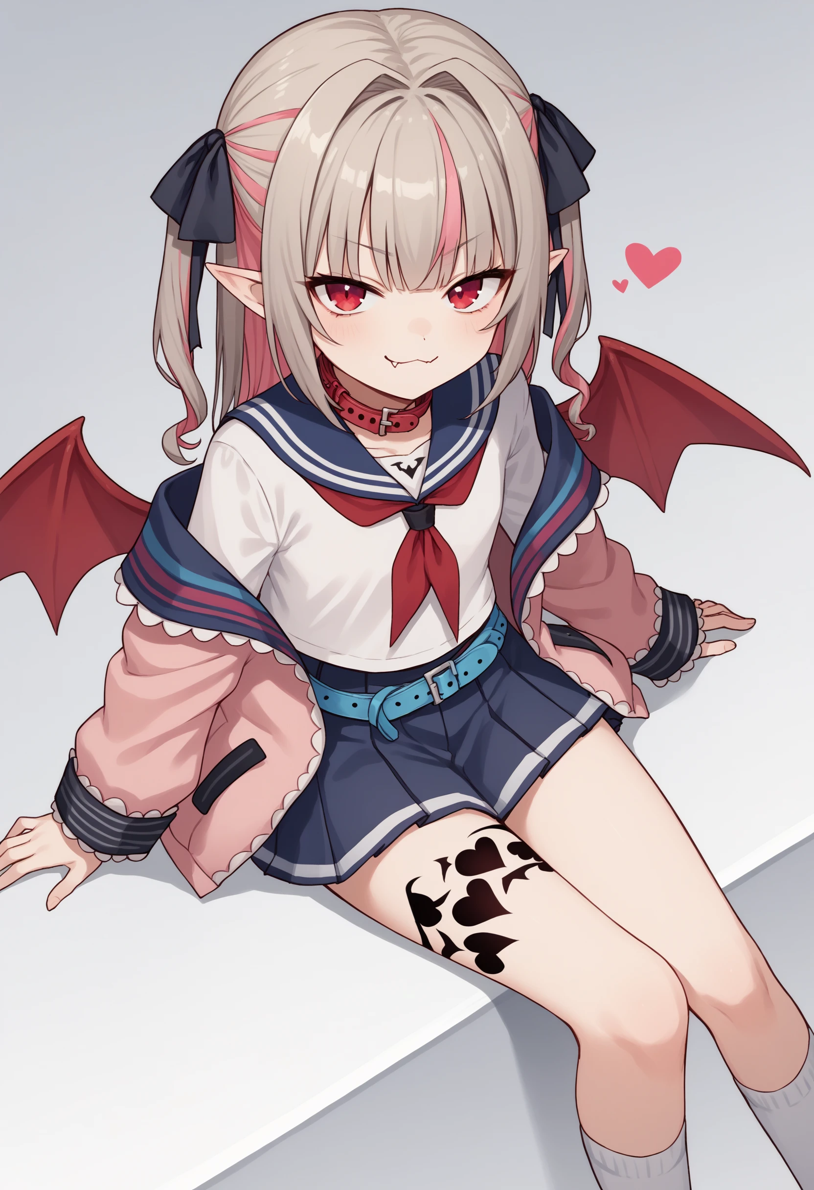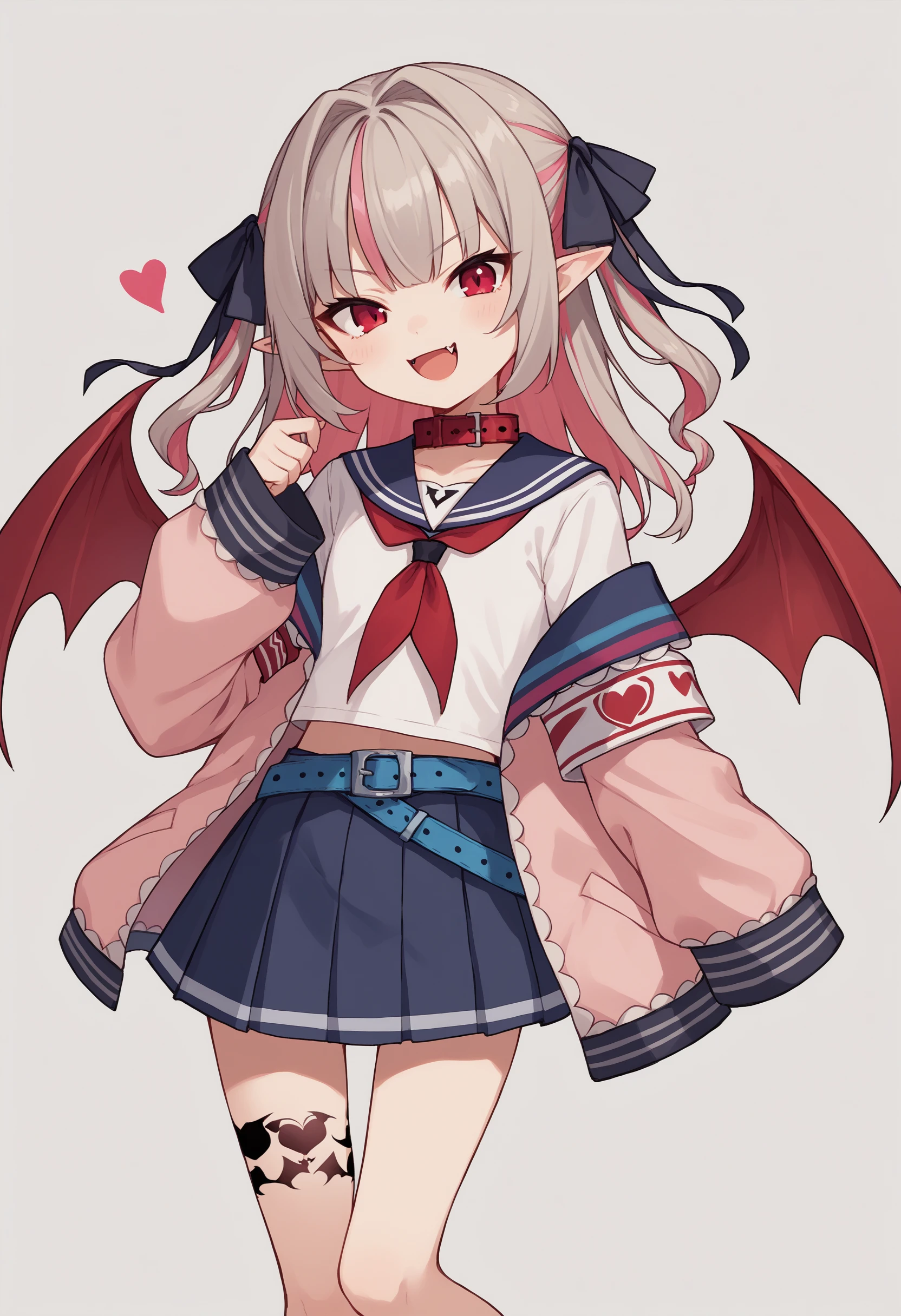 mr1, red eyes, pink hair, grey hair, two-tone hair, multicolored hair, streaked hair, hair intakes, two side up, pointy ears, fang, tattoo, leg tattoo, wings, red wings, demon wings, ribbon, hair ribbon, black ribbon