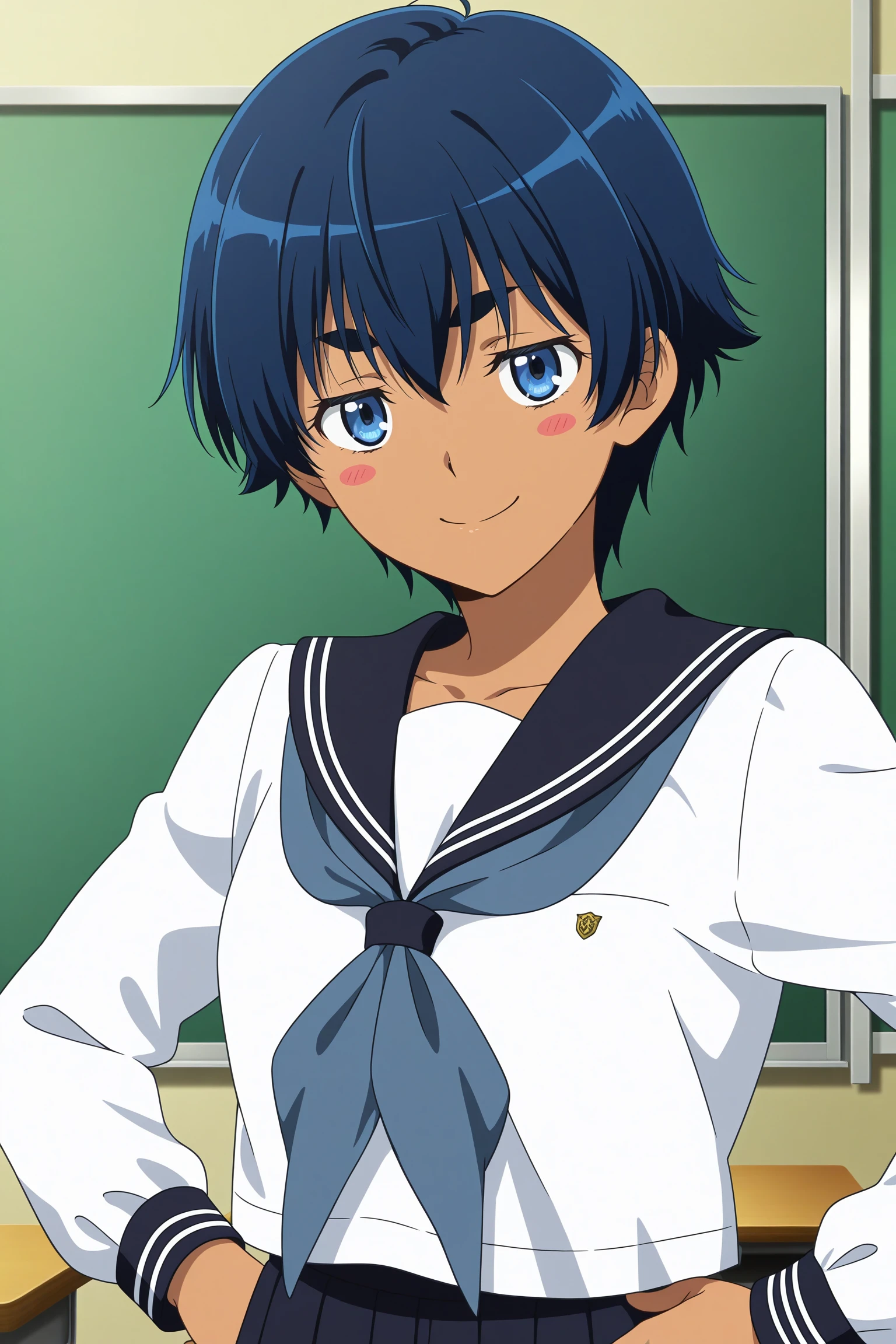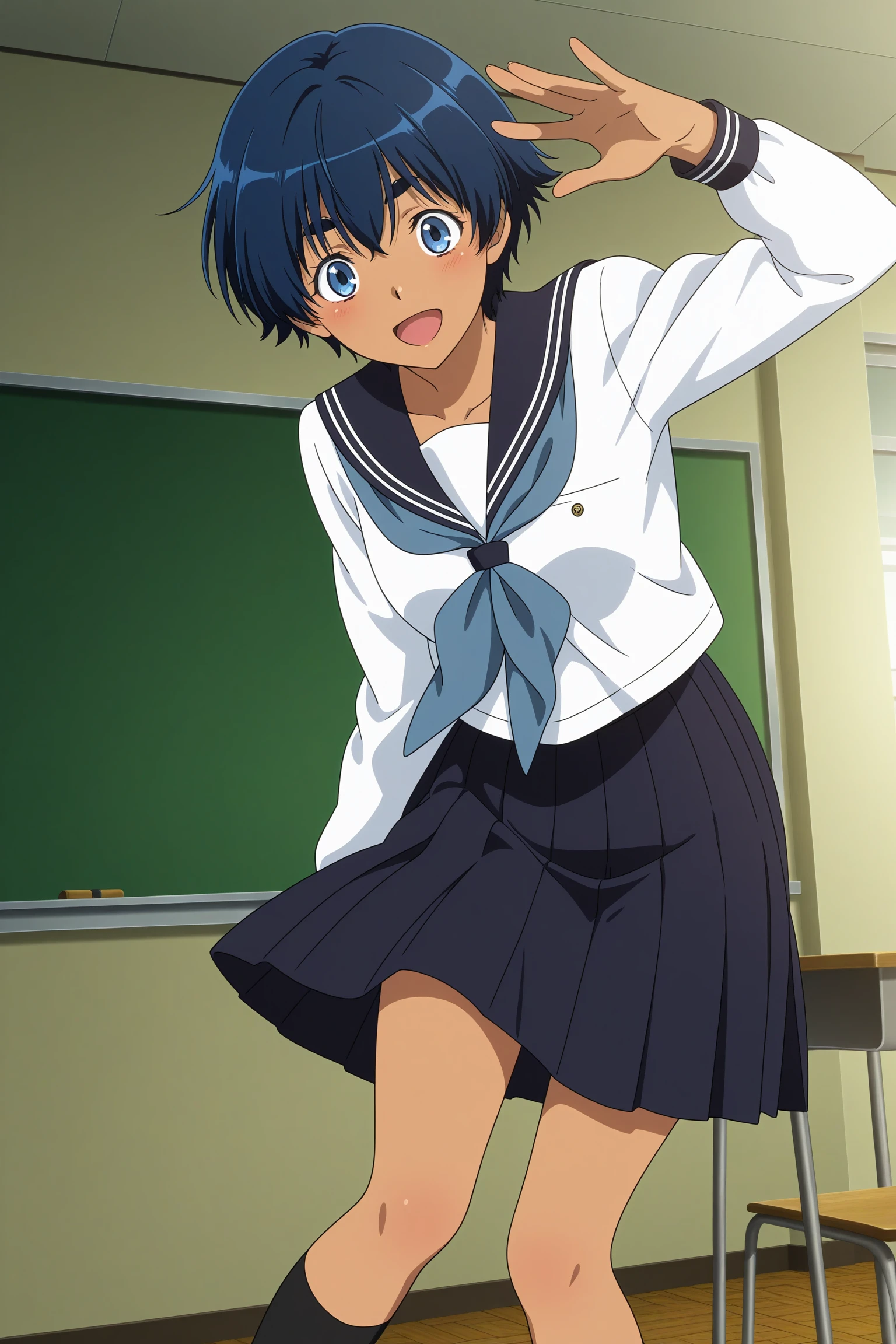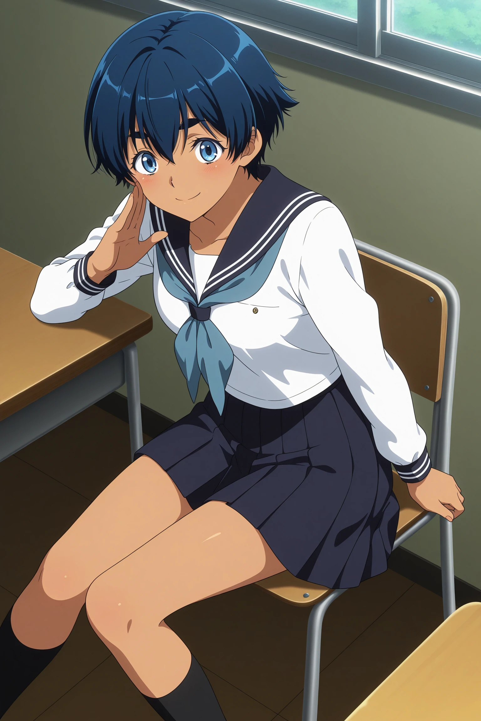 oohinata tomoko, short hair, blue hair, hair between eyes, thick eyebrows, blue eyes, dark-skinned female, serafuku, long sleeves, white shirt, blue sailor collar, blue neckerchief, blue skirt, pleated skirt, black socks, short socksDescription