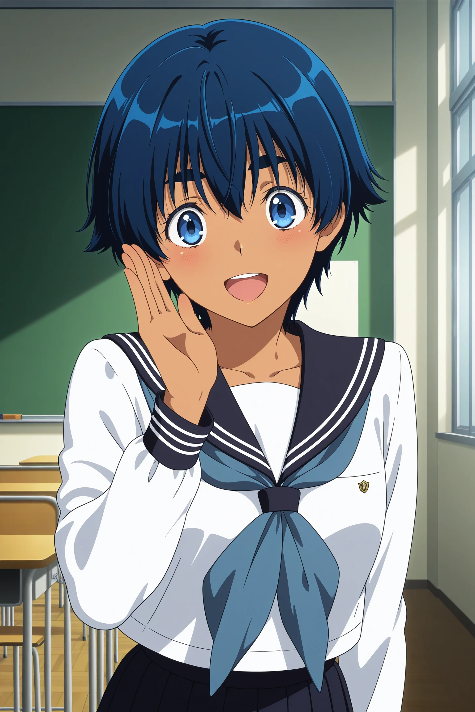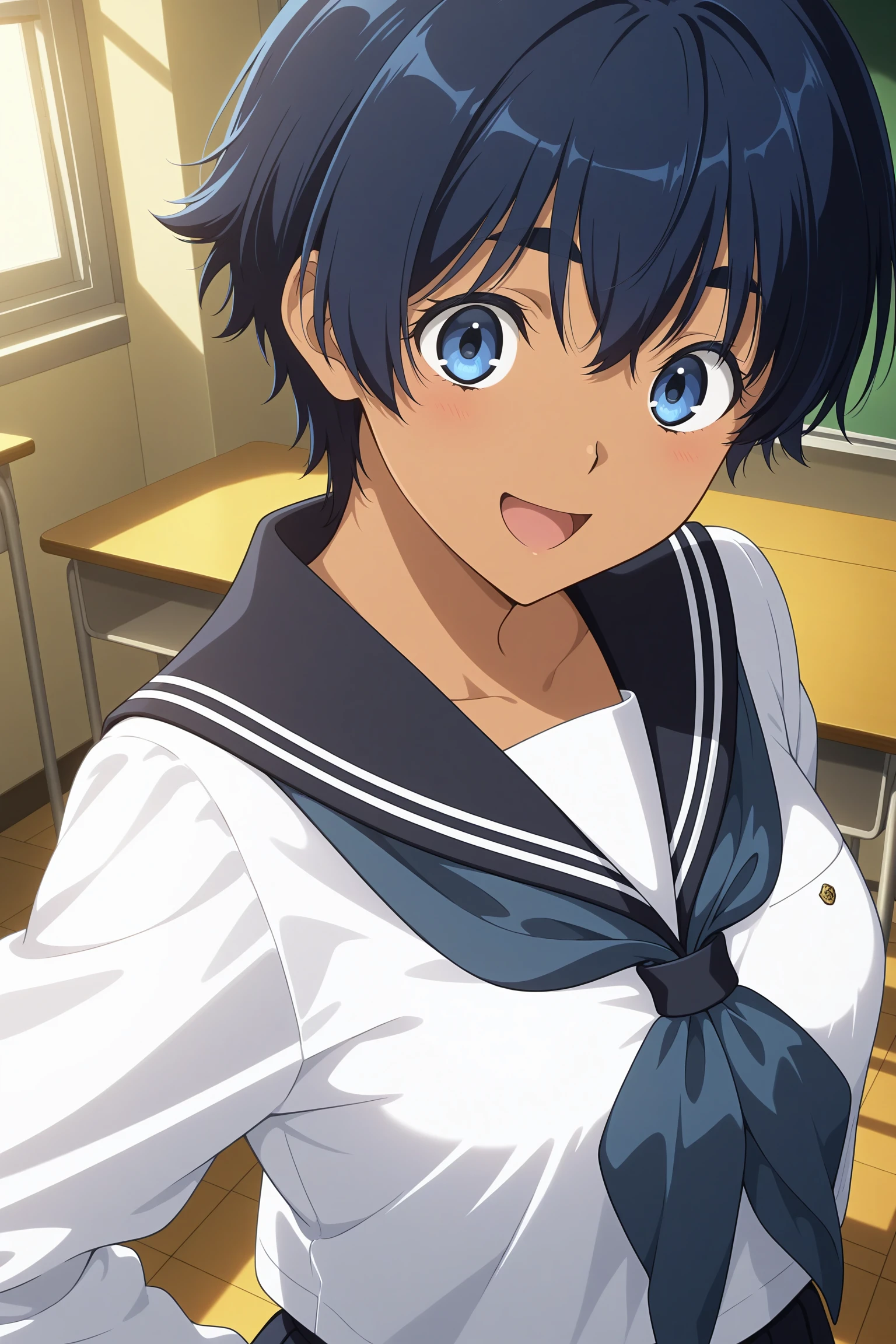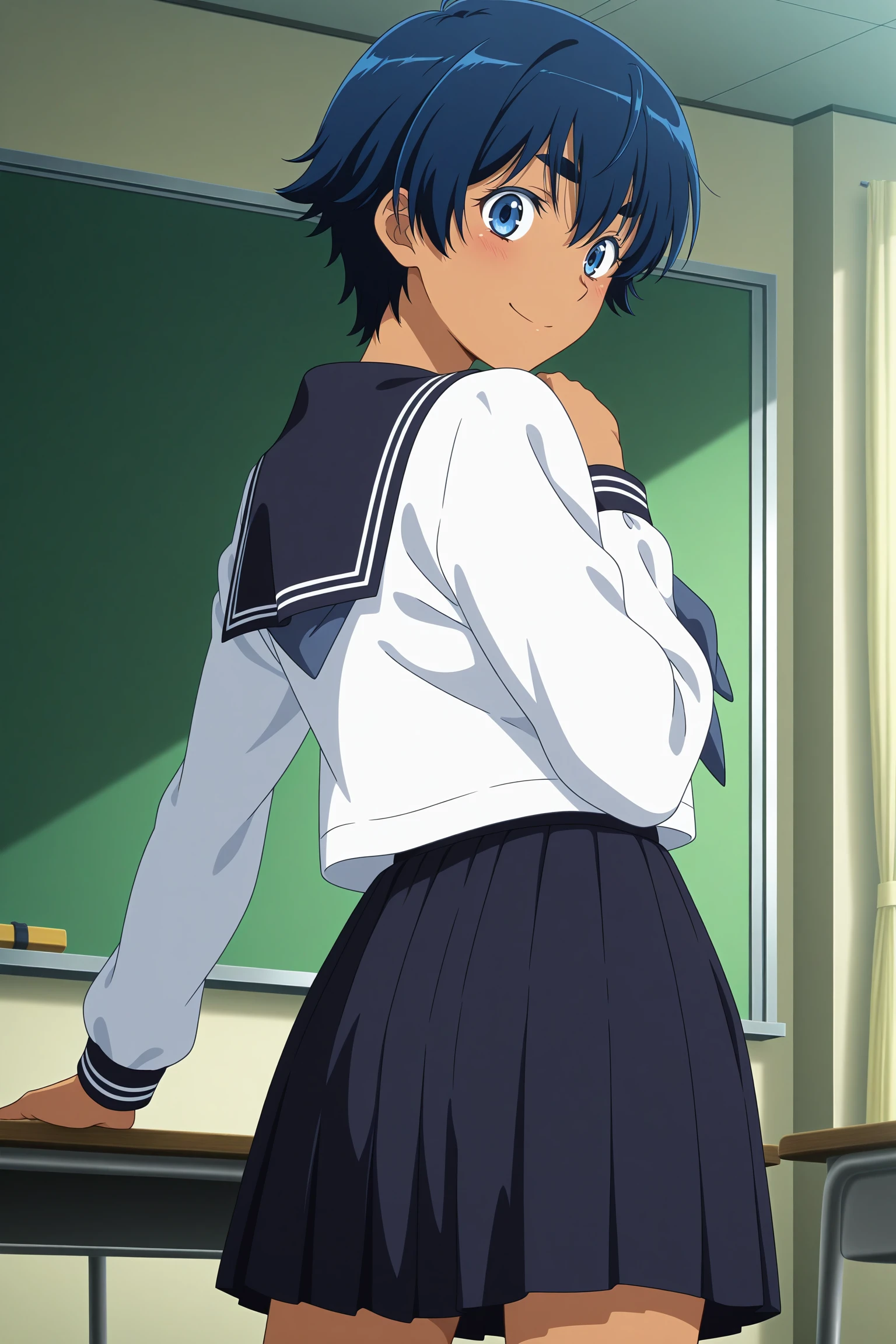 oohinata tomoko, short hair, blue hair, hair between eyes, thick eyebrows, blue eyes, dark-skinned female, serafuku, long sleeves, white shirt, blue sailor collar, blue neckerchief, blue skirt, pleated skirt, black socks, short socksDescription