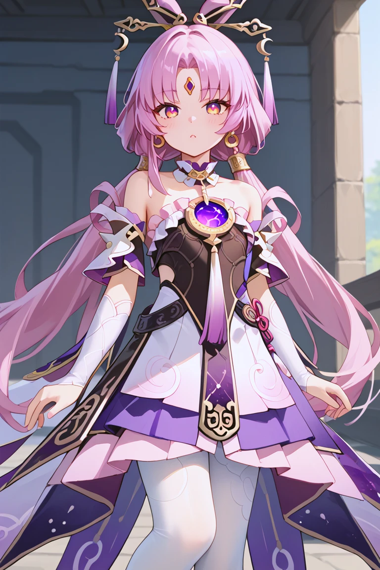 FuxuanBren, long hair, hair ornament, 1girl, pink hair, yellow eyes, parted bangs, twintails, very long hair, forehead mark, facial mark, forehead jewel, petite, slim, small breasts