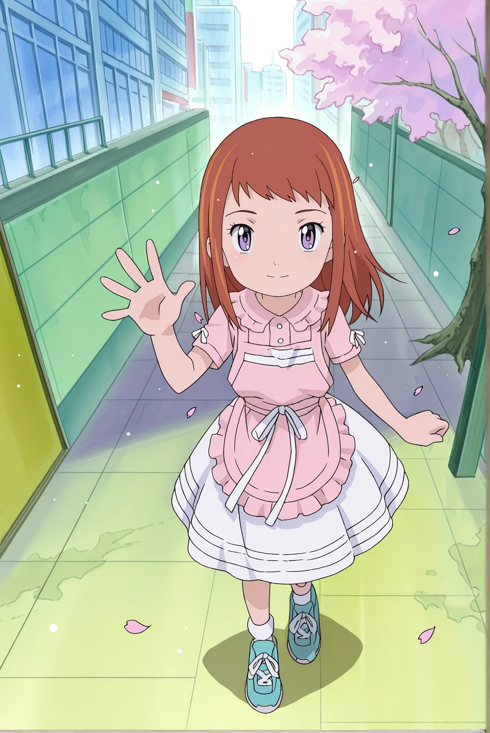 maru, dress, 1girl, purple eyes, orange hair, medium hair, pink and white dress, pink apron, white ribbon, blue shoes