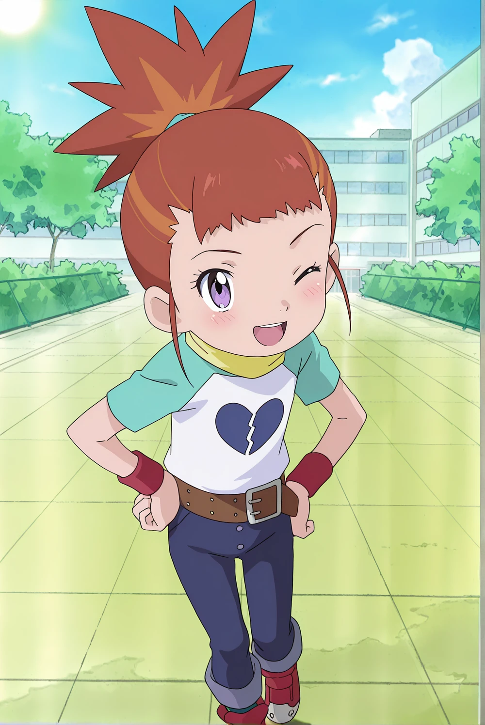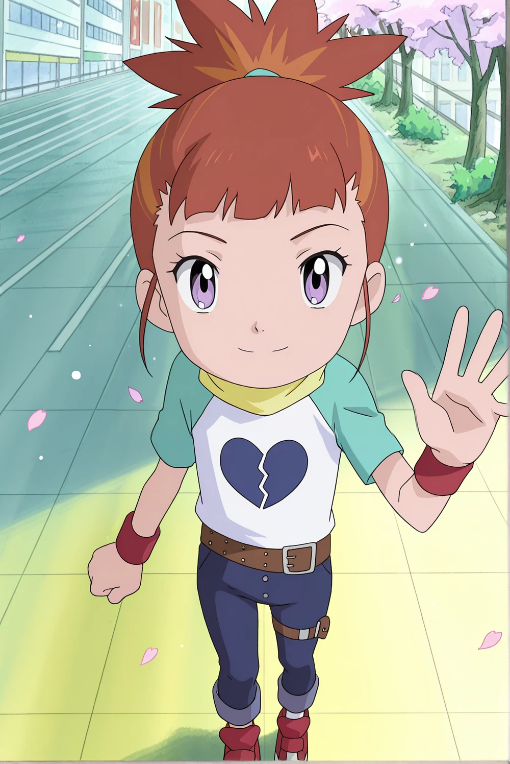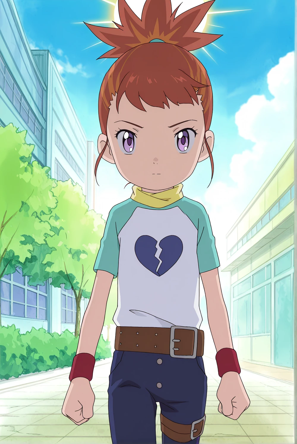 Outfit: maru, casual, 1girl, purple eyes, orange hair, high ponytail, short sleeves, blue and white shirt, broken heart print, yellow scarf, belt, blue pants, wristband, thigh strap, red footwear