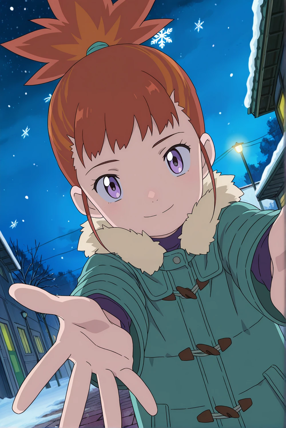 maru, 1girl, purple eyes, orange hair, high ponytail,