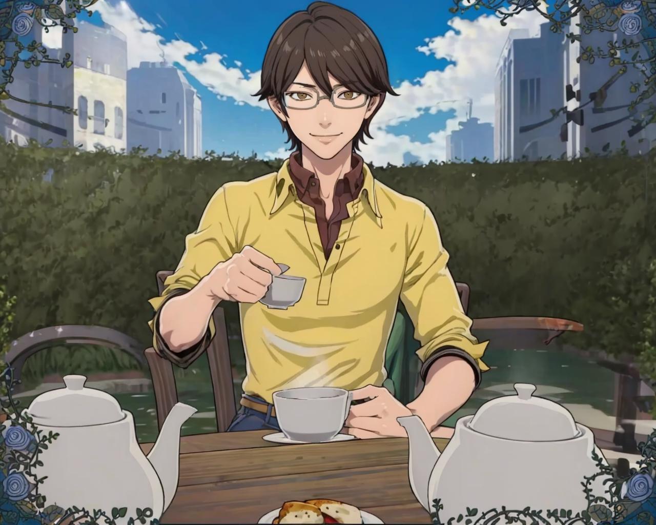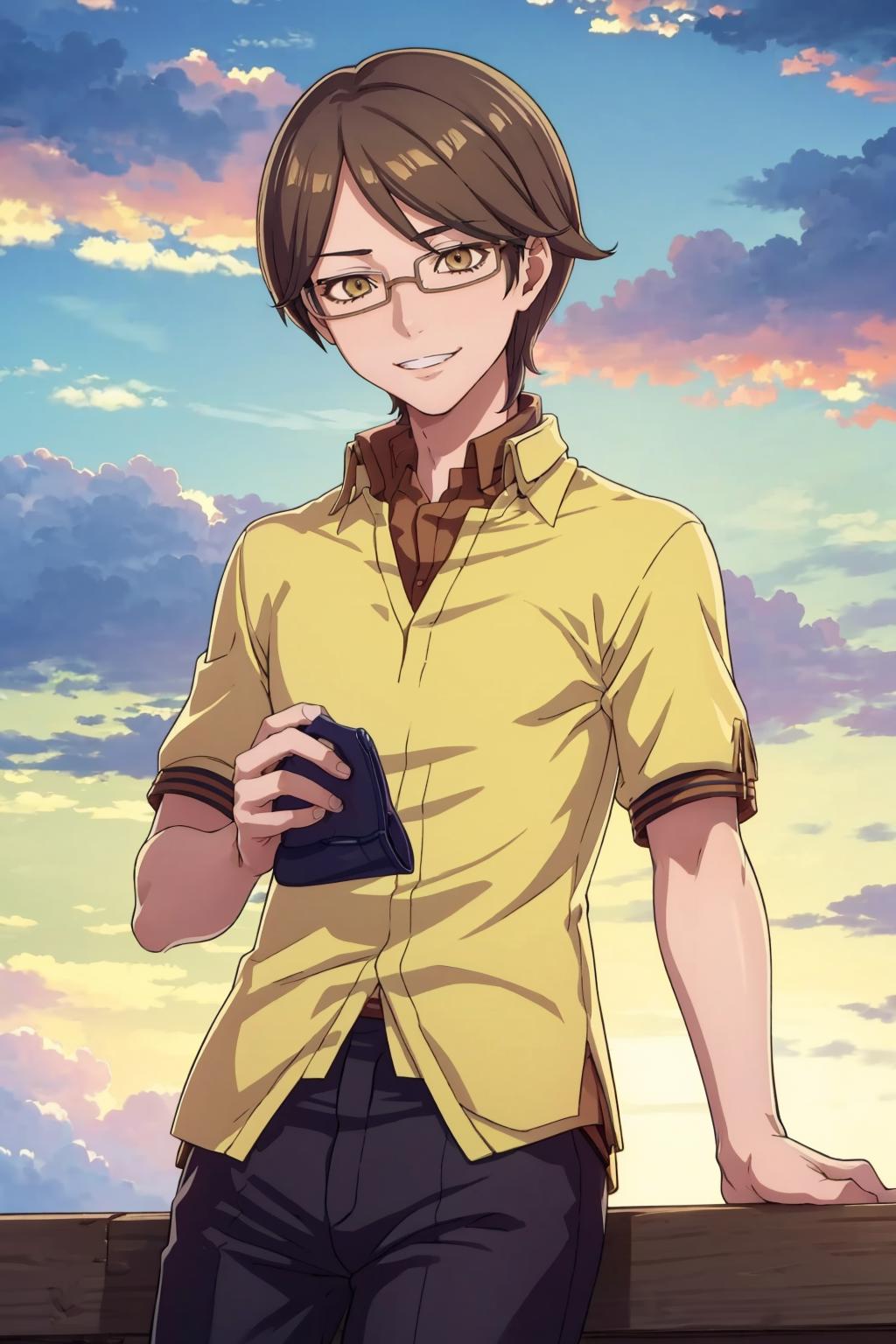 For his normal outfit its "yellow shirt, black pants, glasses"