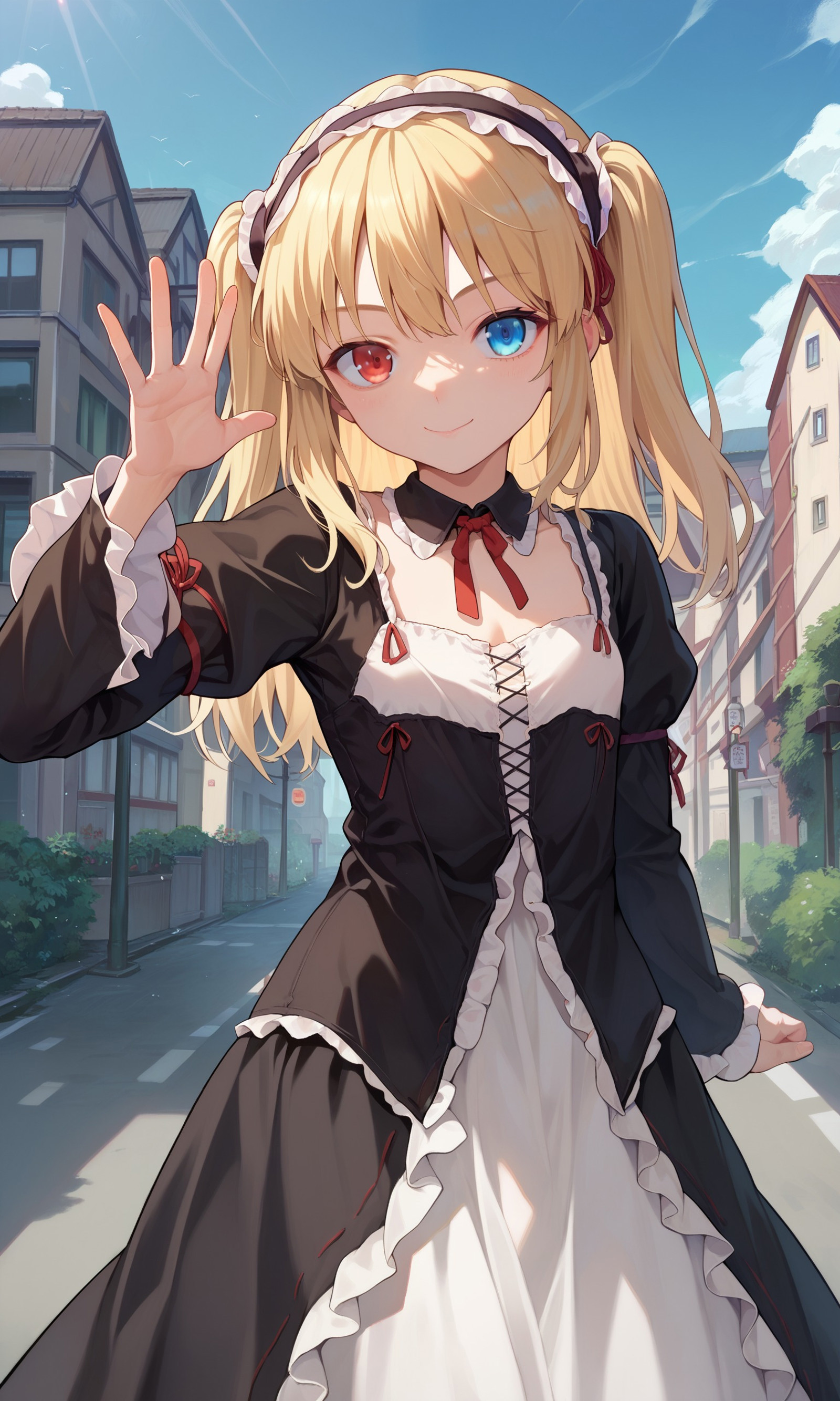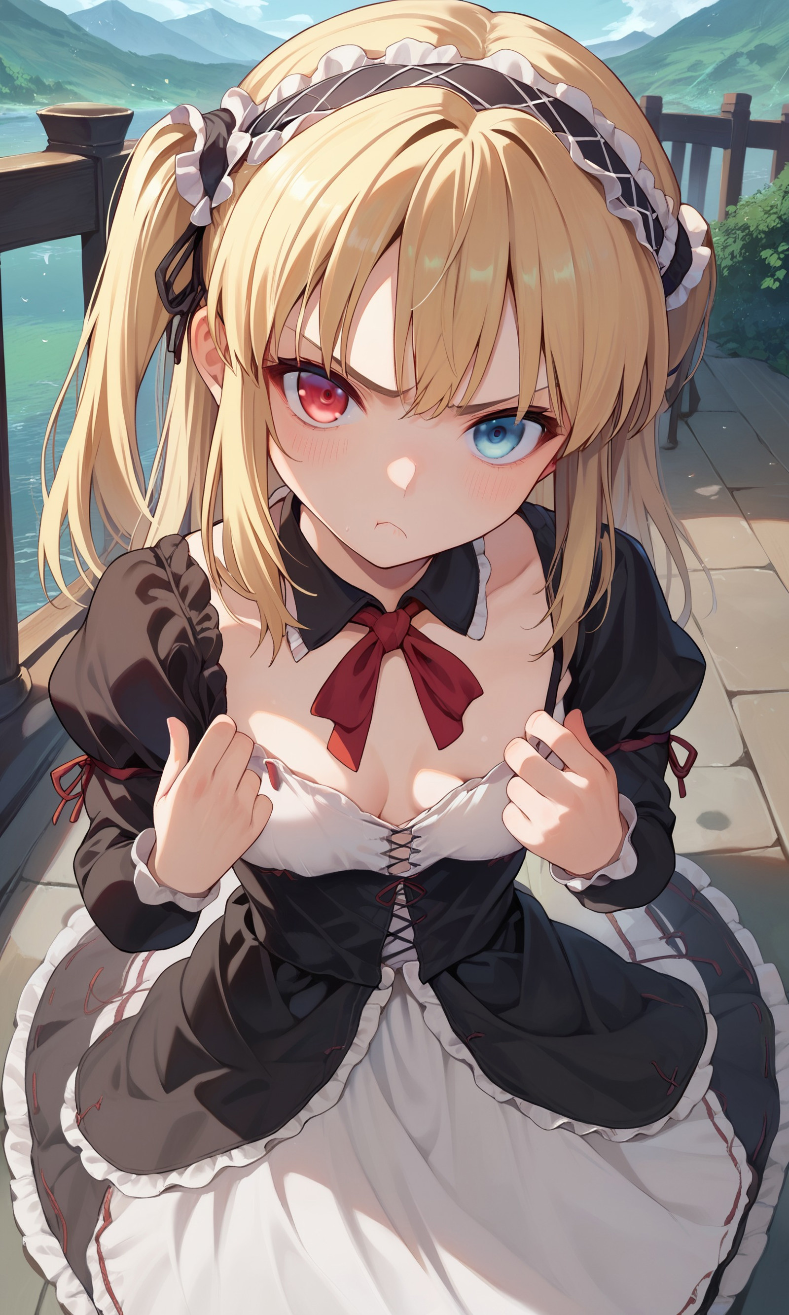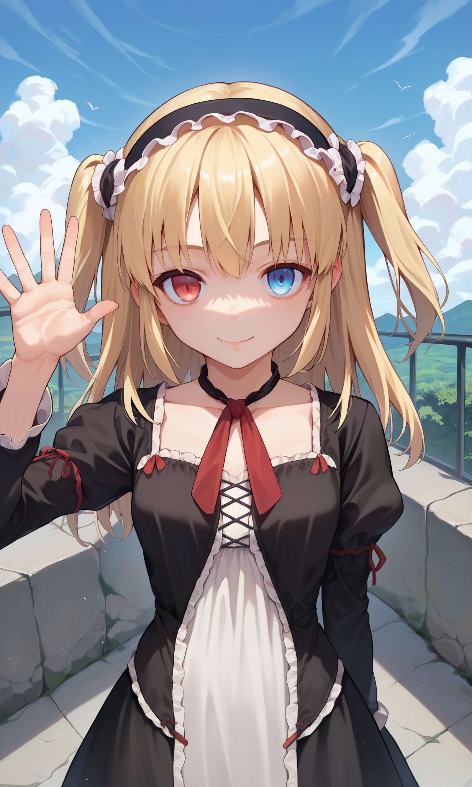 hasegawa_kobato, heterochromia, blue eyes, red eyes, blonde hair, two side up, hairband,
