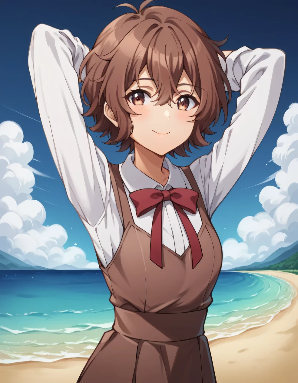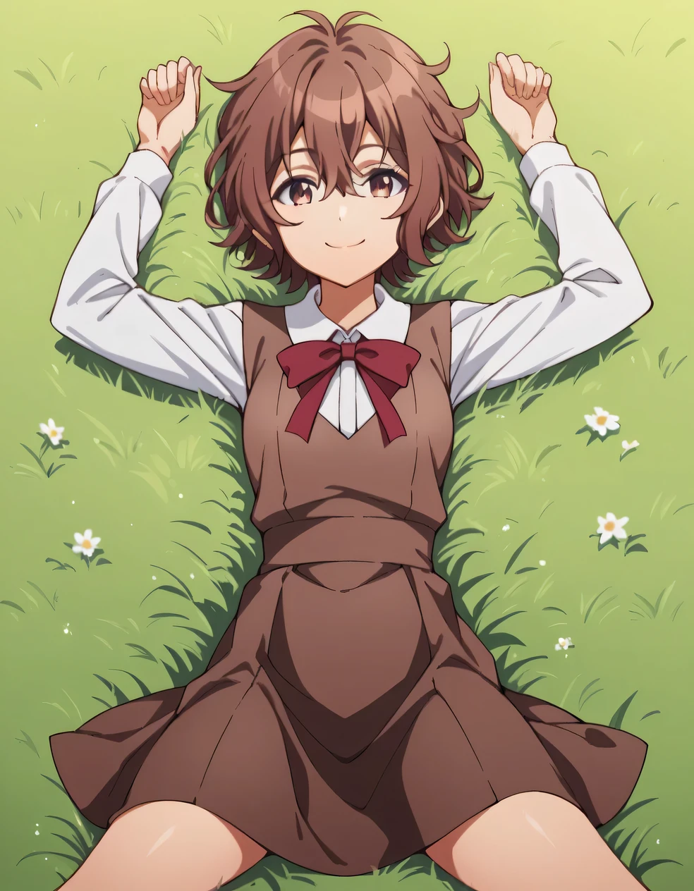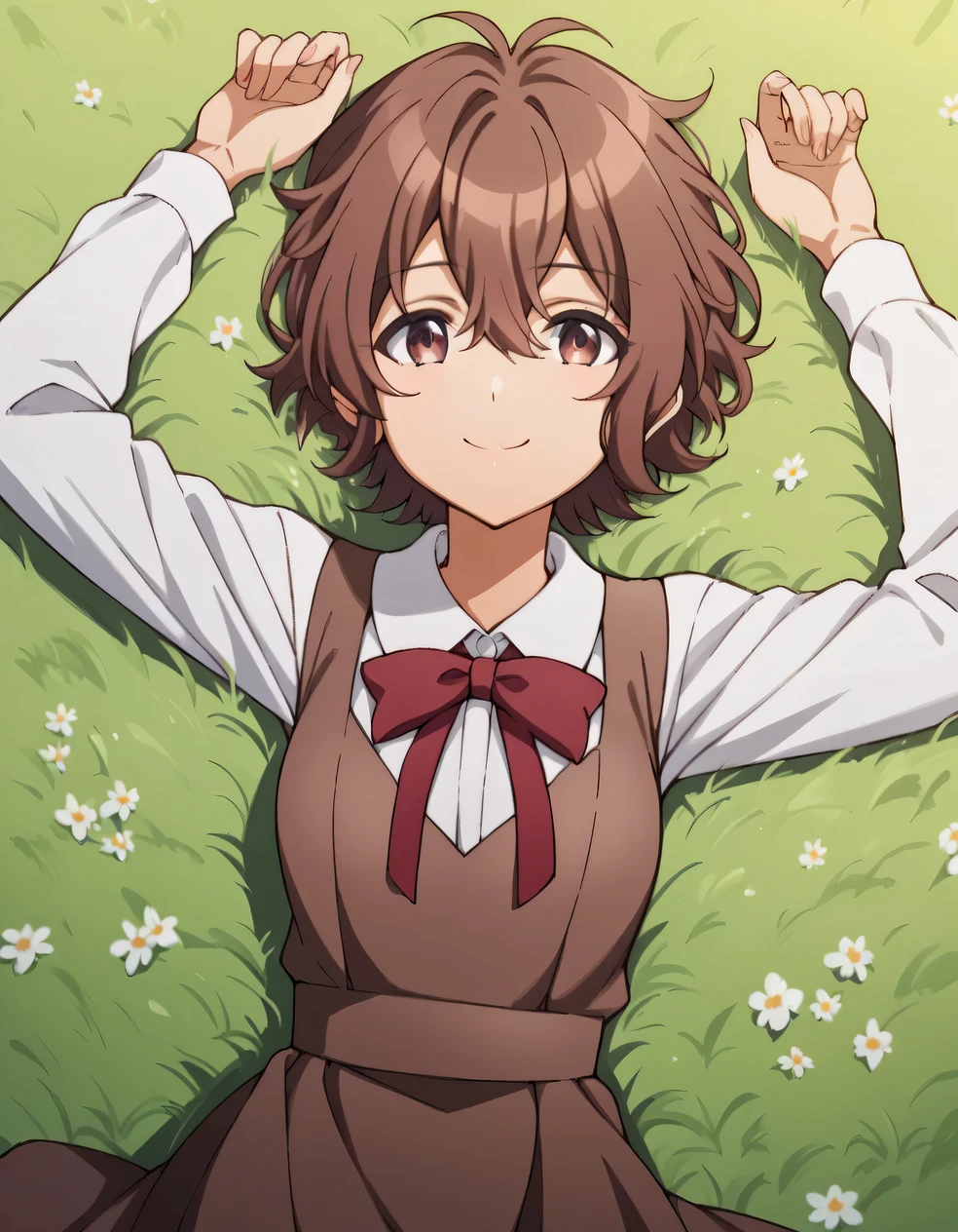 shirt, long sleeves, dress, bow, school uniform, white shirt, collared shirt, red bow, neck ribbon, brown dress