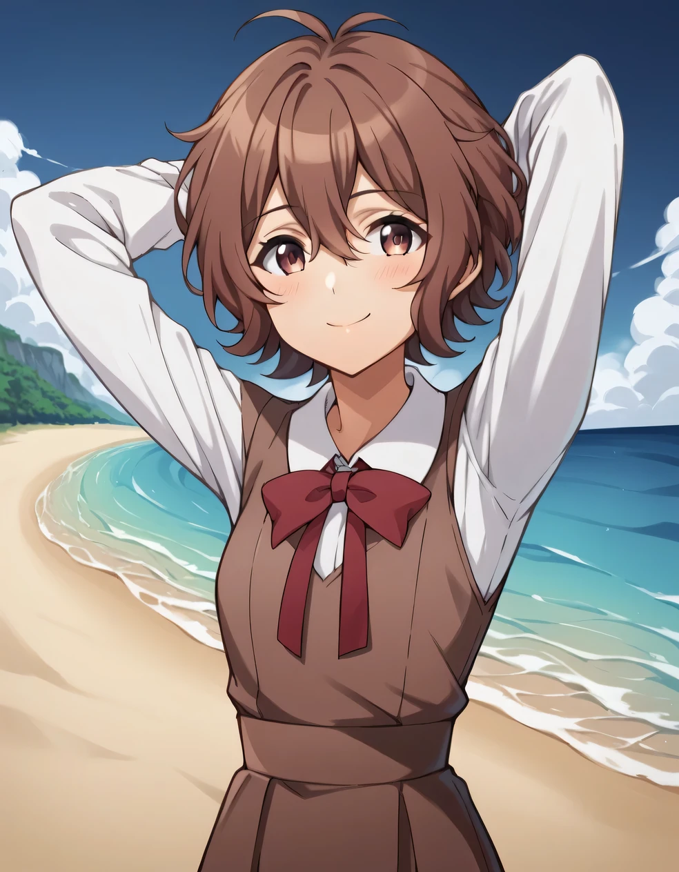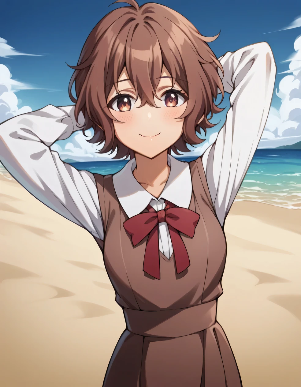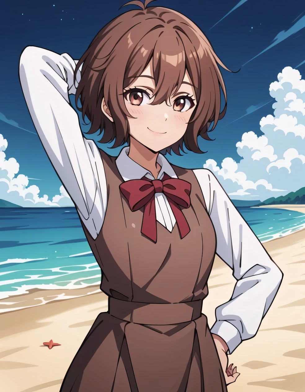 shirt, long sleeves, dress, bow, school uniform, white shirt, collared shirt, red bow, neck ribbon, brown dress