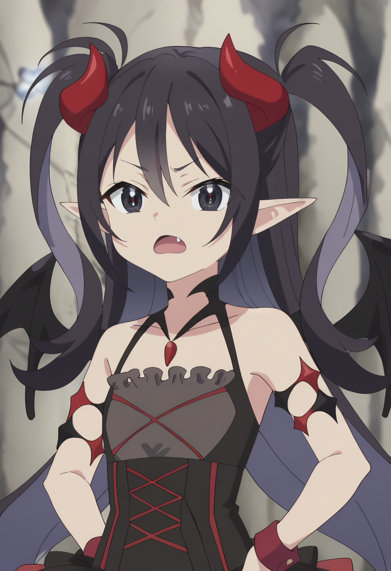 Luceria, 1girl, solo, long hair, pointy ears, black hair, demon girl, demon horns, demon wings, demon tail, two side up, black eyes, hair between eyes,