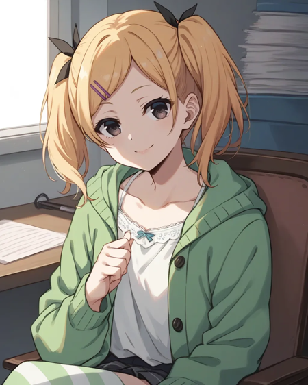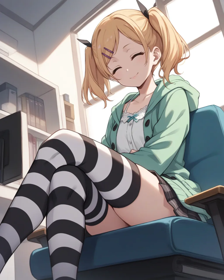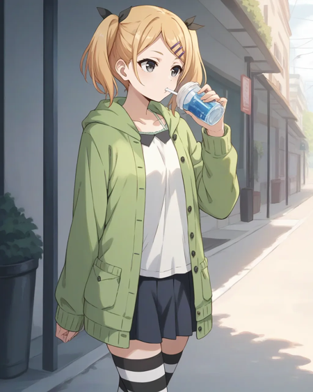 green cardigan,hoodie,white camisole,skirt,black and white striped thighhighs,