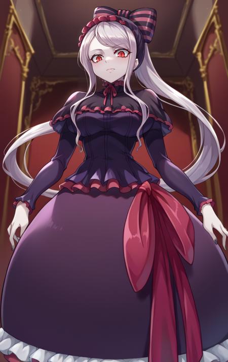 shalltearbloodfallenSDXL,1girl,long hair,red eyes,dress,bow,very long hair,ponytail,hair bow,frills,striped,frilled dress,pale skin,lolita fashion,striped bow,long dress,gothic lolita,vampire