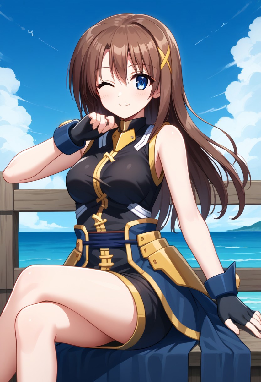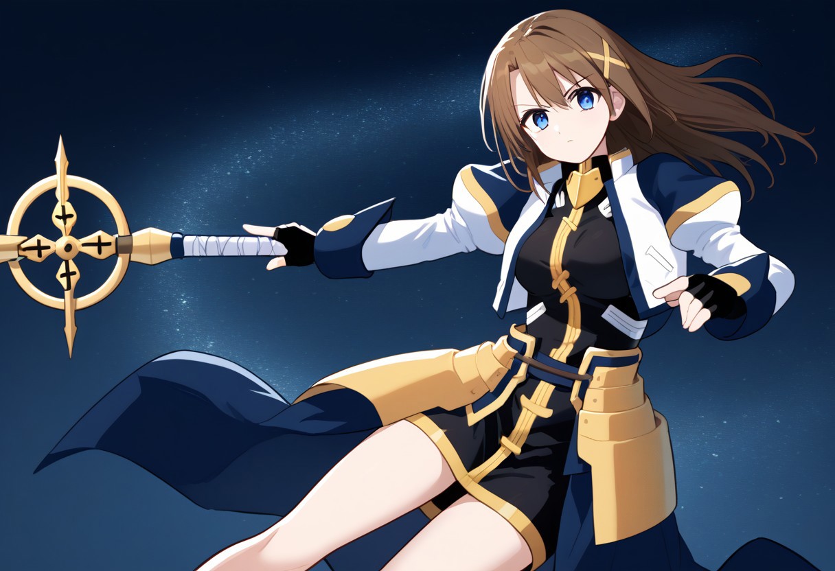 1girl, solo, HayateYagami, brown hair, short hair, x hair ornament, blue eyes, black dress with gold trim, short dress, fingerless gloves, bare shoulders, bare legs, corset