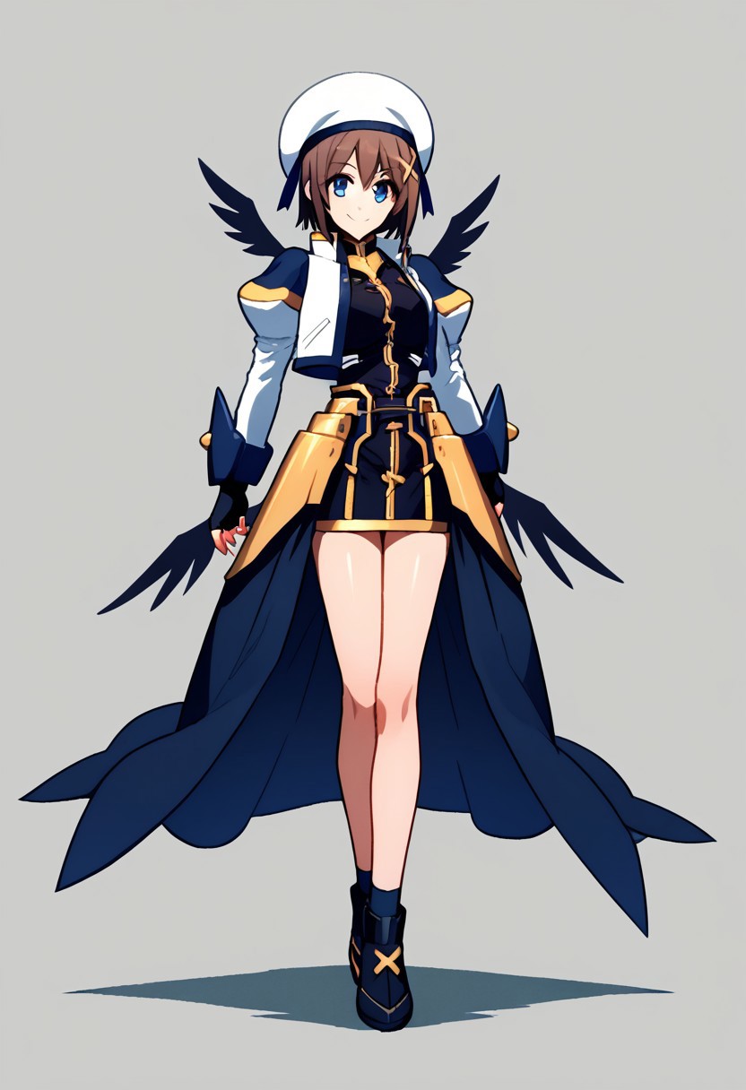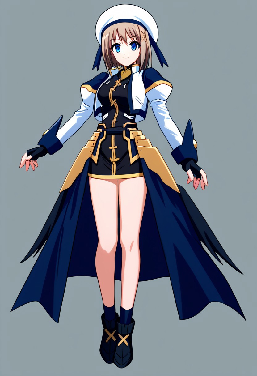 black dress with gold trim, short dress, fingerless gloves, faulds, puffy sleeves, juliet sleeves, cropped jacket, open jacket, waist cape, white and navy blue jacket, waist cape, white beret, navy blue ribbon, bare legs, black shoes with gold cross, black socks