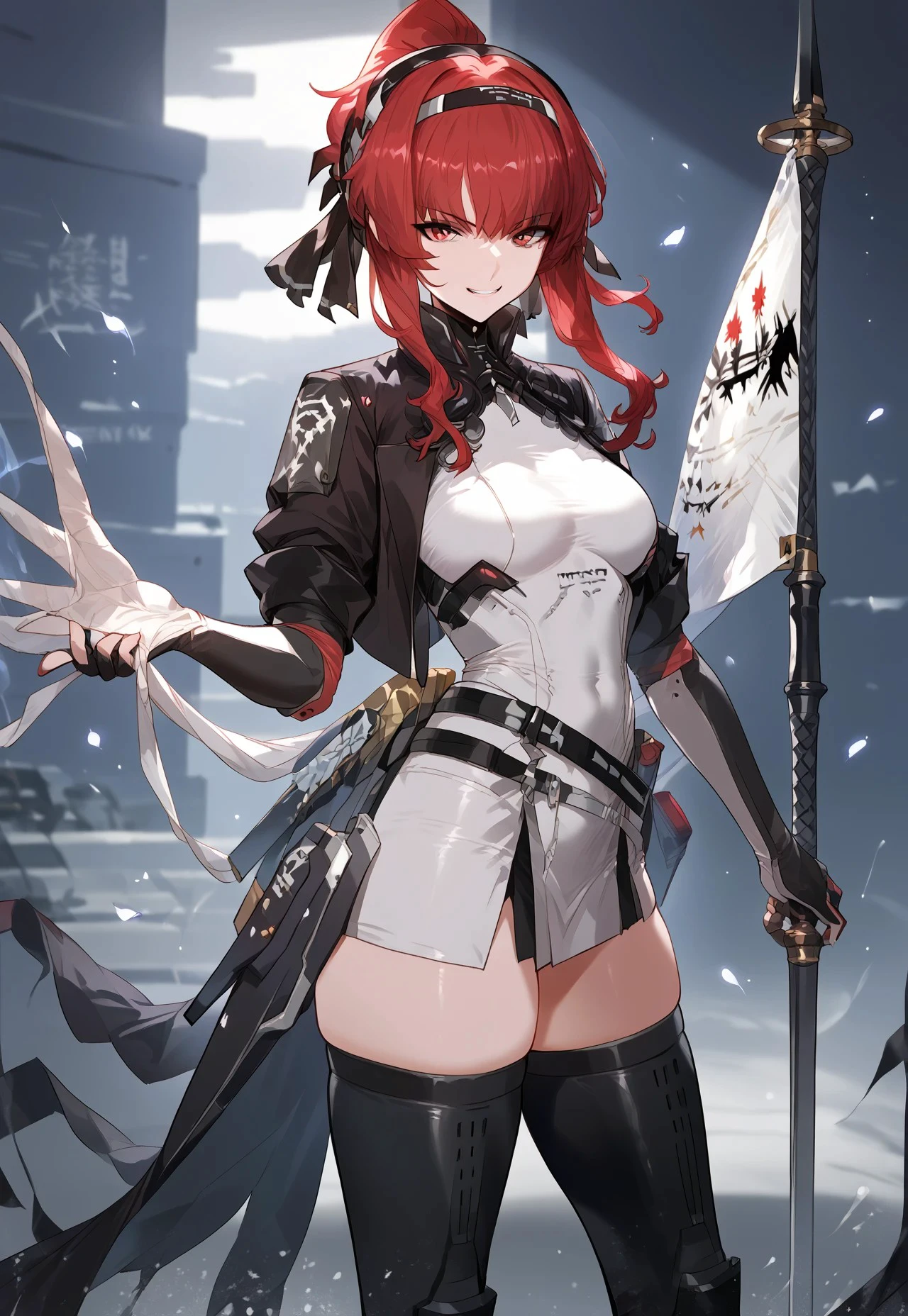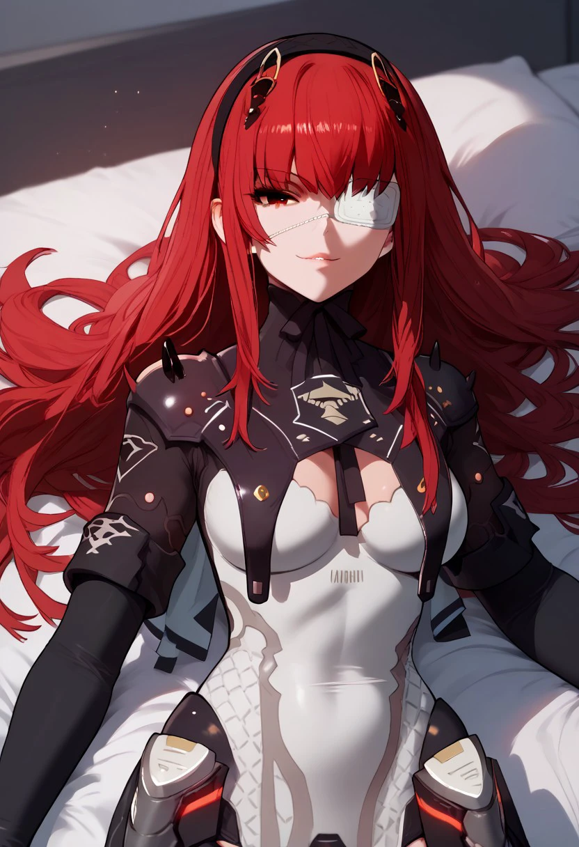 Garnet, red eyes, red hair, long hair, Mole under eye, Garnet clothes, headgear, headband, mech waist wings, thigh boots