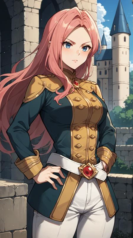 long hair, pink hair, blue eyes, teal and gold military uniform, white pants, white pelt