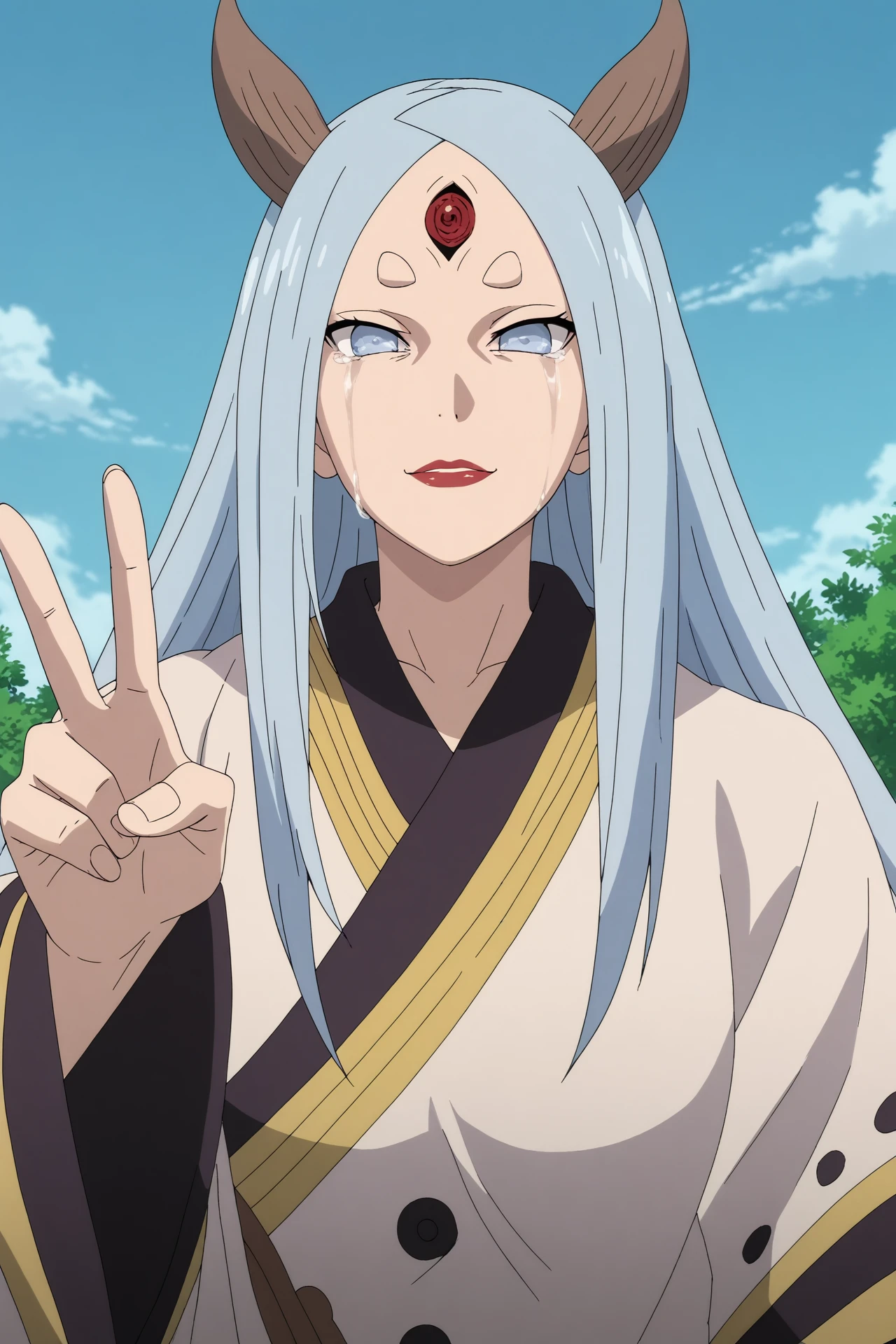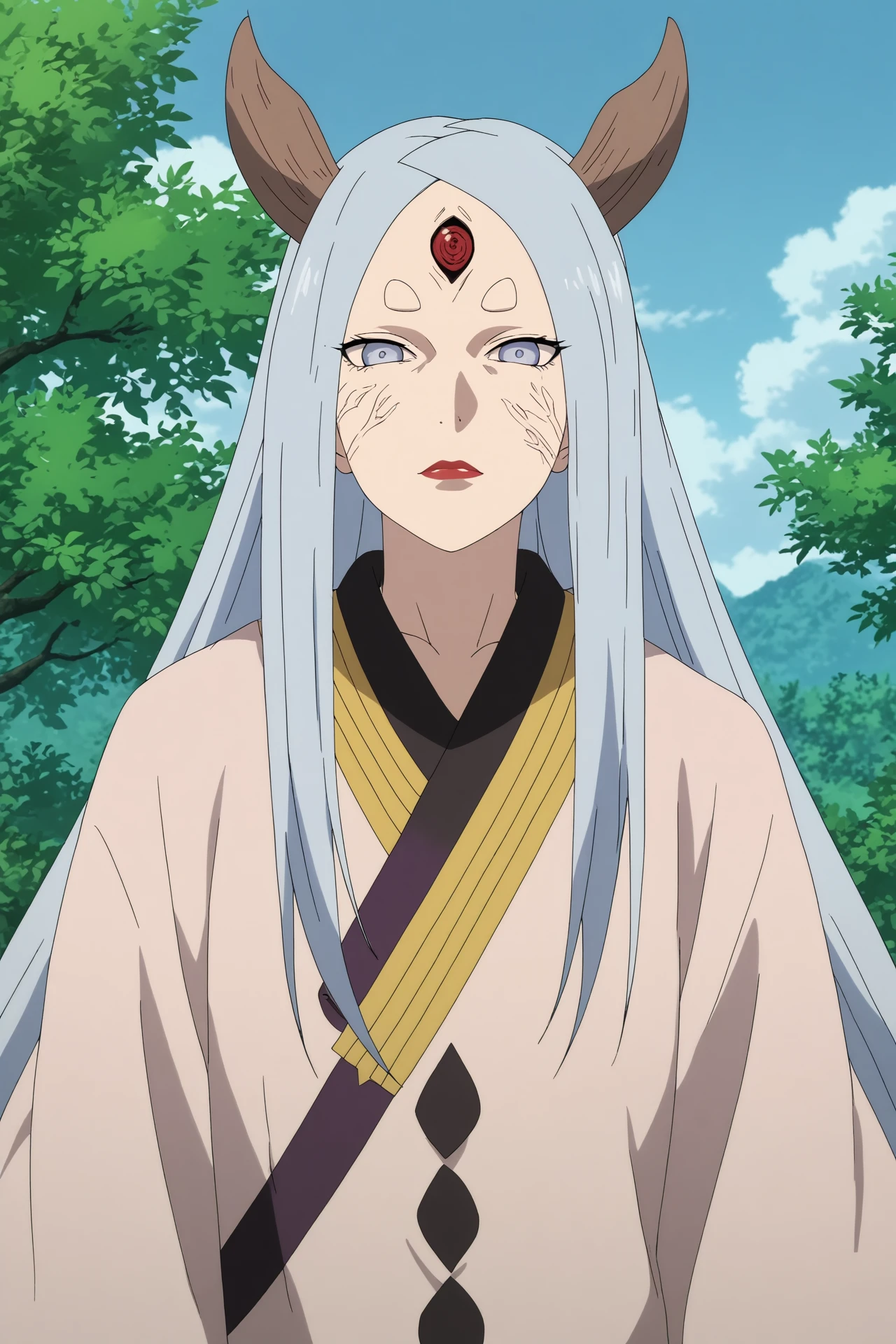 kaguya,1girl,solo,mature,long hair,horns,japanese_clothes, white kimono,makeup, looking_at_viewer, lipstick, third_eye, facial_mark,forehead_mark, wide_sleeves,pale skin,no_pupils
