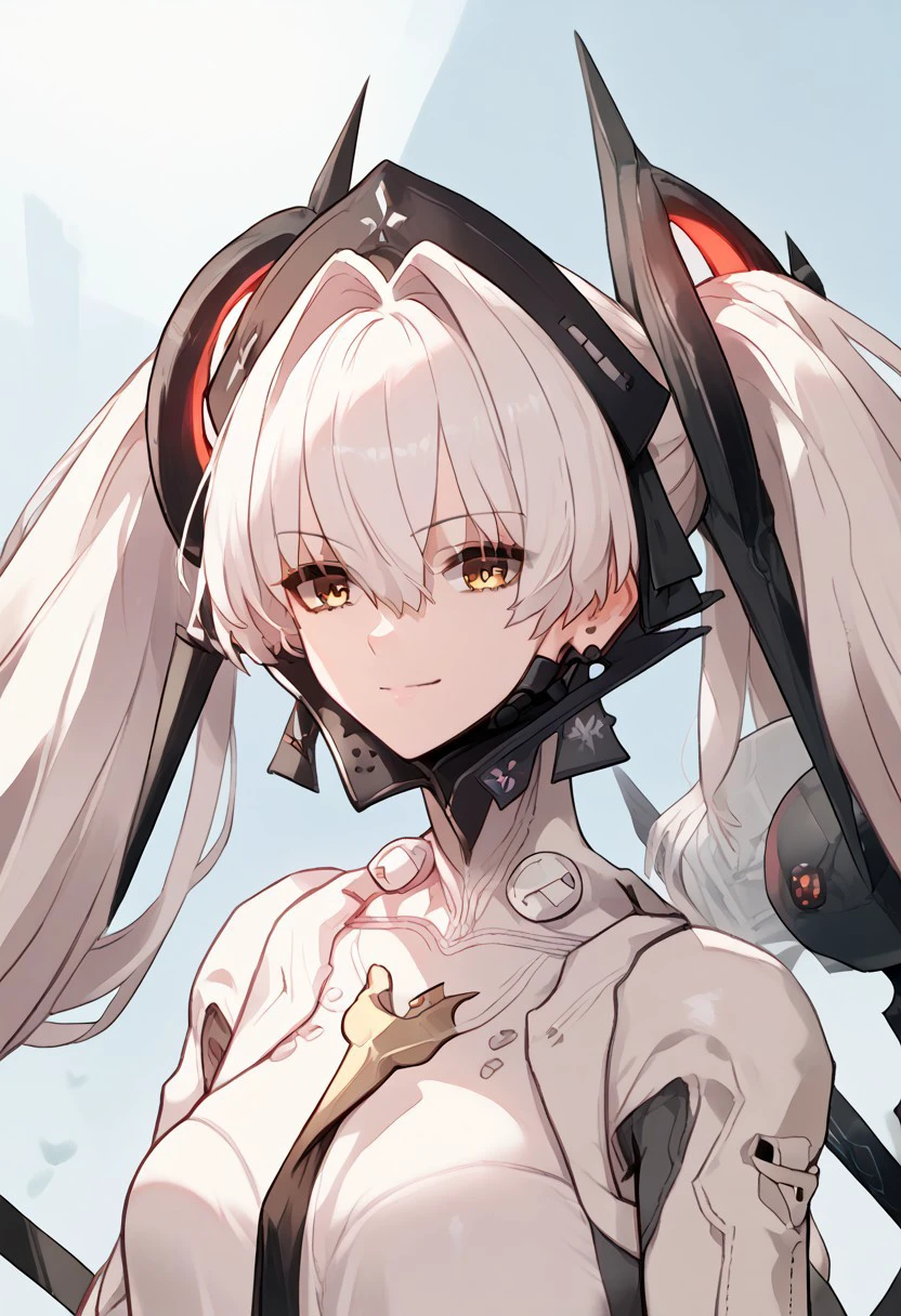Laurel, amber eyes, star-shaped irises, white hair, long hair, twintails, Character clothes, headgear
