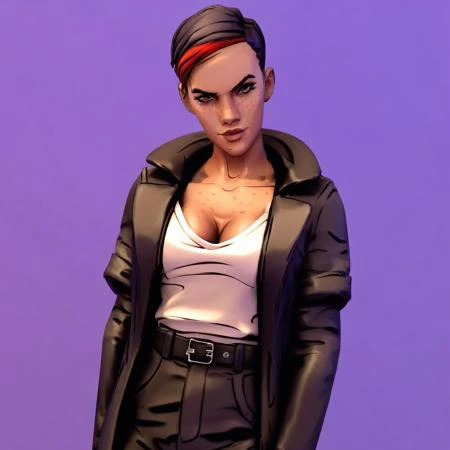 1girl, solo, multicolored hair, belt, long coat, white shirt, brown eyes, freckles, white shirt, black jacket, undercut, boots, cleavage,
